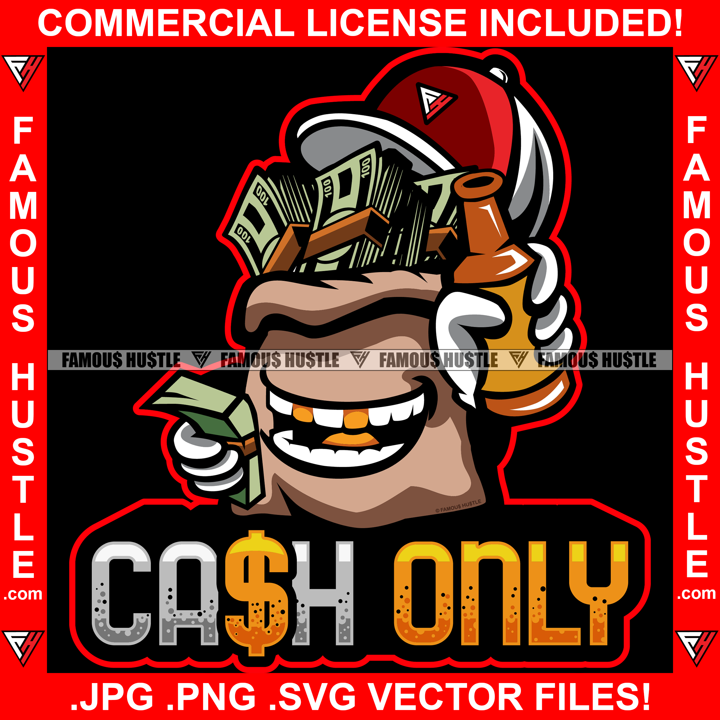 Cash Only Money Bag Cartoon Character Cap Bottle Bundles Gold Teeth Hip Hop Rap Rapper Plug Trap Street Hood Ghetto Swag Thug Hustler Hustling Famous Hustle Baller Trapper Quote Art Graphic Design Logo T-Shirt Print Printing JPG PNG SVG Vector Cut File