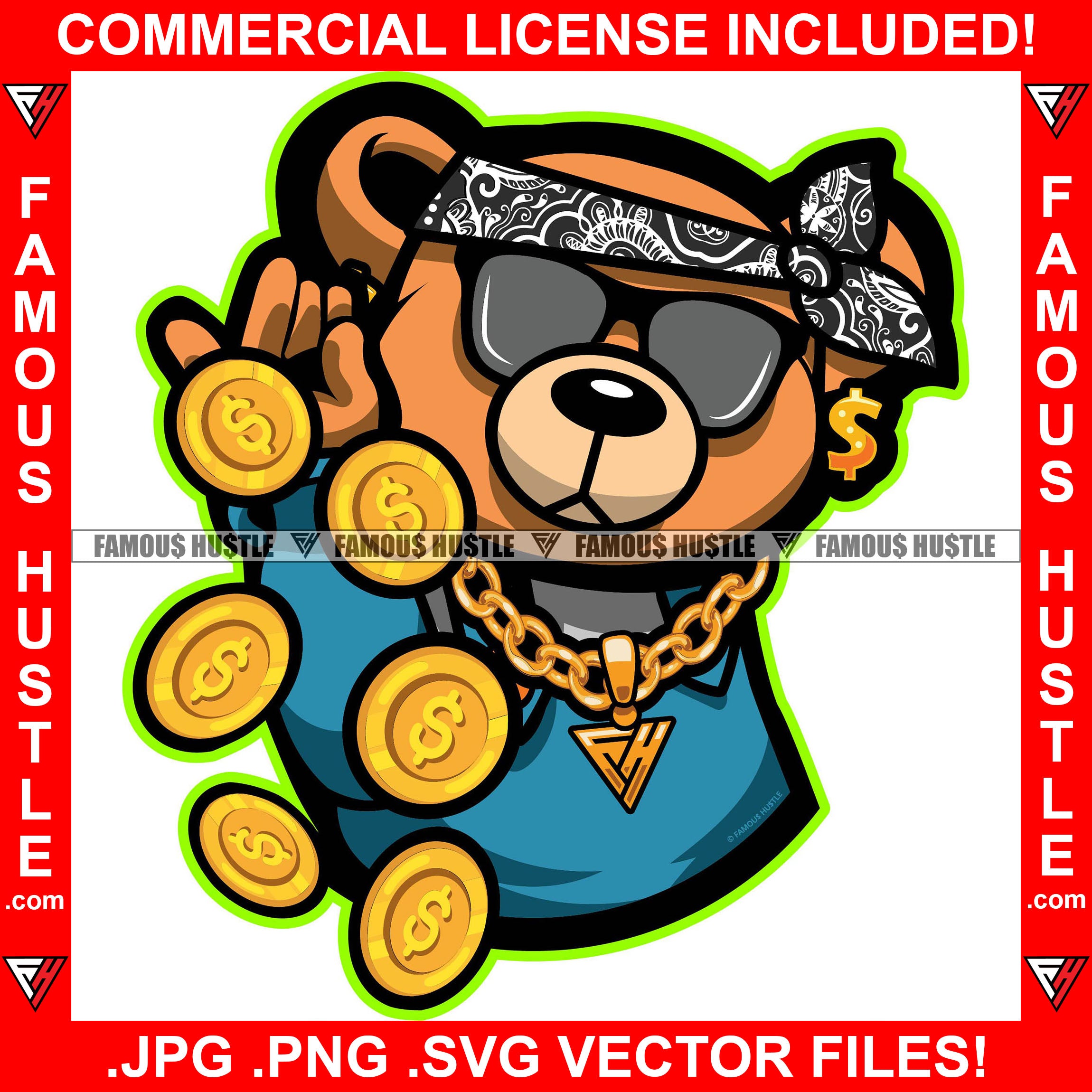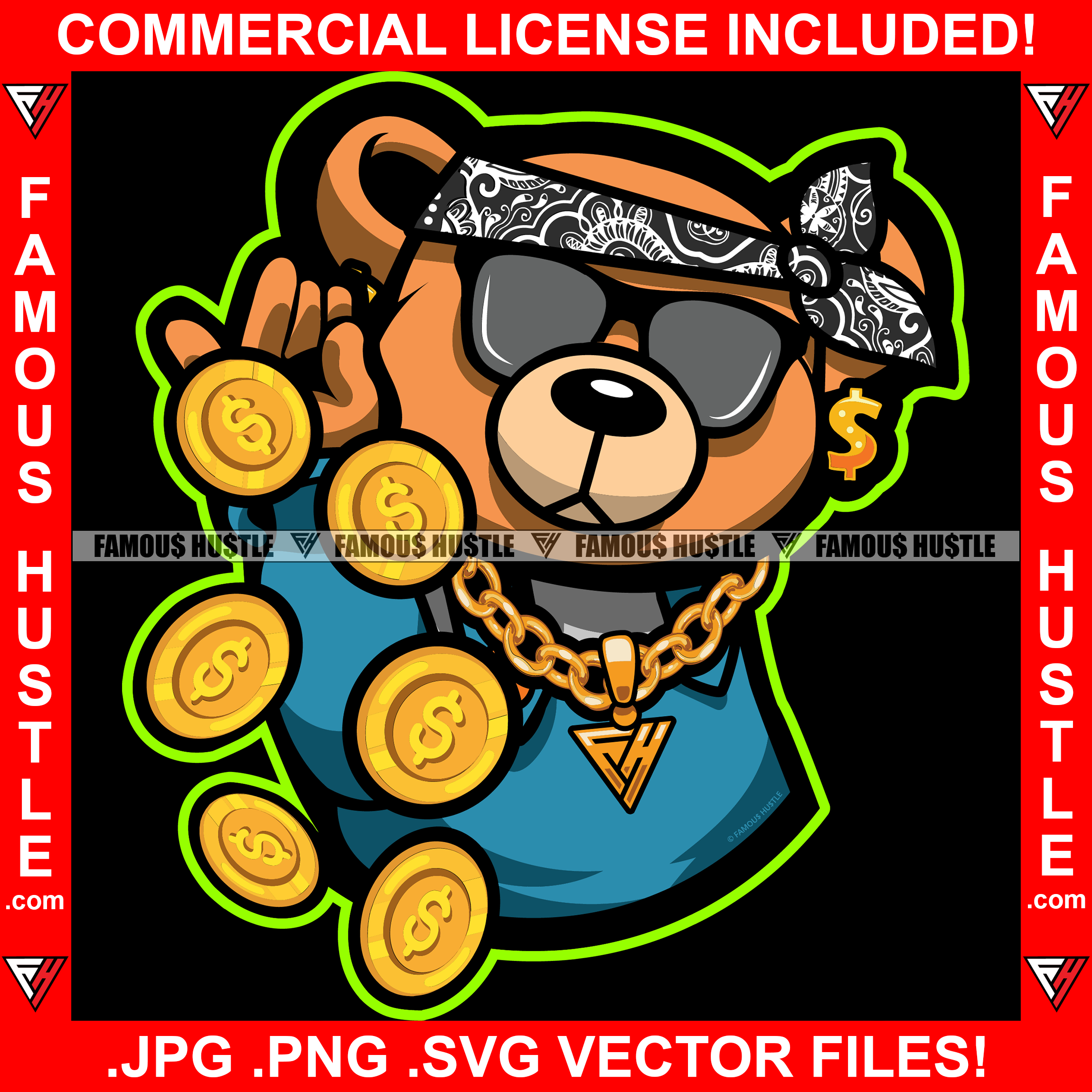 Famous Hustle Dripping Gangster Teddy Bear Head Bandanna Black Glasses Dollar Sign Earrings Gold Jewelry Coins Hip Hop Rap Rapper Street Hood Ghetto Swag Thug Hustler Trapper Art Graphic Design Logo T-Shirt Print Printing JPG PNG SVG Vector Cut File