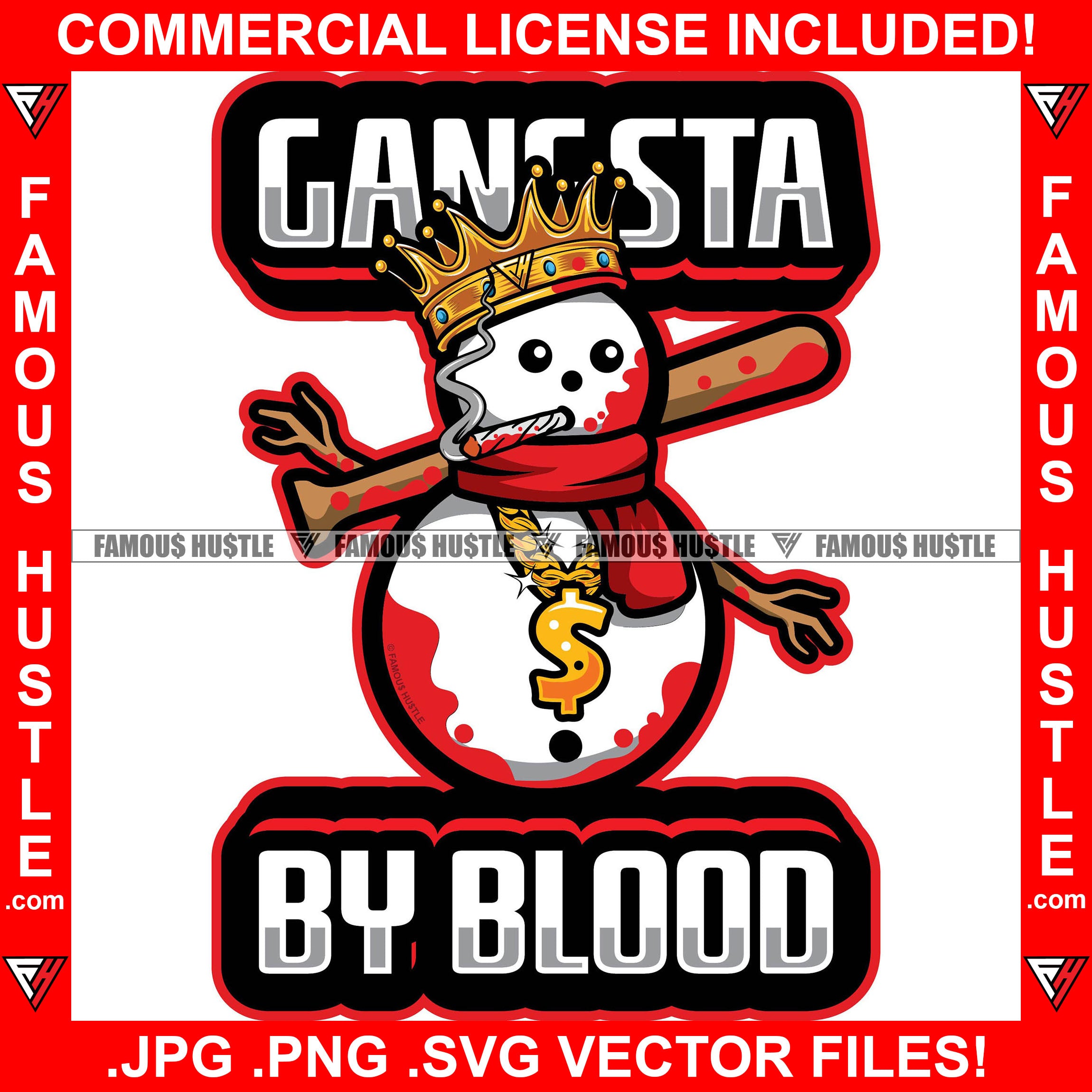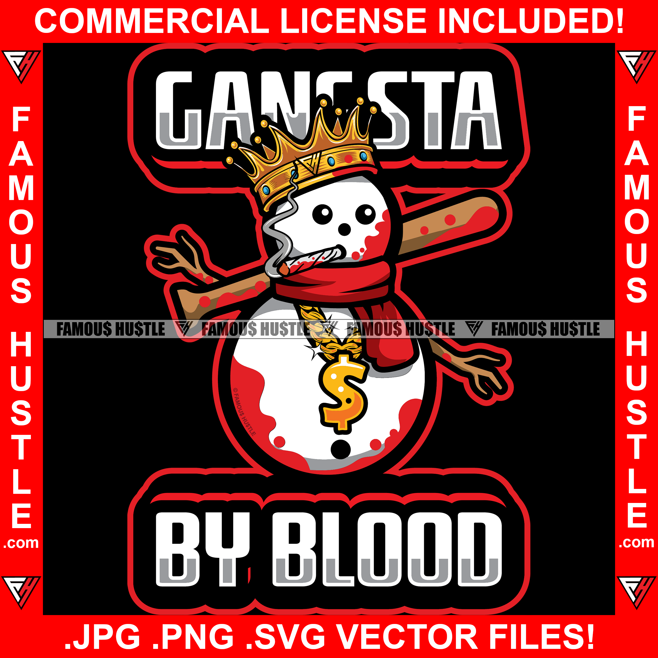Gangsta By Blood King Snowman Bloody Baseball Bat Smoking Cigar Gold Dollar Sign Necklace Hip Hop Rap Plug Trap Street Hood Ghetto Swag Thug Famous Hustle Baller Quote Art Graphic Design Logo T-Shirt Print Printing JPG PNG SVG Vector Cut File