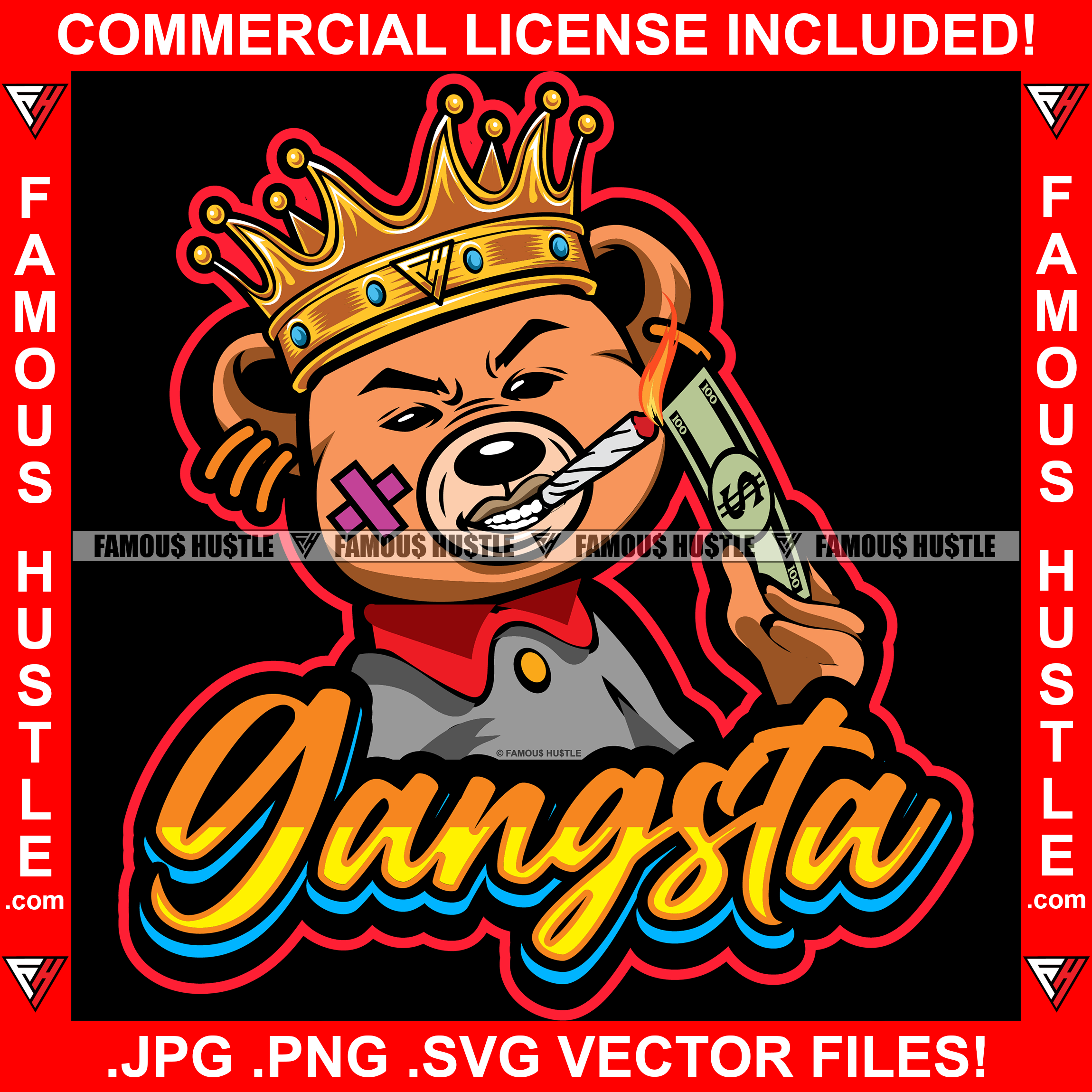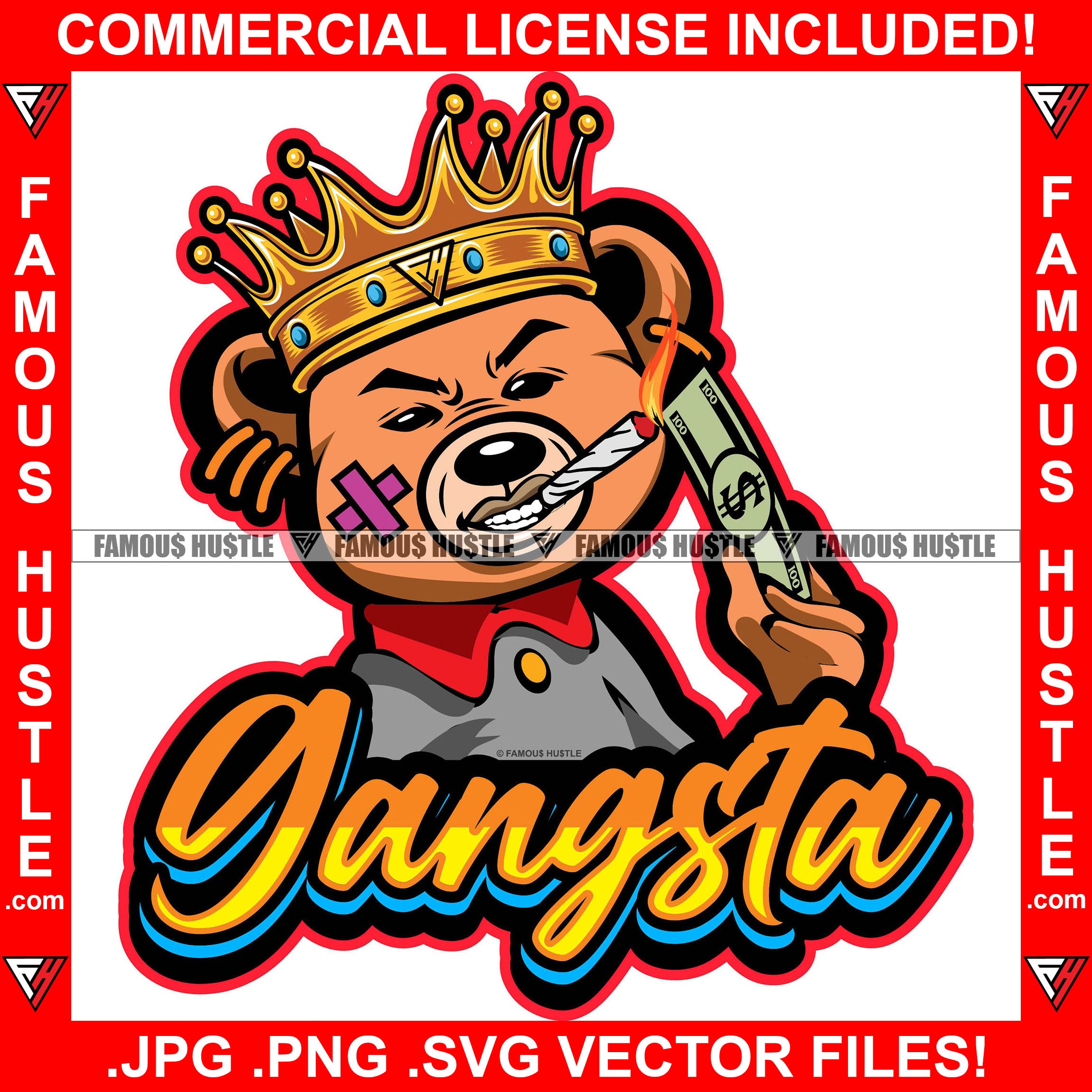 Gangsta Gangster Teddy Bear King Scar Face Cigar Burning Cash Money Gold Crown Hip Hop Rap Rapper Plug Trap Street Hood Ghetto Swag Thug Famous Hustle Baller Trapper Quote Art Graphic Design Logo T-Shirt Print Printing JPG PNG SVG Vector Cut File