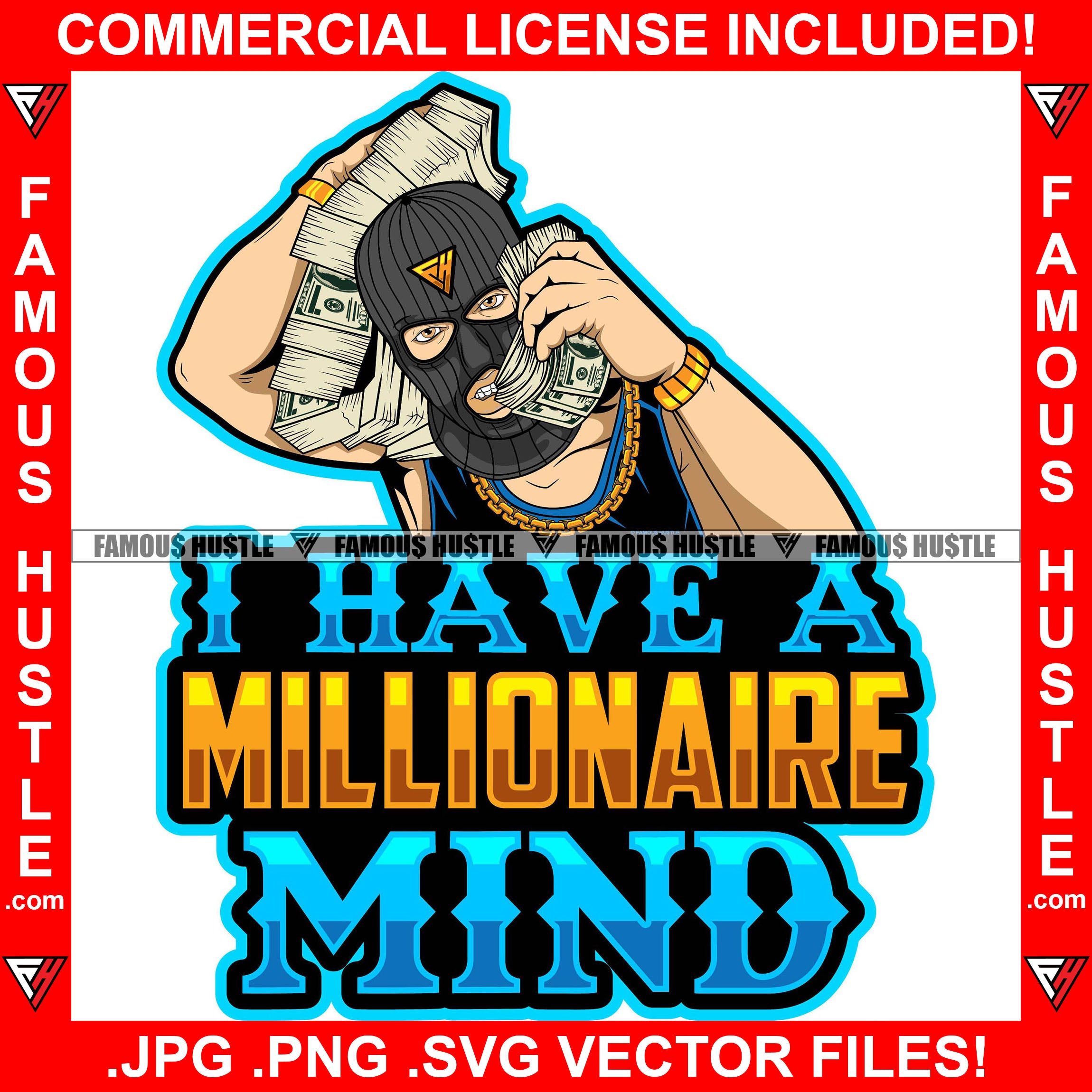 I Have A Millionaire Mind Famous Hustle Dripping Gangster White Man Ski Mask Gold Jewelry Necklace Face Mask Huge Money Stacks Both Hands Hip Hop Rap Hood Ghetto Swag Thug Quote Art Graphic Design Logo T-Shirt Print Printing JPG PNG SVG Vector Cut File