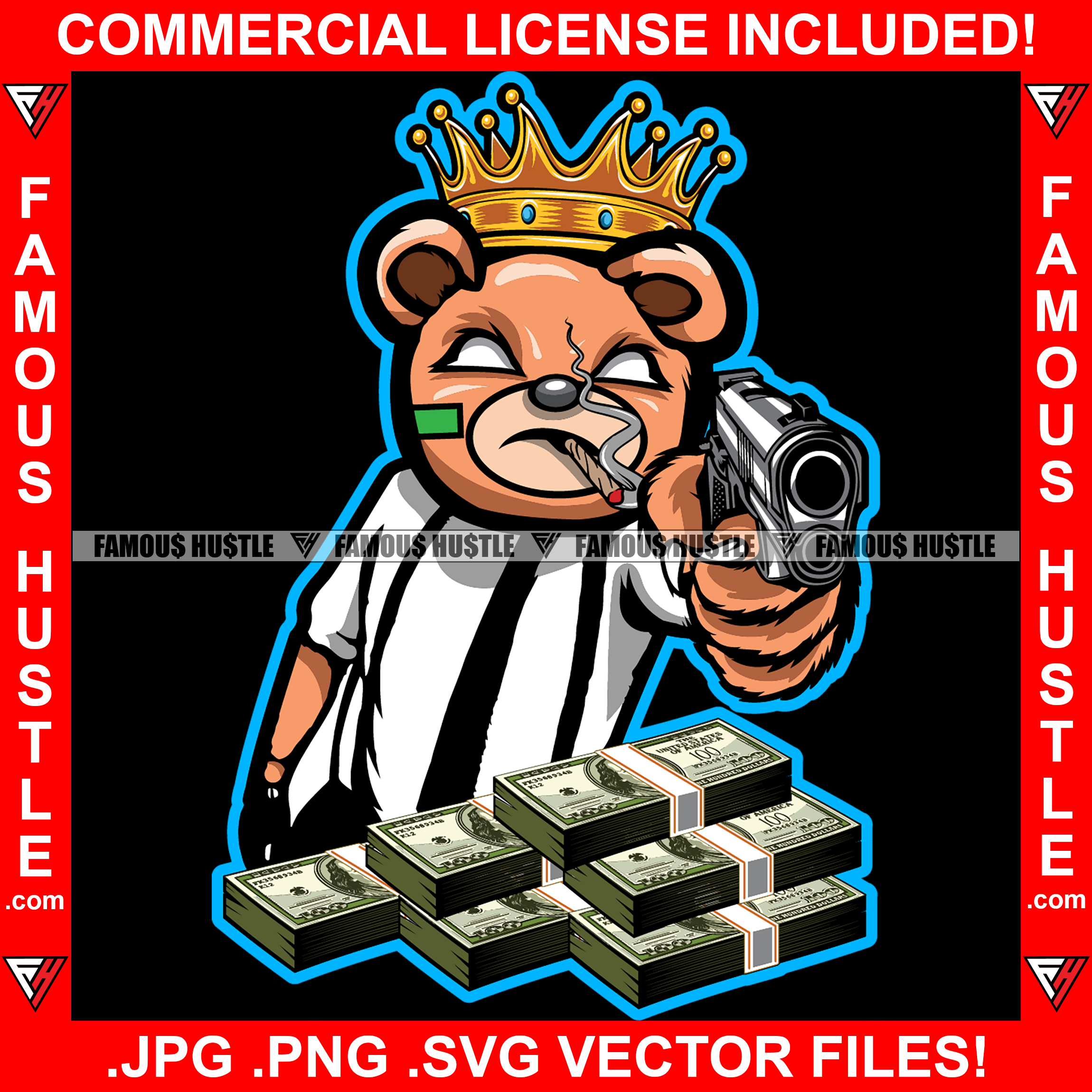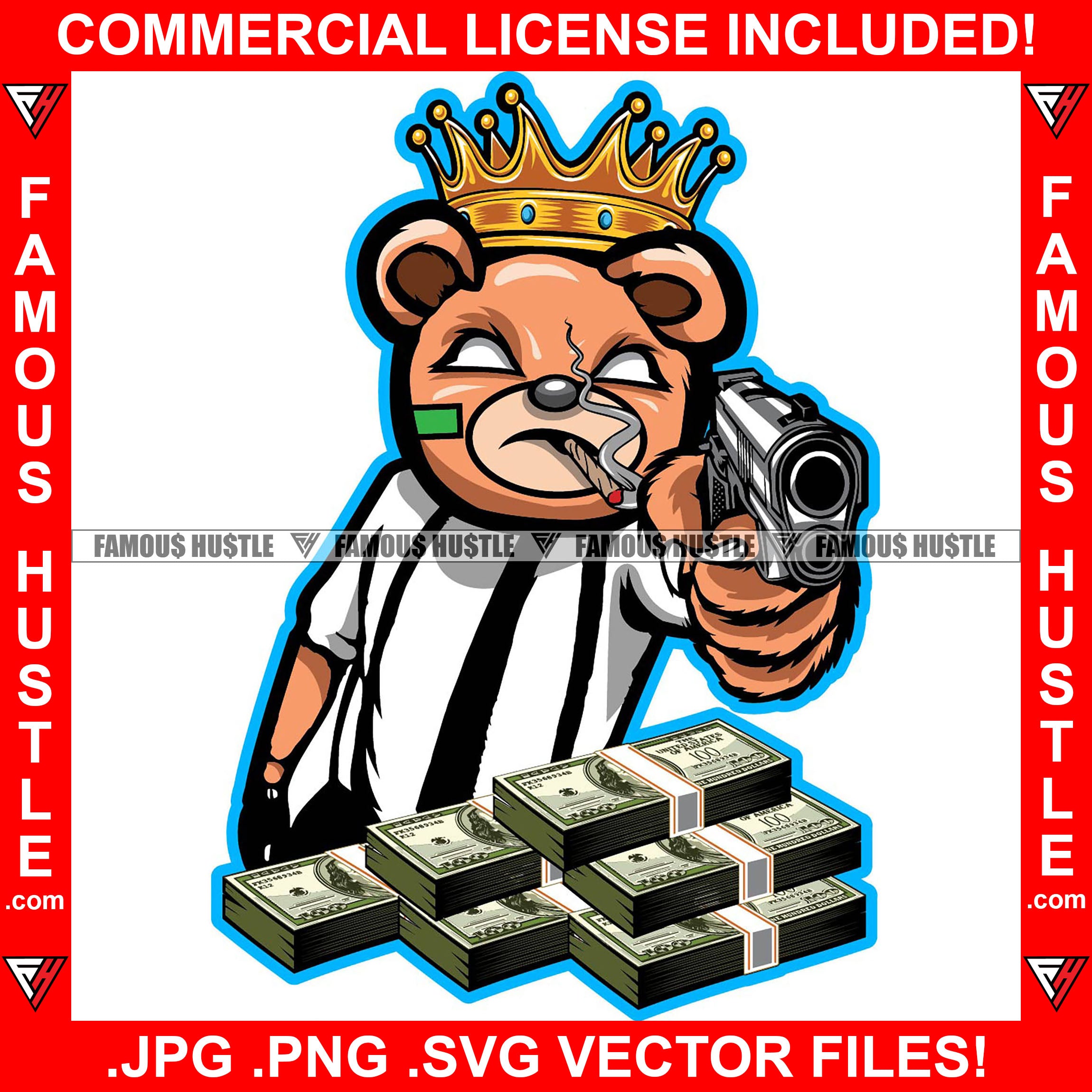 King Gangster Teddy Bear Drug Dealer Smoking Marijuana Pot Cigar Blunt Cigarette White Eyes Cash Money Bundles Pistol Gun Hip Hop Rap Plug Street Hood Famous Hustle Art Graphic Design Logo T-Shirt Print Printing JPG PNG SVG Vector Cut File