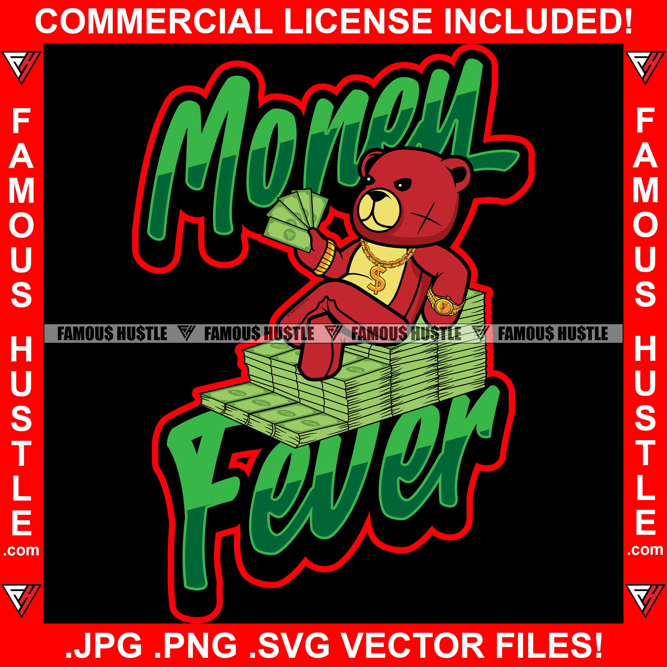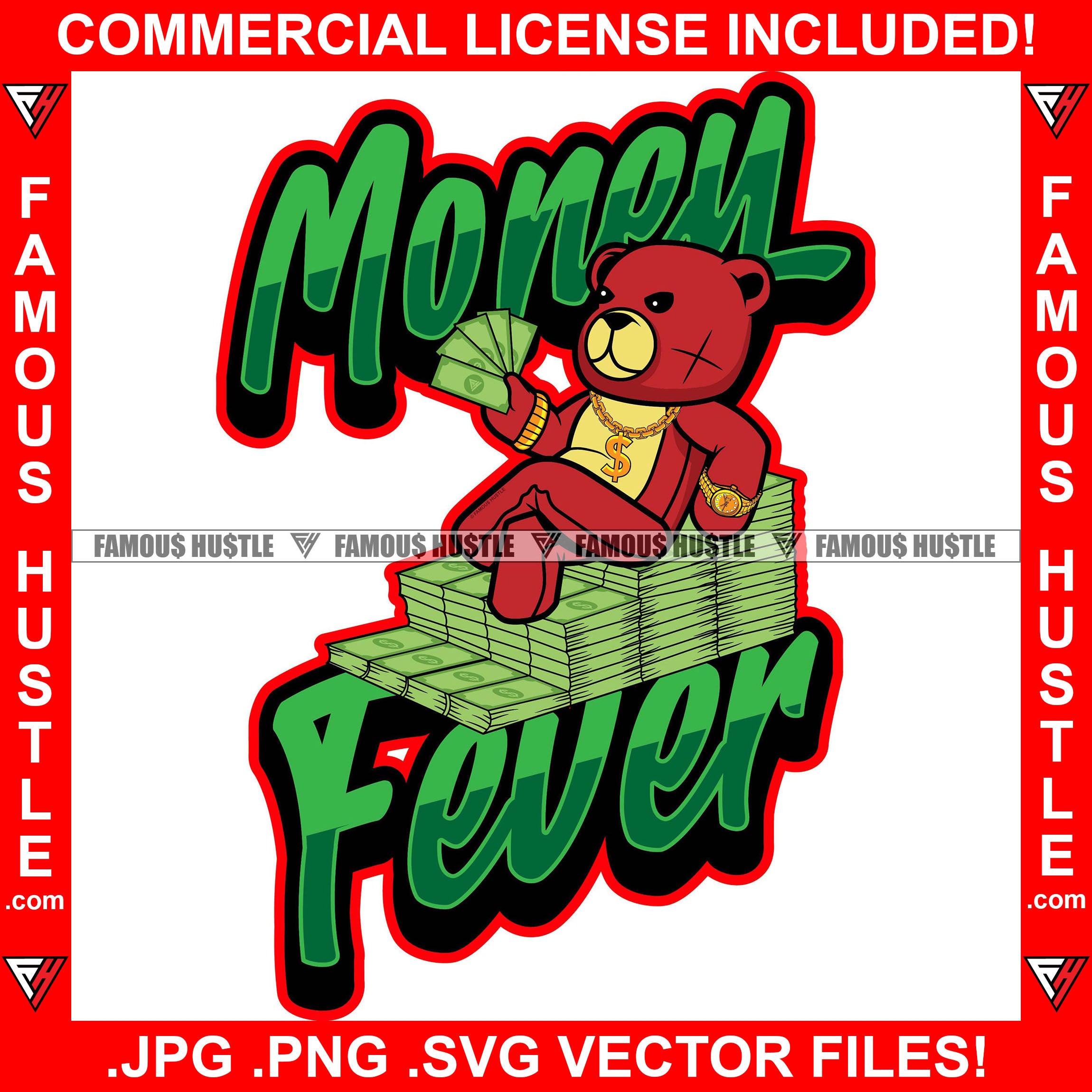 Money Fever Red Teddy Bear Scar Face Gold Dollar Sign Jewelry Necklace Cash Bundles Chair Hip Hop Rap Plug Trap Street Hood Ghetto Swag Thug Hustler Hustling Famous Hustle Quote Art Graphic Design Logo T-Shirt Print Printing JPG PNG SVG Vector Cut File