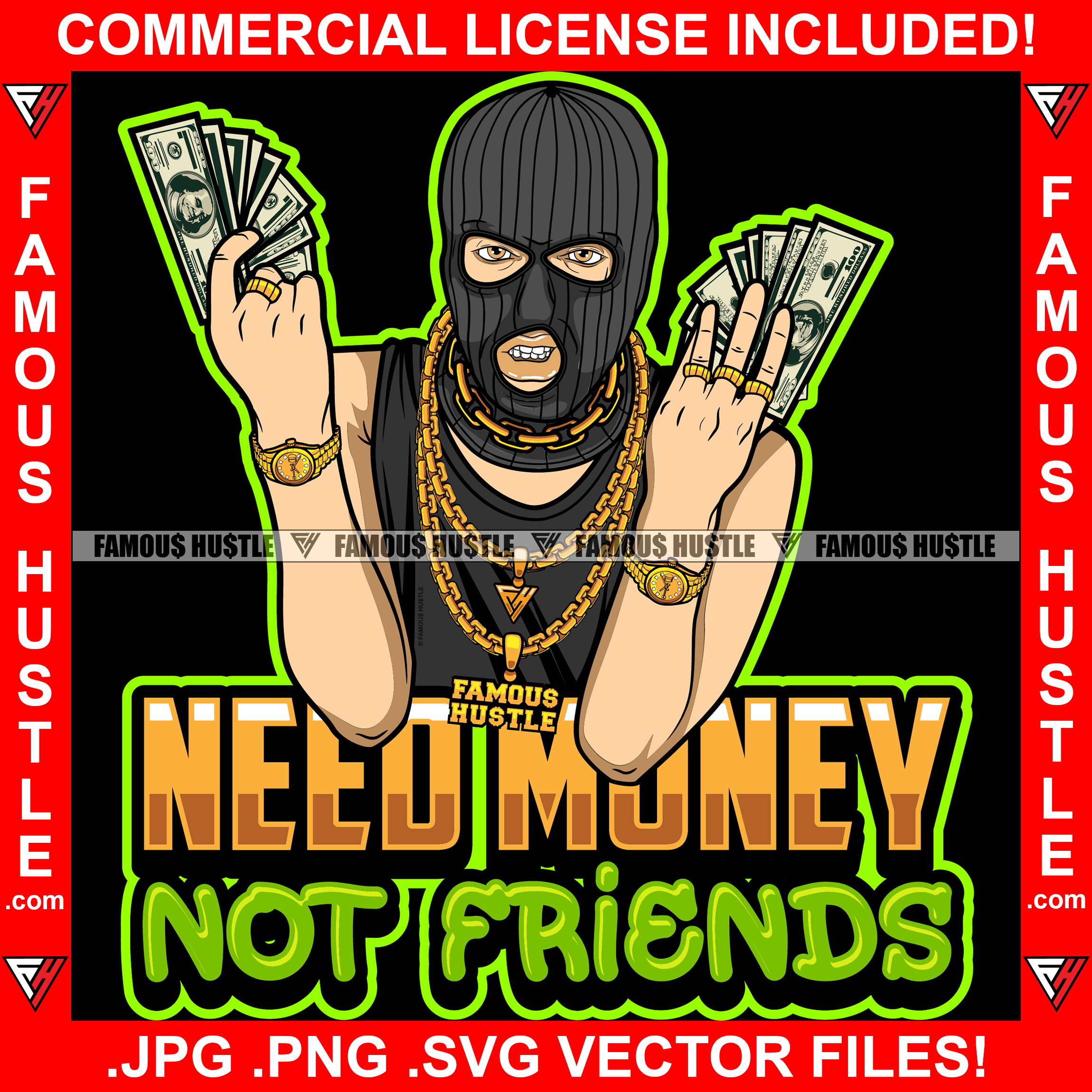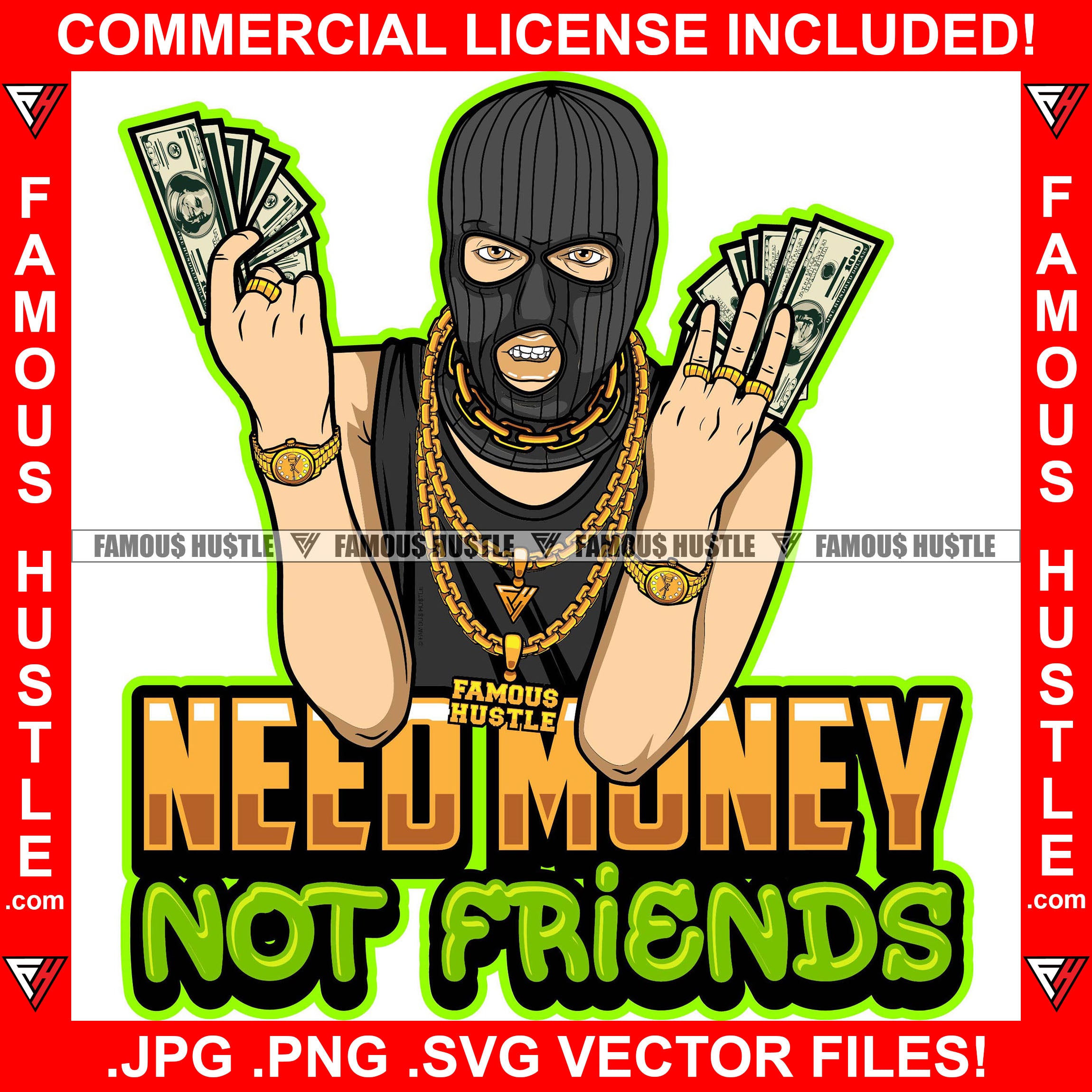 Need Money Not Friends Gangster Hustle White Male Man Ski Mask Lots Of Gold Jewelry Robber Face Money Hands Hip Hop Rap Plug Trap Street Hood Ghetto Swag Thug Famous Hustle Quote Art Graphic Design Logo T-Shirt Print Printing JPG PNG SVG Vector Cut File