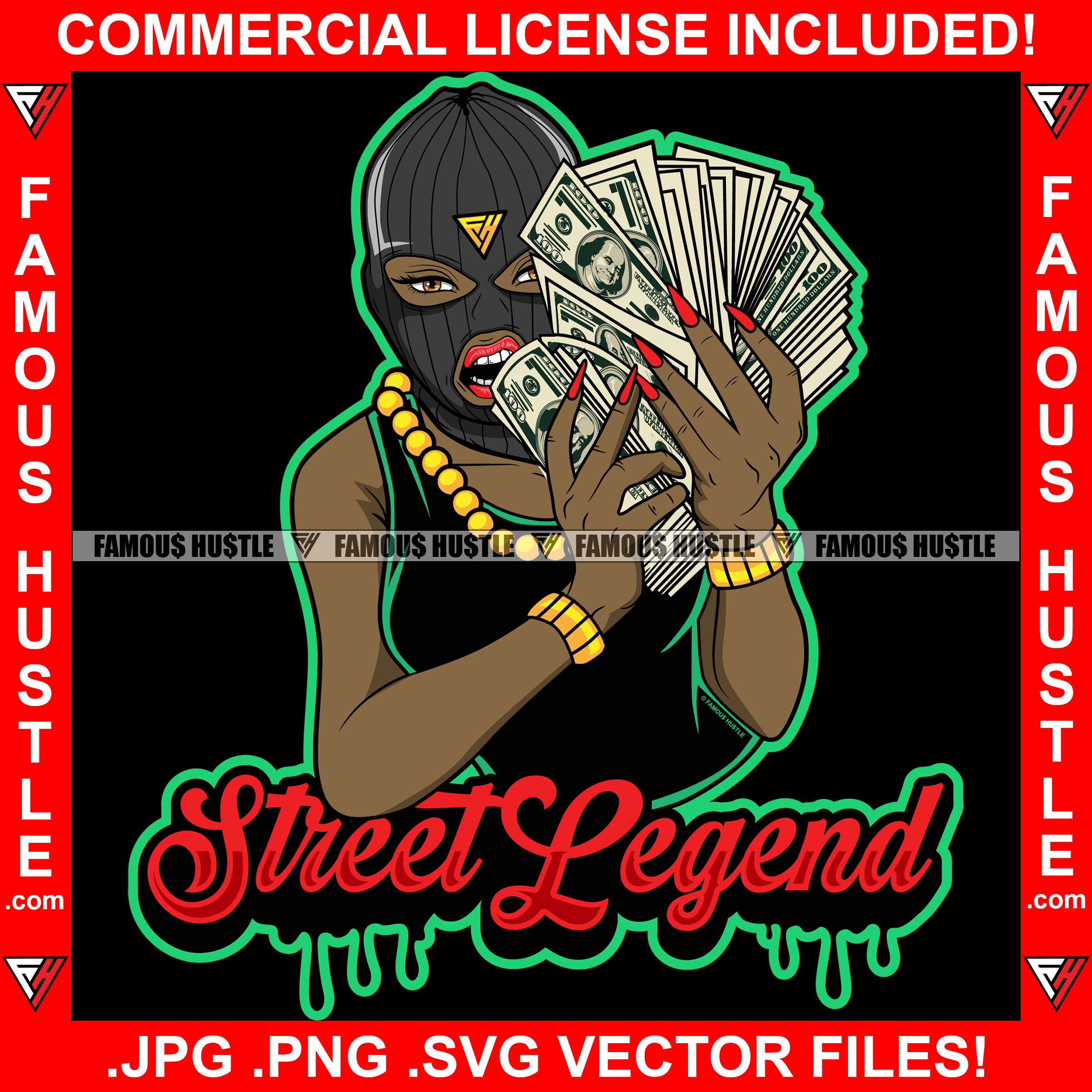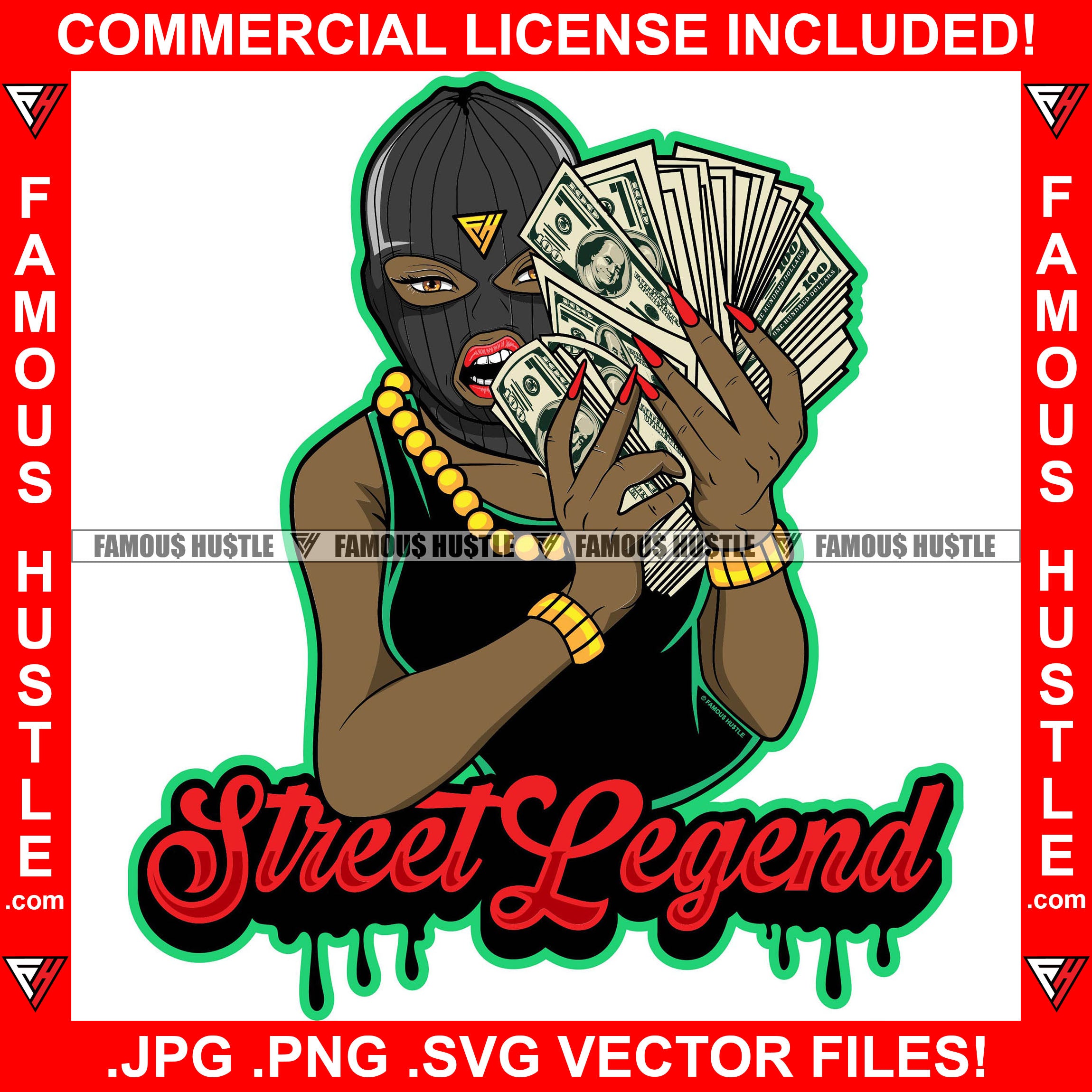 Street Legend Dripping Sexy Black Female Gangster Ski Mask Cash Money Hands Gold Jewelry Robber Face Mask Rap Rapper Plug Trap Ghetto Swag Thug Drip Famous Hustle Quote Art Graphic Design Logo T-Shirt Print Printing JPG PNG SVG Vector Cut File