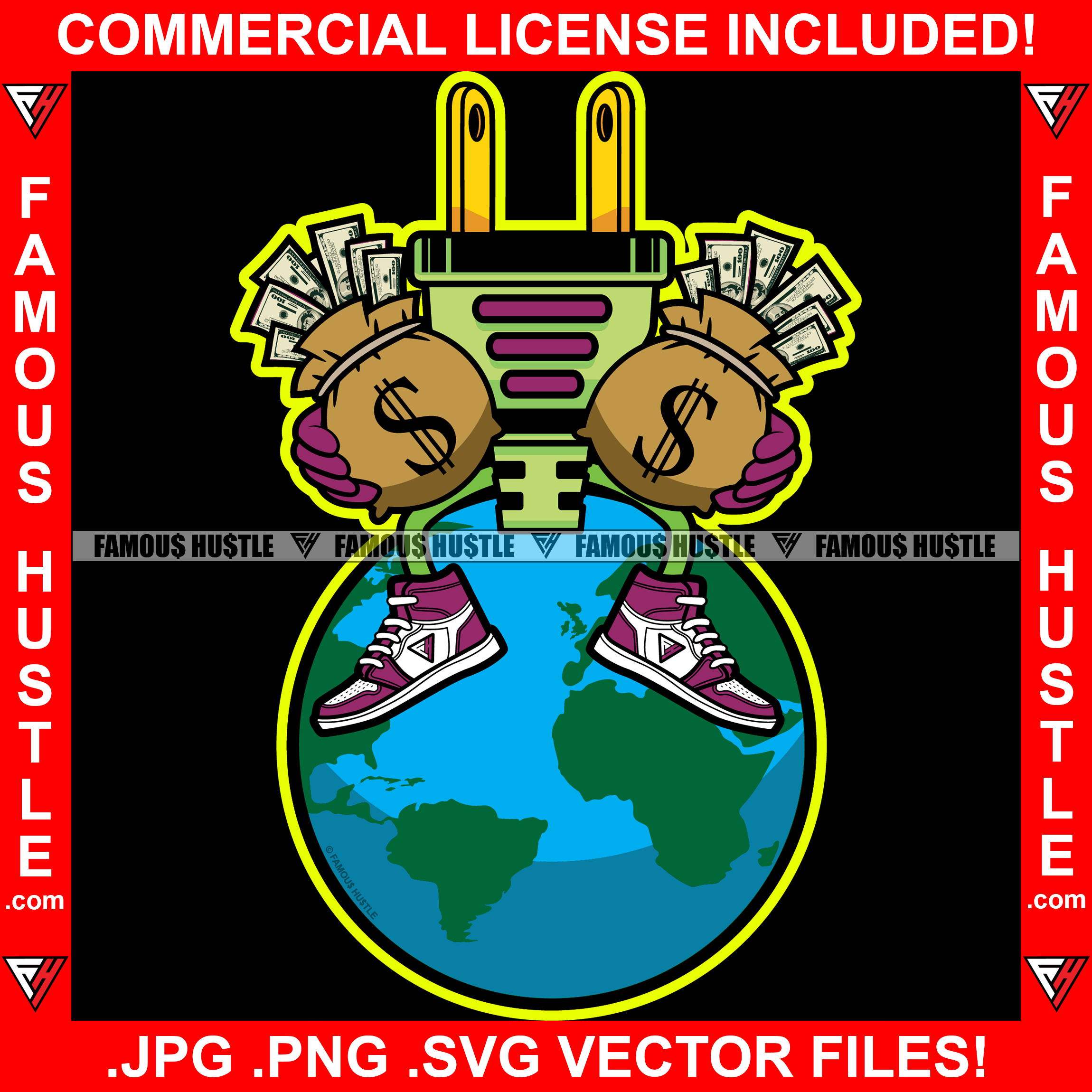 The World Is Yours Gold Electrical Plug Socket Cartoon Character Pink Sneakers Gloves Sitting On Globe Cash Money Bag Hip Hop Rap Plug Trap Street Hood Ghetto Famous Hustle Art Graphic Design Logo T-Shirt Print Printing JPG PNG SVG Vector Cut File