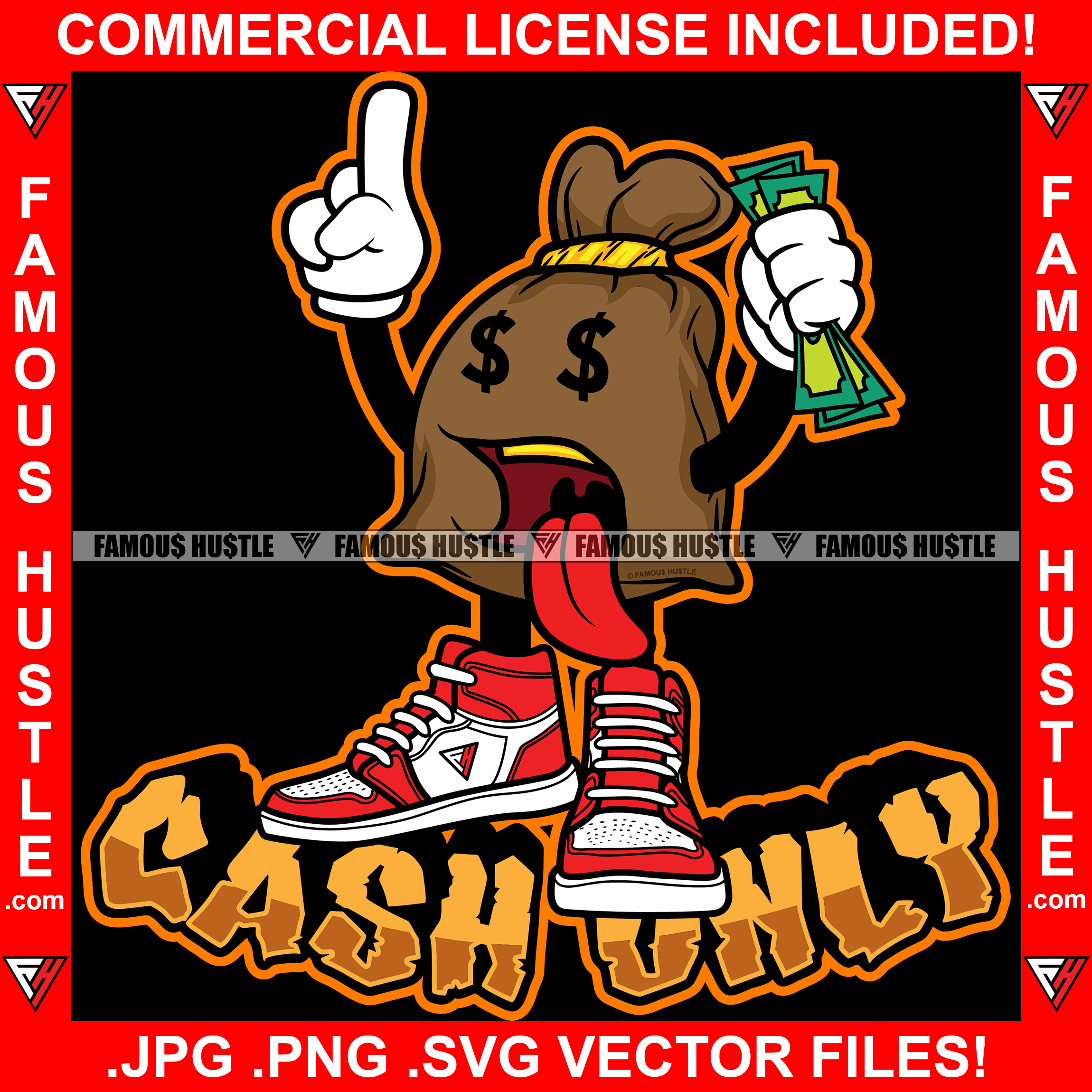 Cash Only Gangster Cash Bag Money Dollar Sign Eyes Tongue Out Sneakers Money Hip Hop Rap Trap Street Hood Ghetto Swag Thug Hustler Hustling Famous Hustle Baller Trapper Quote Art Graphic Design Logo T-Shirt Print Printing JPG PNG SVG Vector Cut File