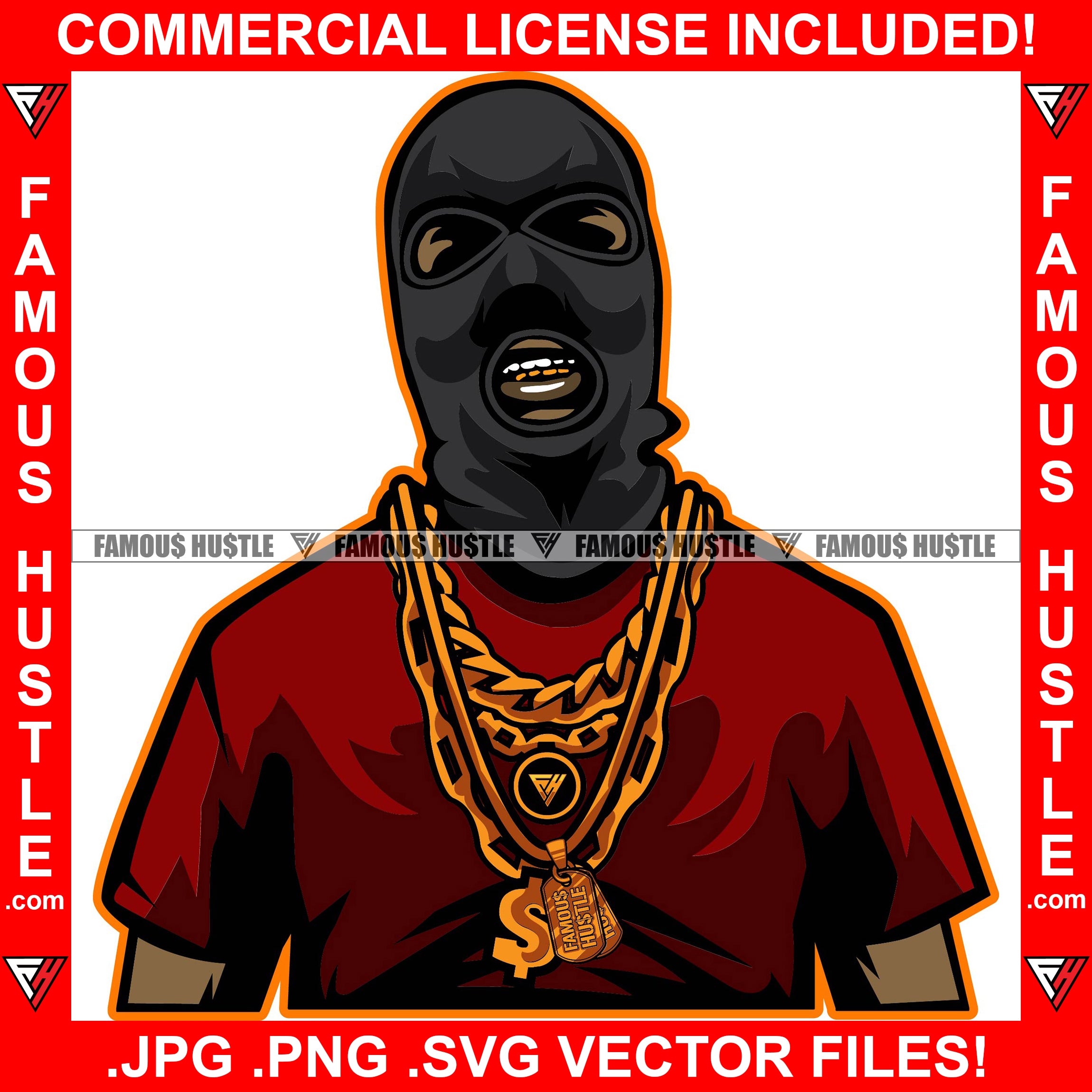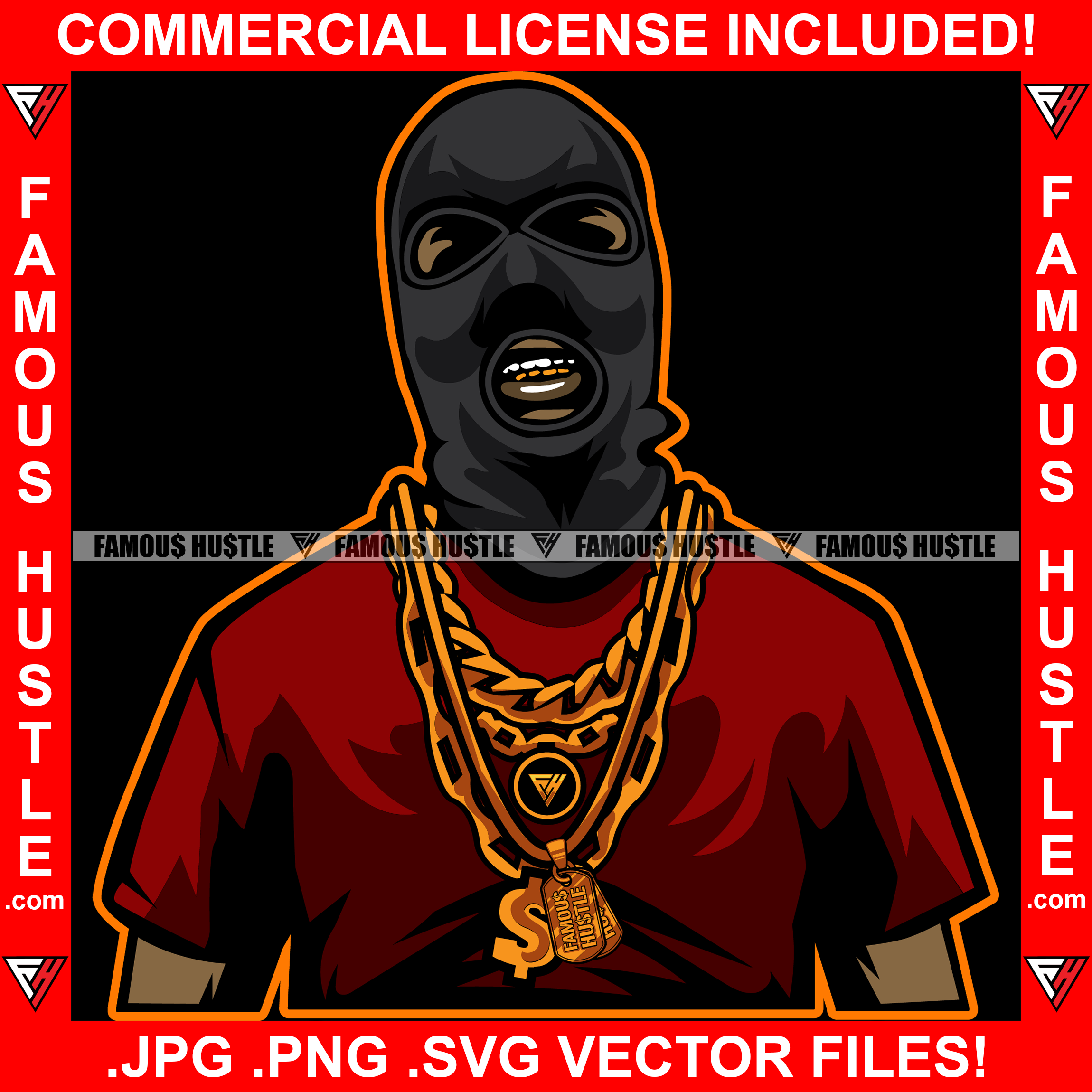 Famous Hustle Gangster Hustle Black Man Ski Mask Gold Teeth Jewelry Necklace Face Mask Hip Hop Rap Rapper Plug Trap Street Hood Ghetto Swag Thug Hustler Hustling Drip Art Graphic Design Logo T-Shirt Print Printing JPG PNG SVG Vector Cut File
