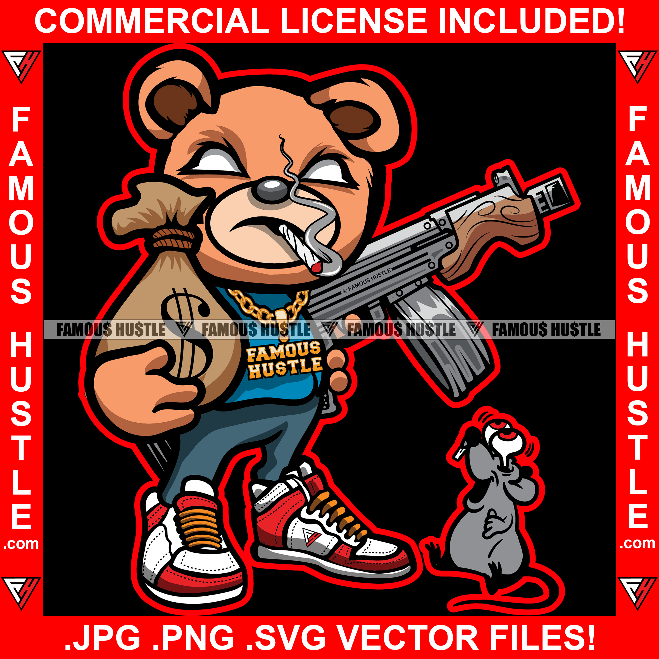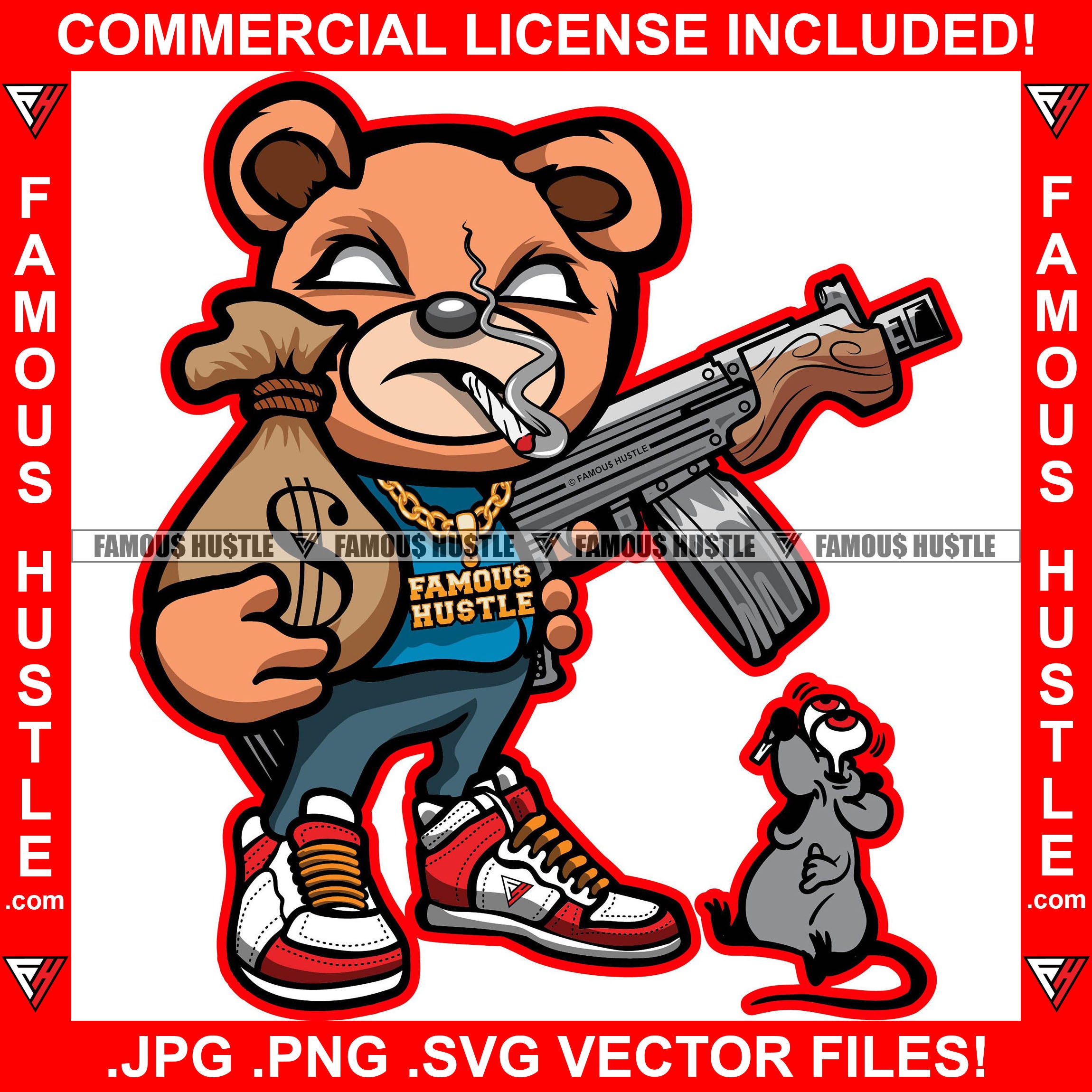 Gangster Teddy Bear Smoking Marijuana Joint Blunt Machine Gun Cash Money Bag Gold Chain Scared Rat Hip Hop Rap Drip Trap Street Hood Ghetto Thug Mafia Mob Gang Famous Hustle Art Graphic Design Logo T-Shirt Print Printing JPG PNG SVG Vector Cut File
