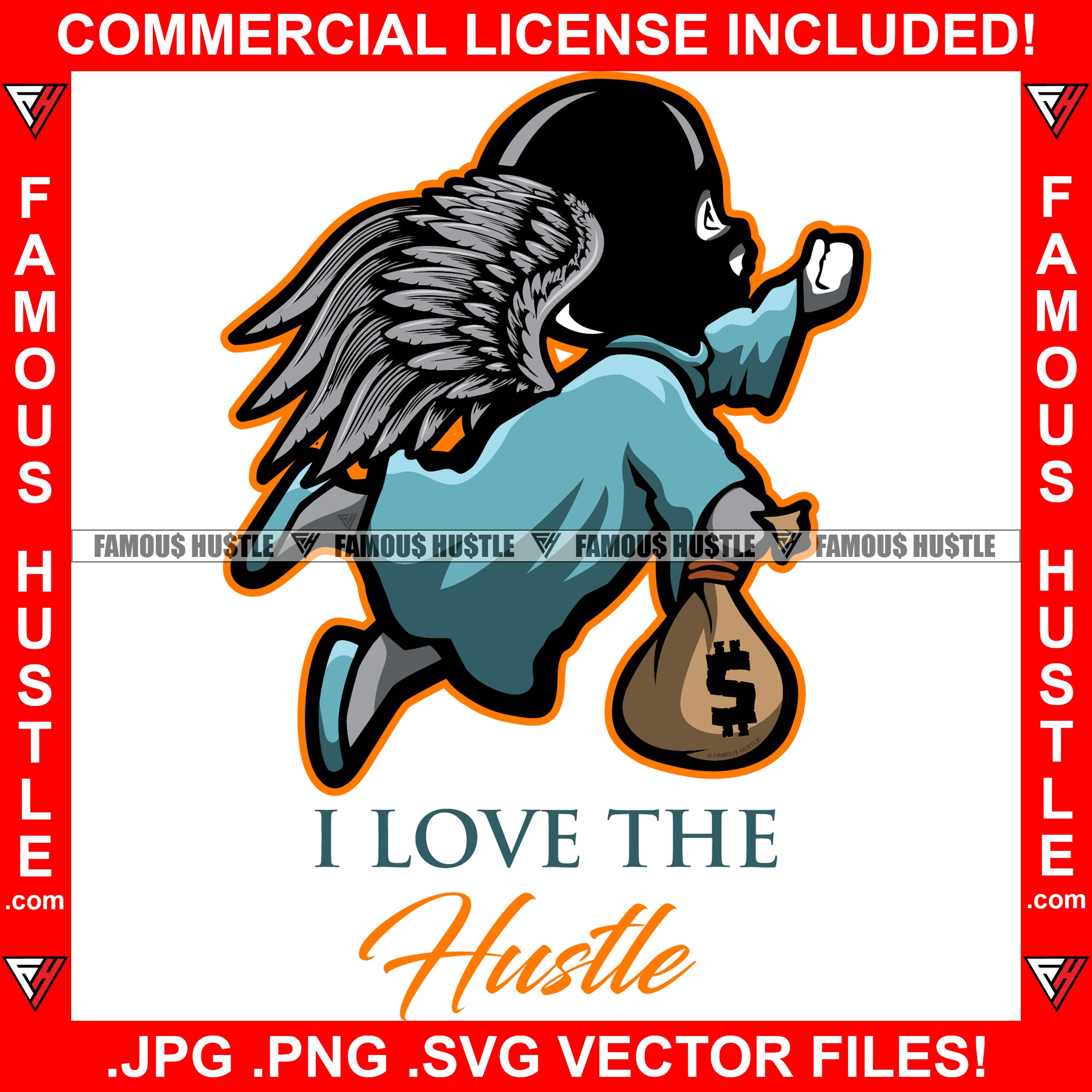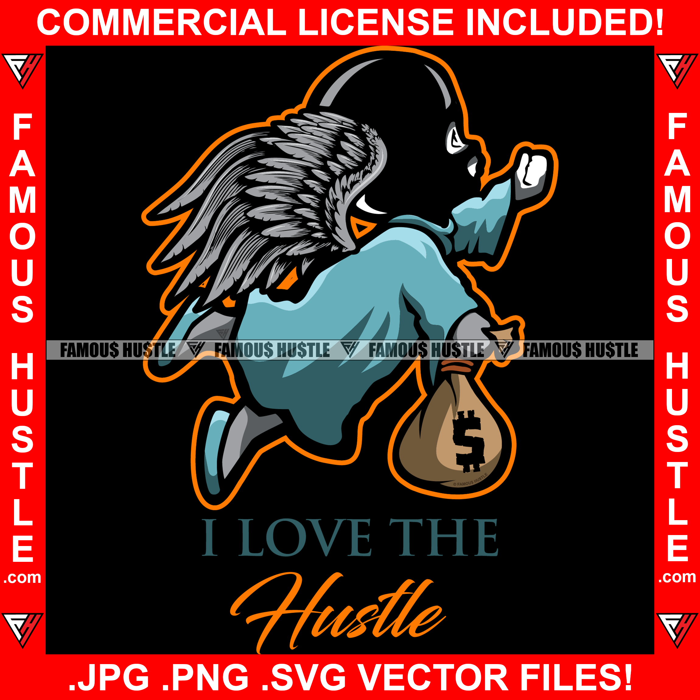 I Love The Hustle Famous Gangster Statue Angel Wings Ski Mask Cash Money Bag Hip Hop Rap Rapper Plug Trap Street Hood Swag Thug Hustler Hustling Baller Trapper Quote Art Graphic Design Logo T-Shirt Print Printing JPG PNG SVG Vector Cut File