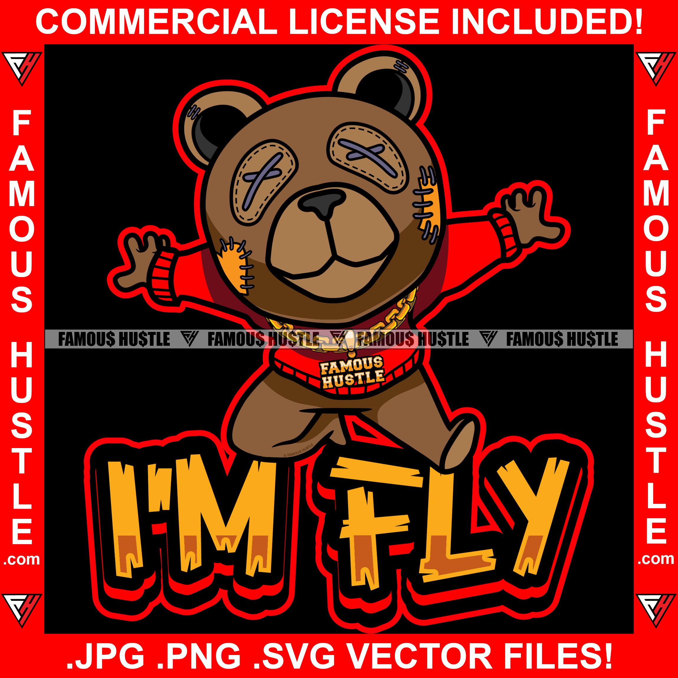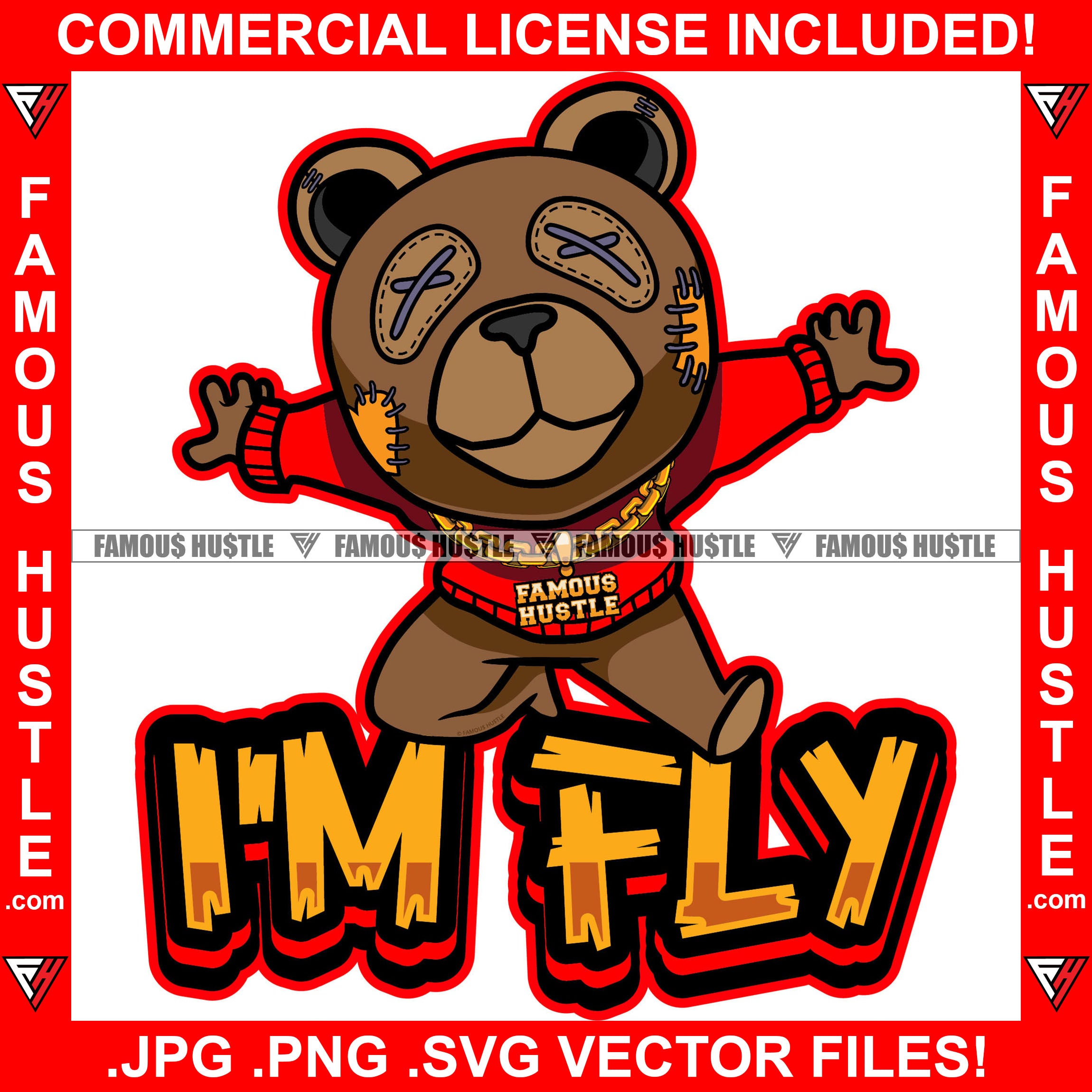 I'm Fly Gangster Teddy Bear Stitched Eyes Patch No Heart Gold Chain Necklace College Sweater Jumping Hip Hop Rap Trap Street Hood Ghetto Thug Hustler Hustling Famous Hustle Quote Art Graphic Design Logo T-Shirt Print Printing JPG PNG SVG Vector Cut File