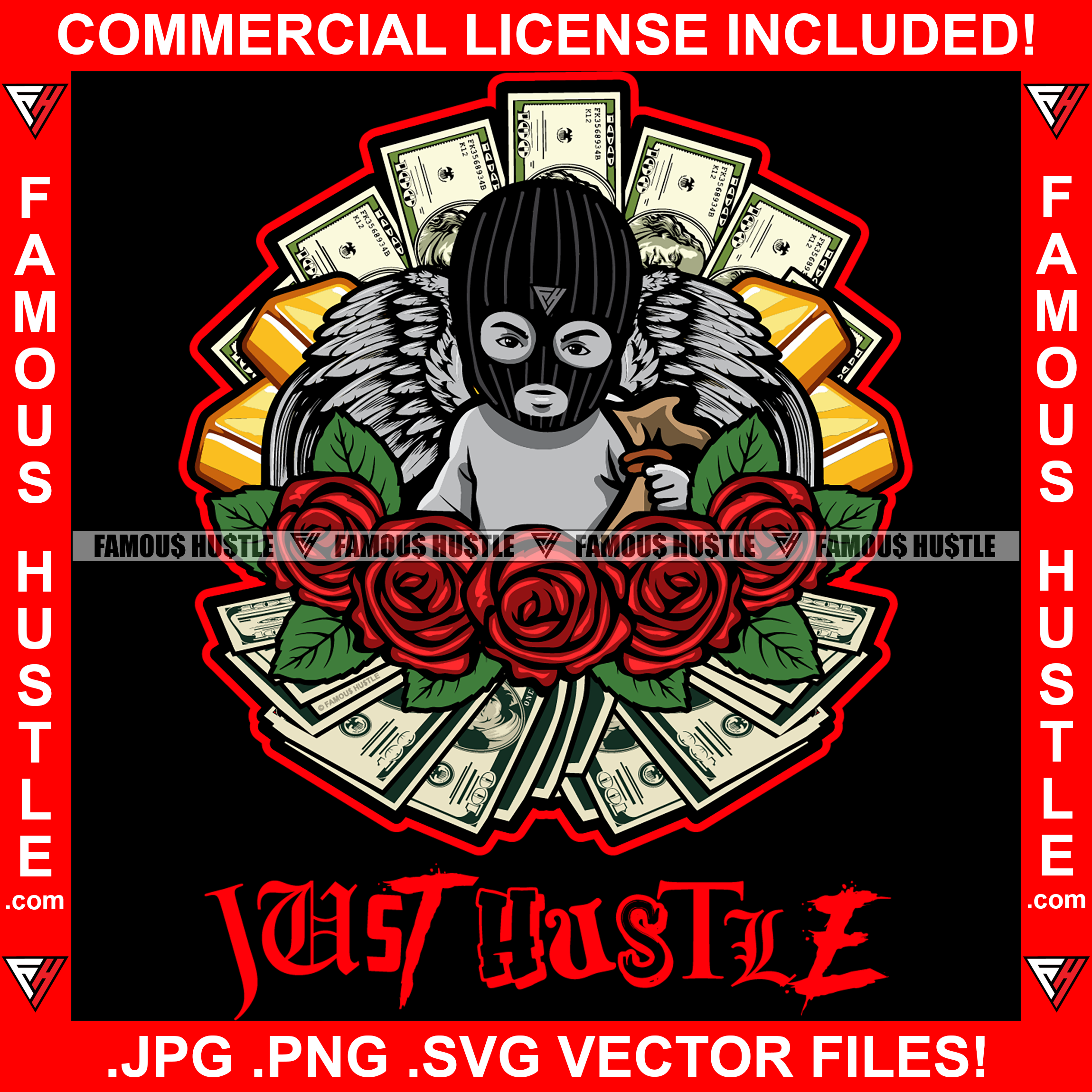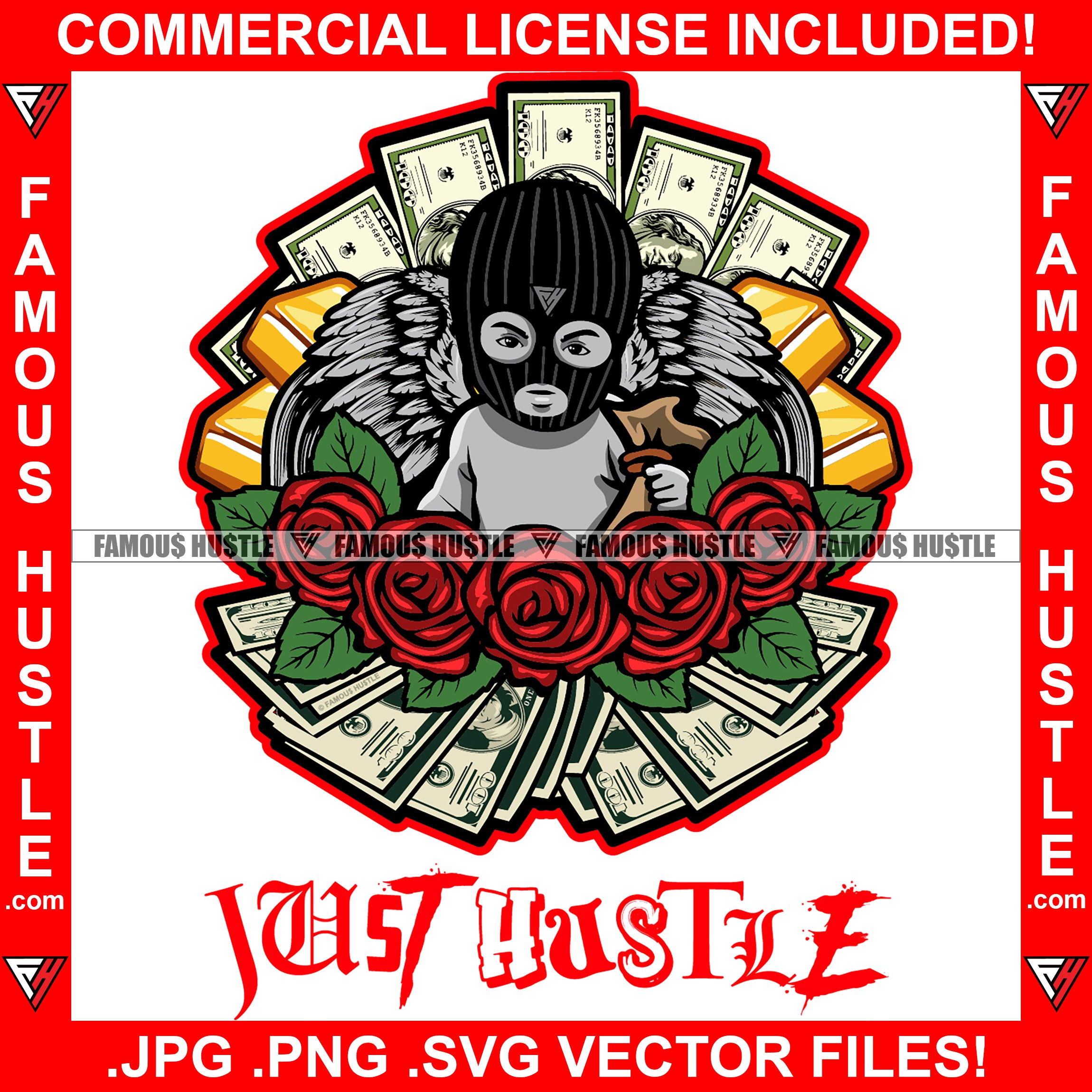 Just Hustle Street Demon Gangster Angel Statue Wings Wearing Ski Mask Cash Bag Red Roses Gold Bars Hip Hop Rap Rapper Plug Trap Swag Thug Hustler Hustling Famous Trapper Quote Art Graphic Design Logo T-Shirt Print Printing JPG PNG SVG Vector Cut File