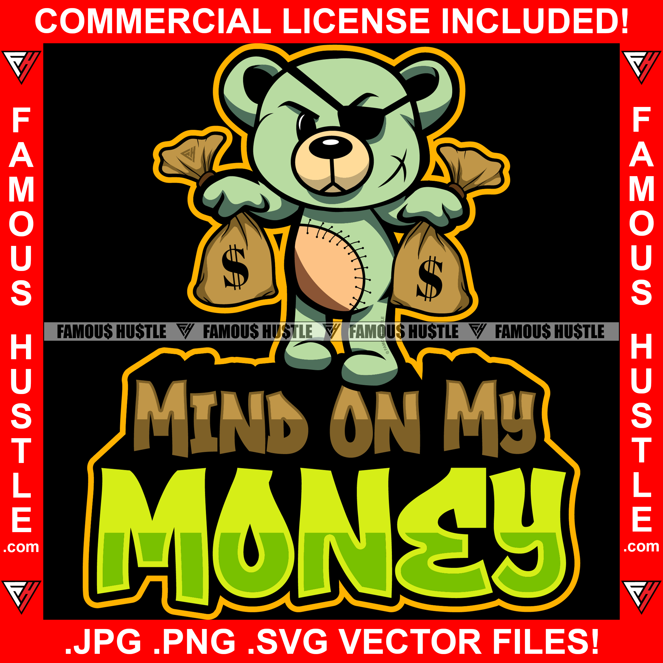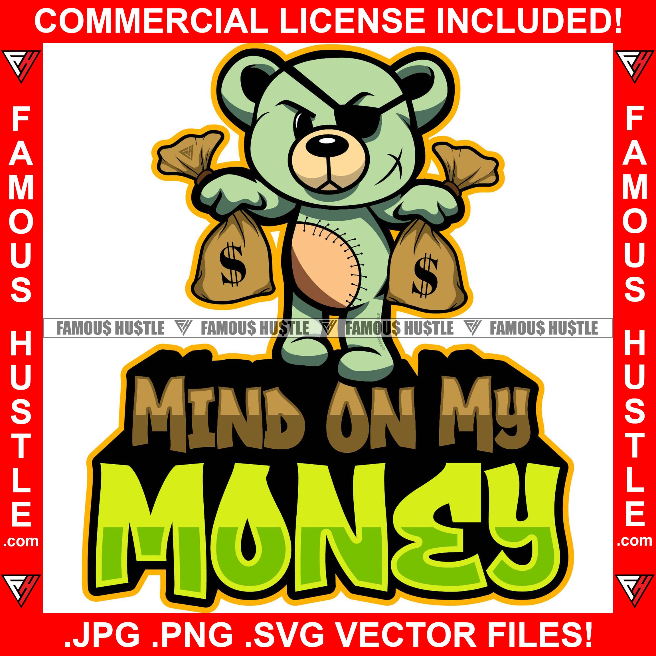 Mind On My Money Famous Hustle Gangster Teddy Bear Eye Patch Scar Face Cash Bags Stitches Patches Hip Hop Rap Plug Trap Street Hood Ghetto Swag Thug Baller Trapper Quote Art Graphic Design Logo T-Shirt Print Printing JPG PNG SVG Vector Cut File