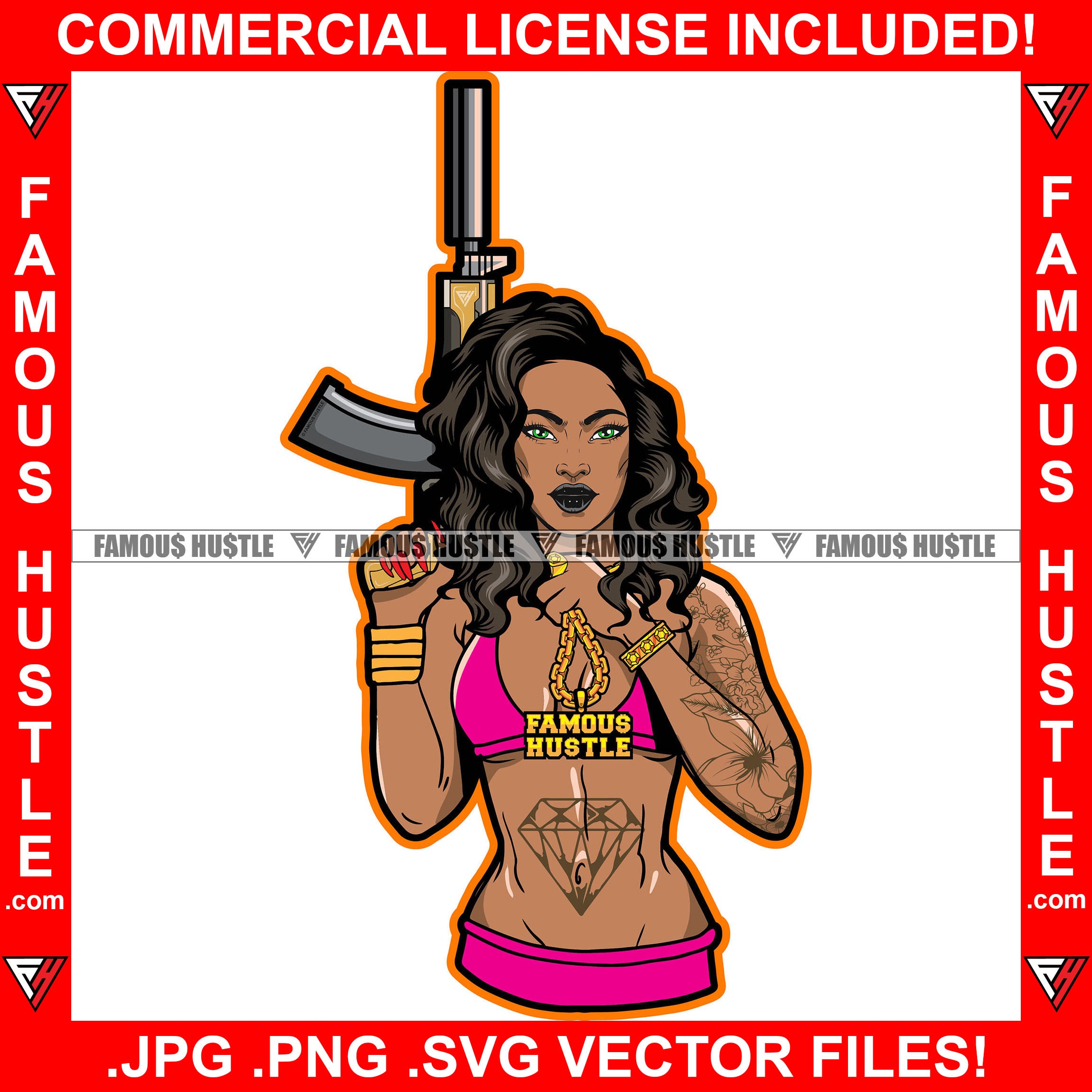 Sexy Gangster Lady Boss Bitch Female Sexy Dress Gold Jewelry Machine Gun Hand Body Tattoo Hip Hop Rap Plug Trap Street Hood Ghetto Hustler Hustling Drip Rich Thug Famous Hustle Art Graphic Design Logo Print Printing Vector SVG Cut File