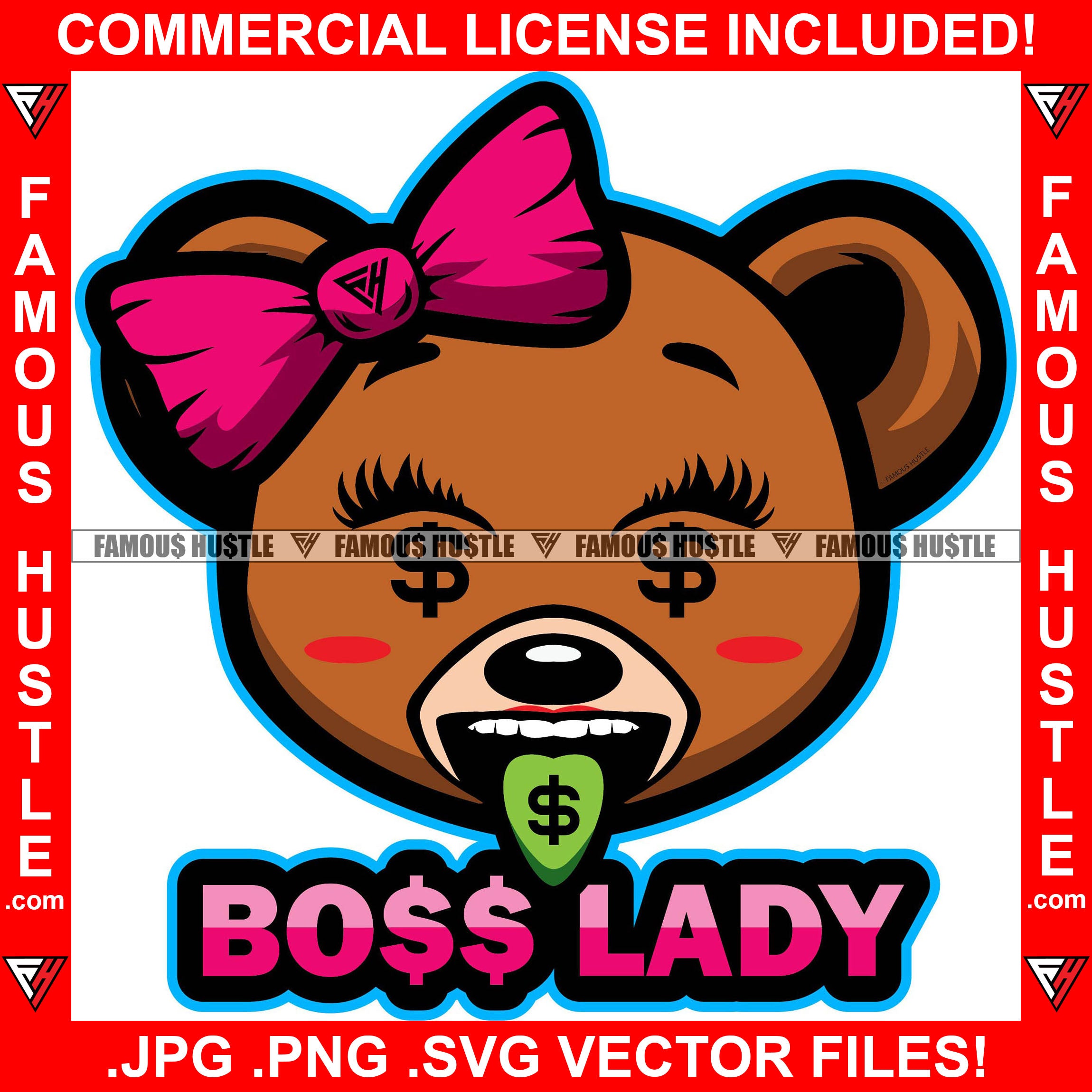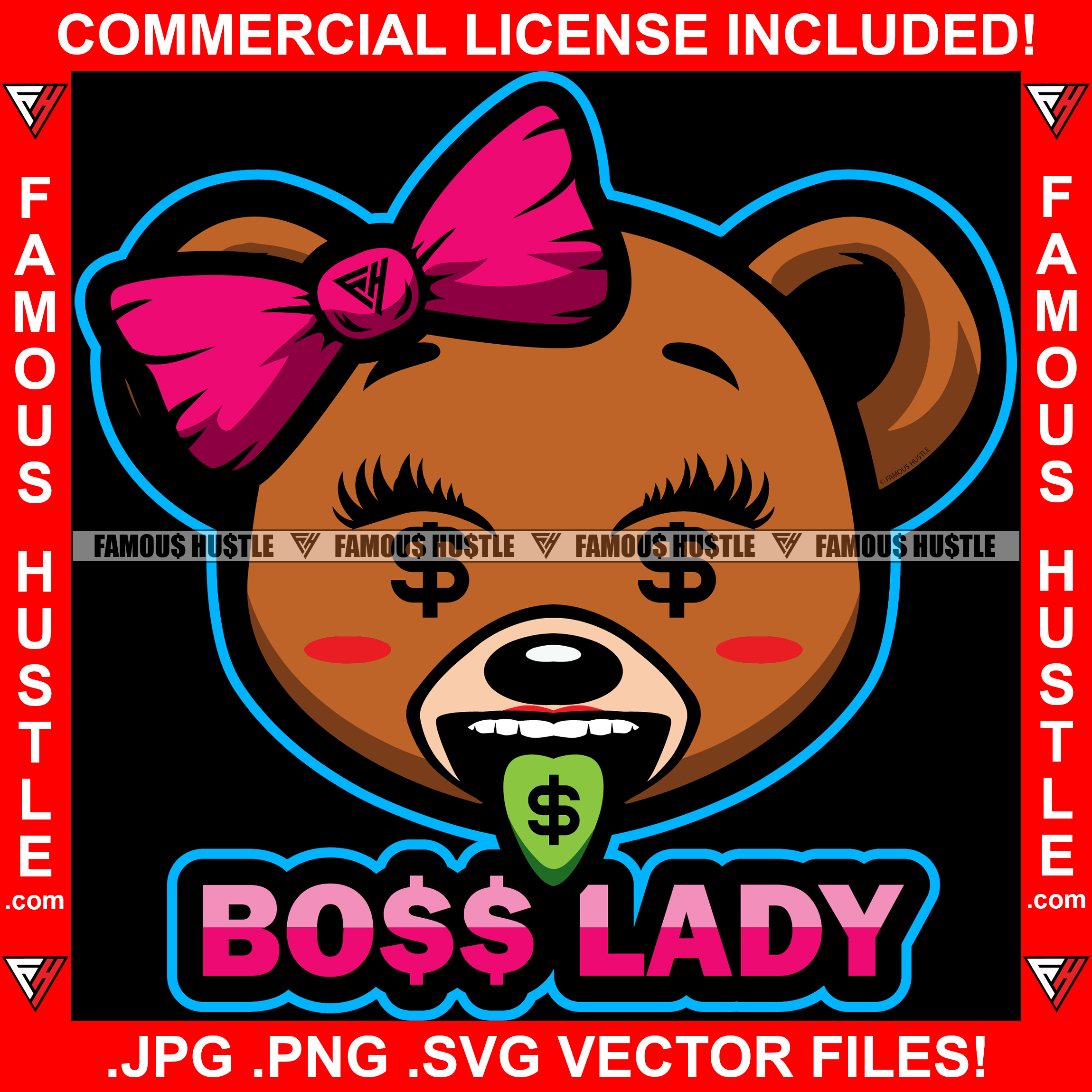 Boss Lady Gangster Cute Female Teddy Bear Dollar Sign Eyes Tongue Sticky Green Pink Bow Hip Hop Rap Plug Trap Street Hood Ghetto Swag Thug Hustler Hustling Famous Hustle Quote Art Graphic Design Logo T-Shirt Print Printing JPG PNG SVG Vector Cut File