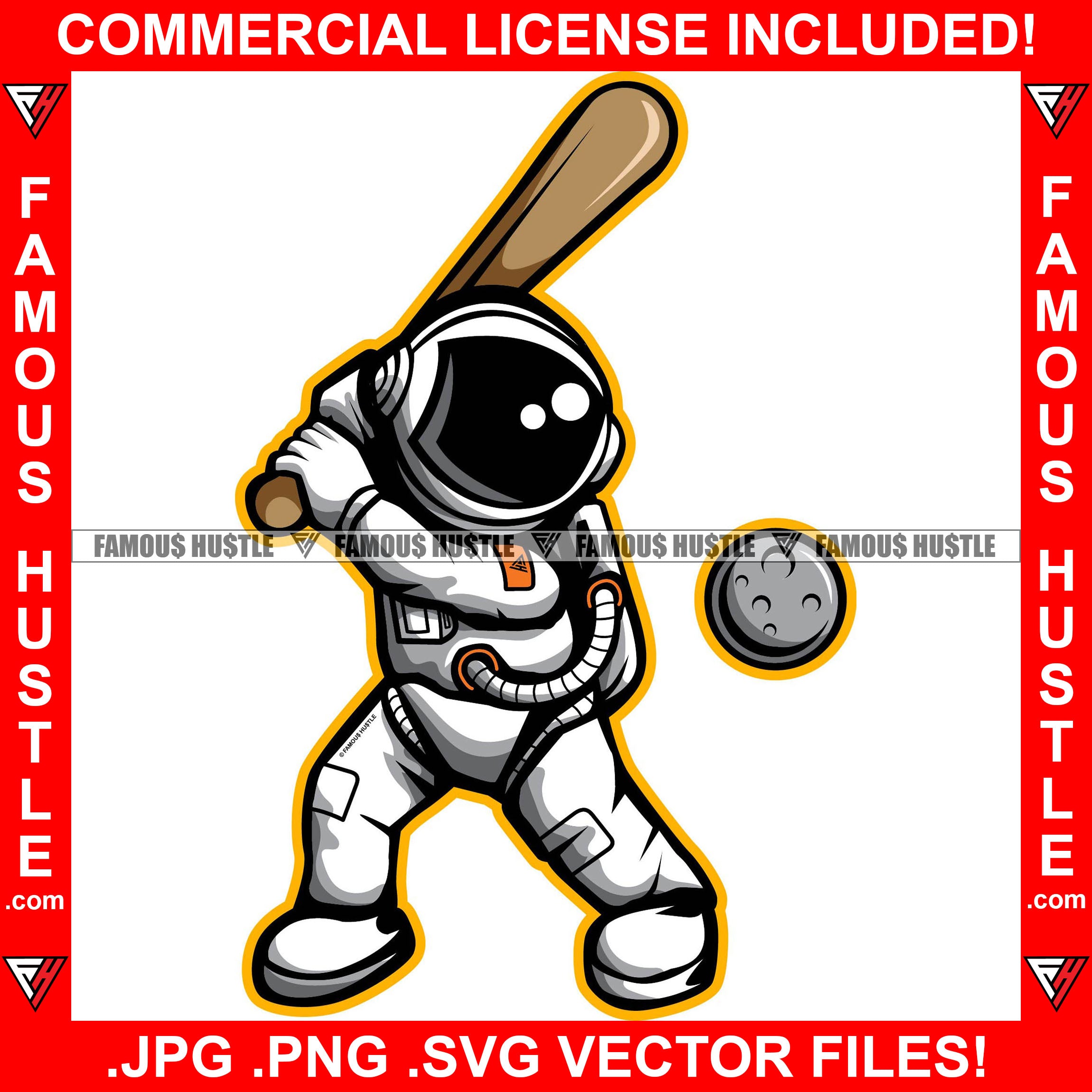 Famous Hustle Astronaut In Outer Space Suit Playing Baseball Bat With Moon Hip Hop Rap Rapper Plug Trap Street Hood Ghetto Swag Thug Hustler Hustling Baller Trapper Art Graphic Design Logo T-Shirt Print Printing JPG PNG SVG Vector Cut File