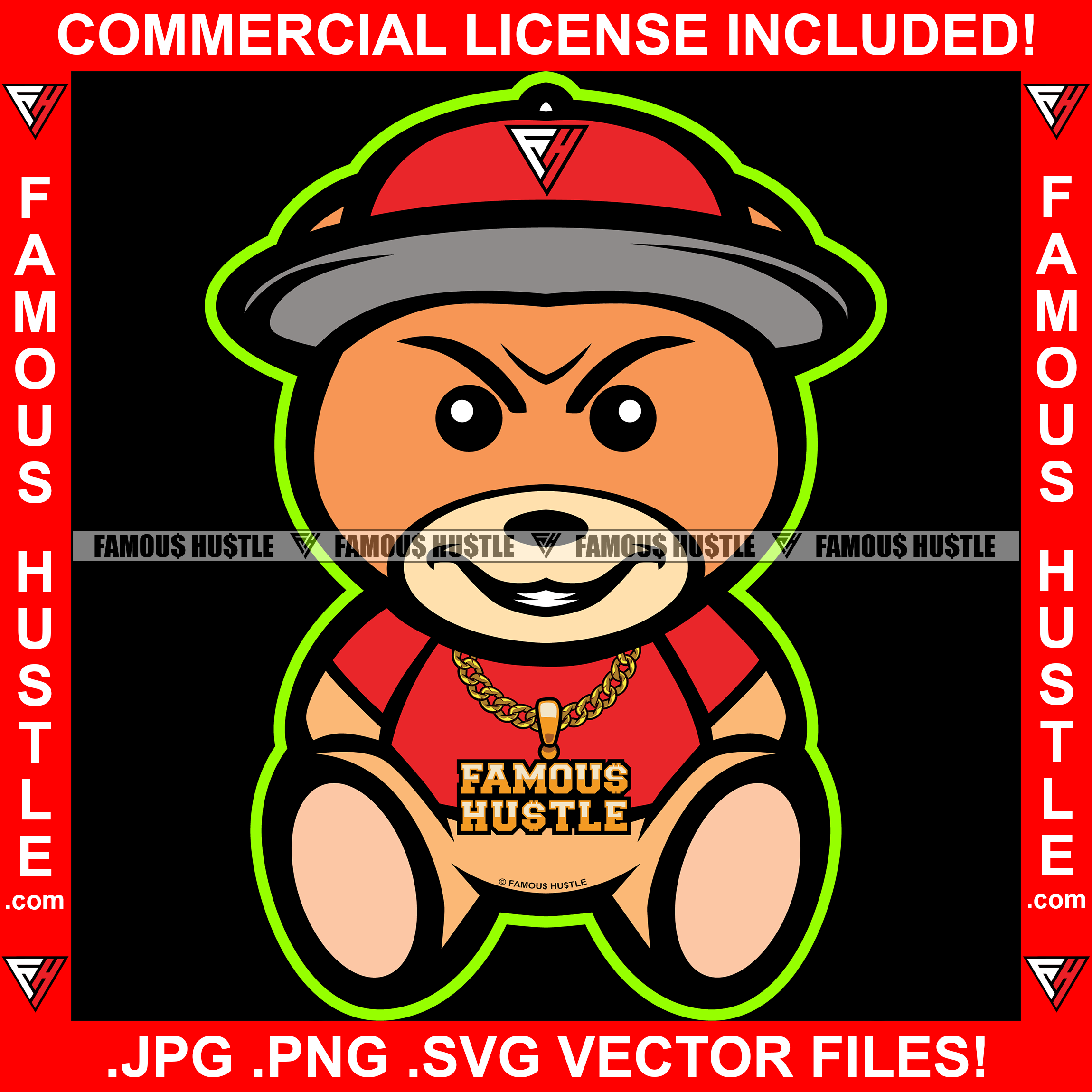 Famous Hustle Dripping Teddy Bear Mean Face Red Cap Gold Jewelry Necklace Hip Hop Rap Rapper Plug Trap Swag Thug Hustler Hustling Drip Rich Art Graphic Design Logo T-Shirt Print Printing JPG PNG SVG Vector Cut File