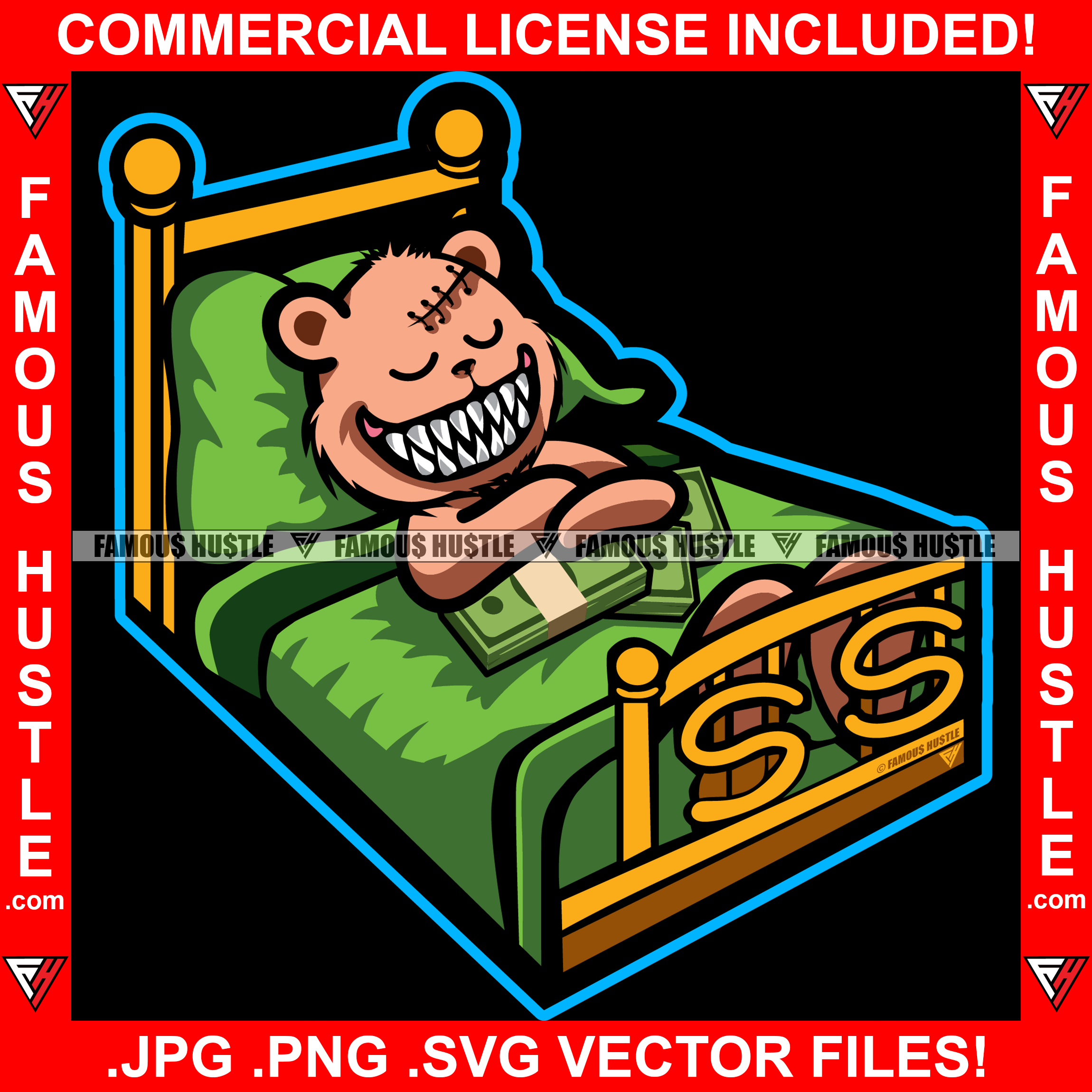 Famous Hustle Drugs Teddy Bear Scar Stitches In Bed Eyes Wide Open Holding Cash Money Hip Hop Rap Plug Trap Street Hood Ghetto Thug Hustler Hustling Famous Hustle Art Graphic Design Logo T-Shirt Print Printing JPG PNG SVG Vector Cut File