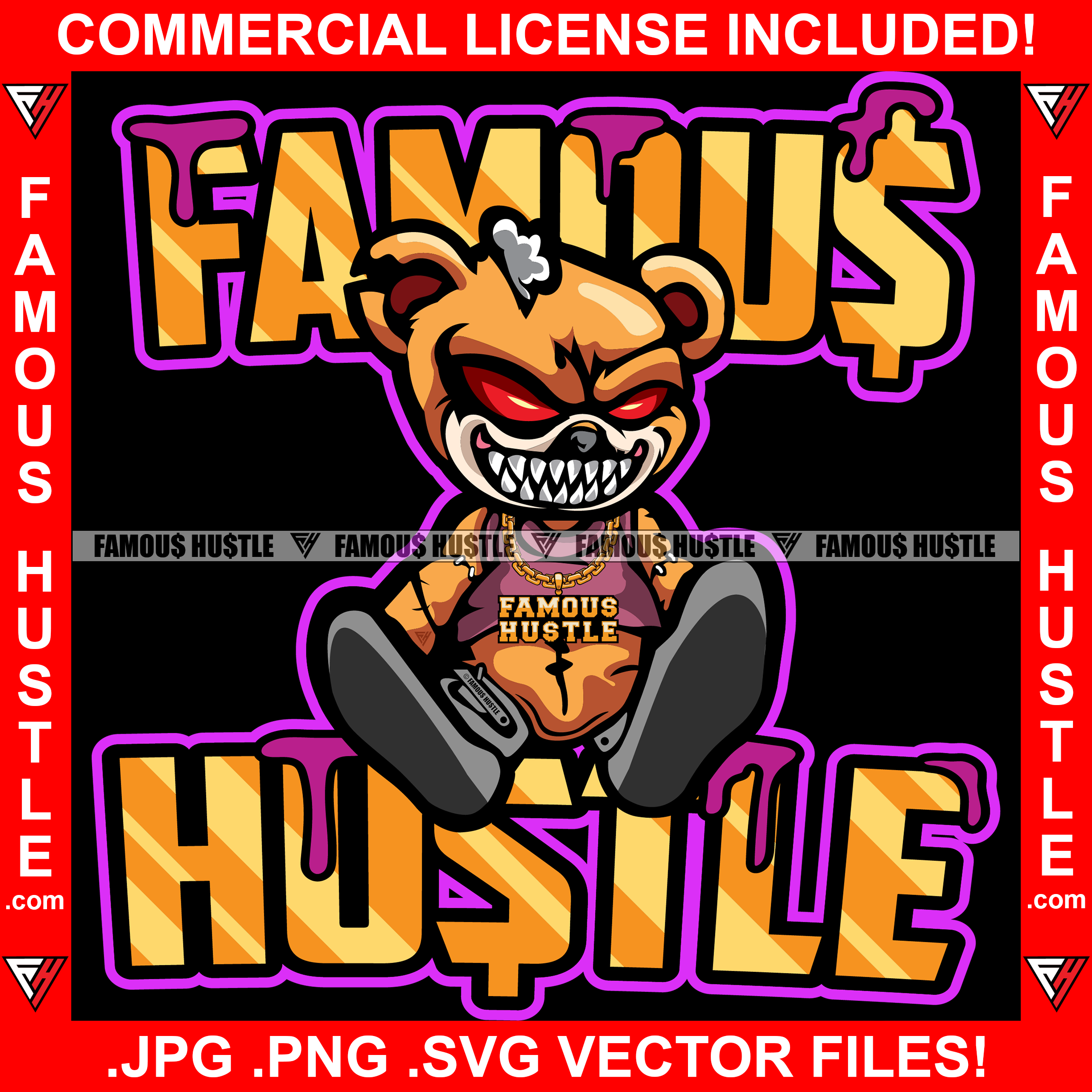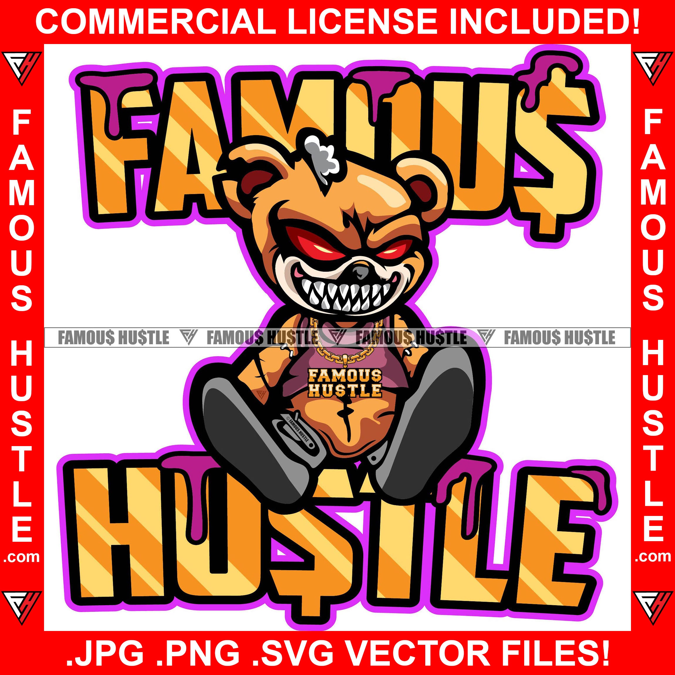 Famous Hustle Gangster Horror Teddy Bear Dripping Red Eyes Sharp Teeth Gold Necklace Jewelry Hip Hop Rap Plug Trap Hood Ghetto Swag Thug Hustler Hustling Baller Trapper Quote Art Graphic Design Logo T-Shirt Print Printing JPG PNG SVG Vector Cut File