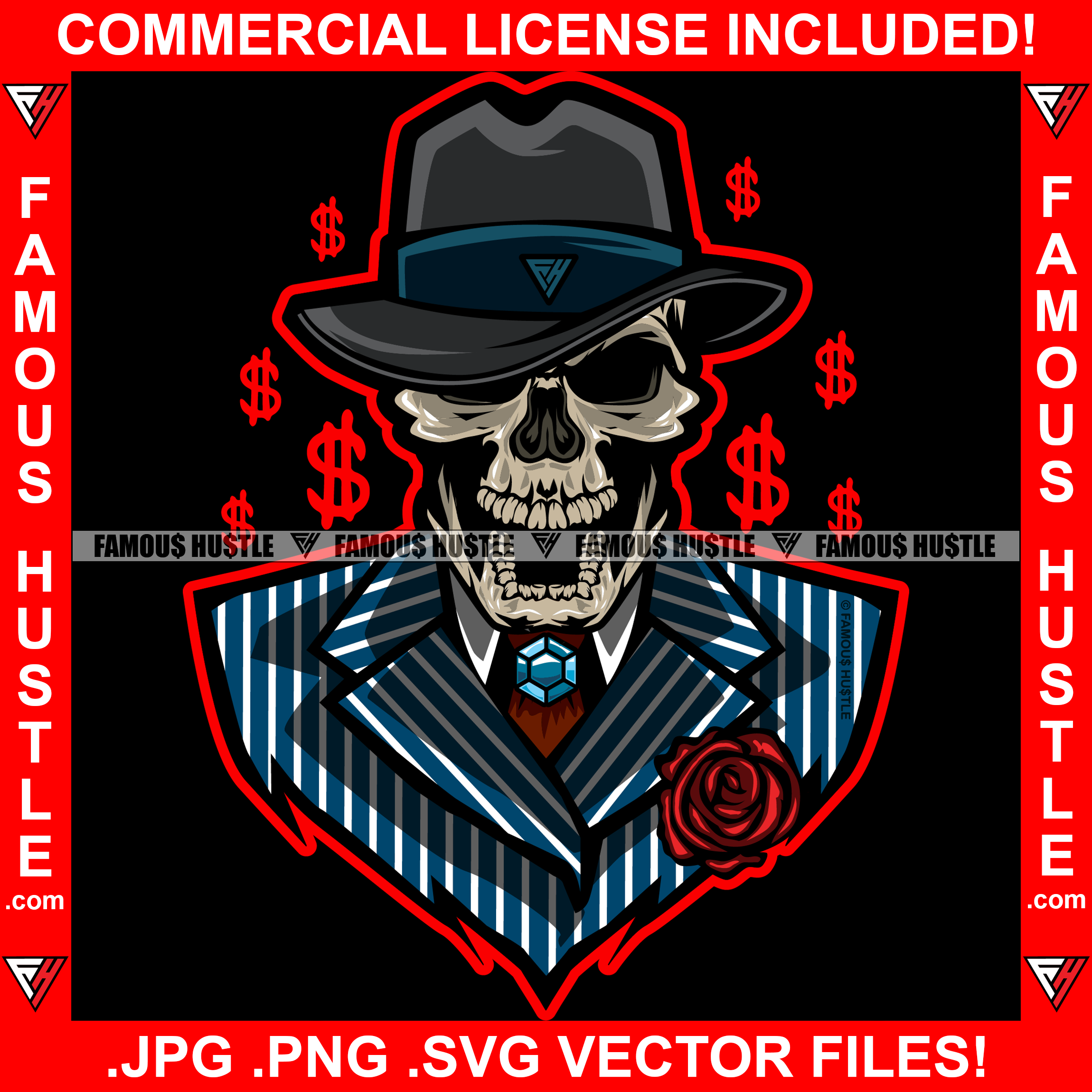 Famous Hustle Gangster Skull Face Boss Angry Black Dress Hat Rose Dollar Sign Diamond Tie Hip Hop Rap Plug Trap Street Hood Ghetto Swag Thug Hustler Hustling Baller Trapper Art Graphic Design Logo T-Shirt Print Printing JPG PNG SVG Vector Cut File
