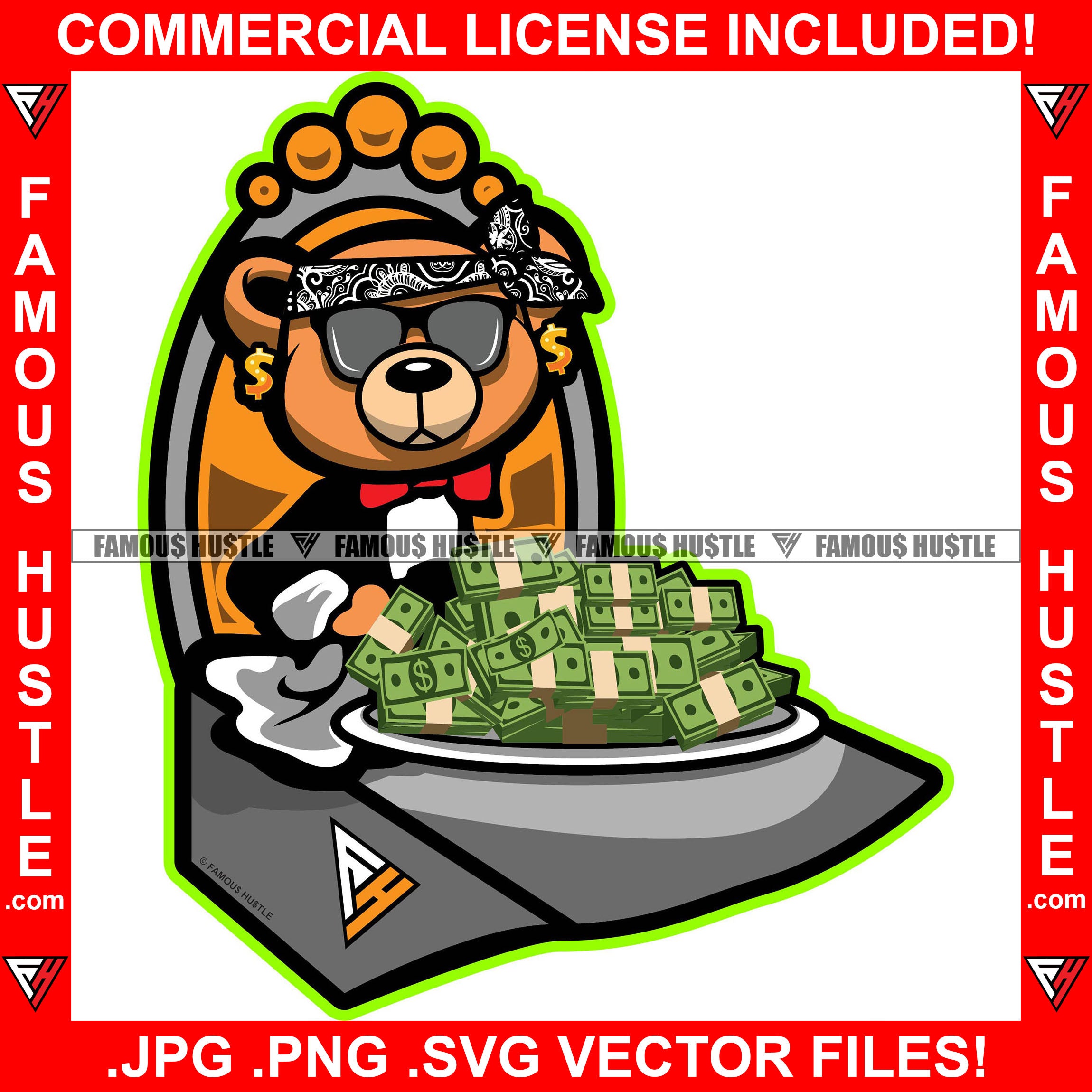 Famous Hustle Gangster Teddy Bear Head Bandanna Black Glasses Dollar Sign Earrings Cash Money Plate Full Hip Hop Rap Plug Trap Street Hood Ghetto Swag Thug Hustler Trapper Art Graphic Design Logo T-Shirt Print Printing JPG PNG SVG Vector Cut File