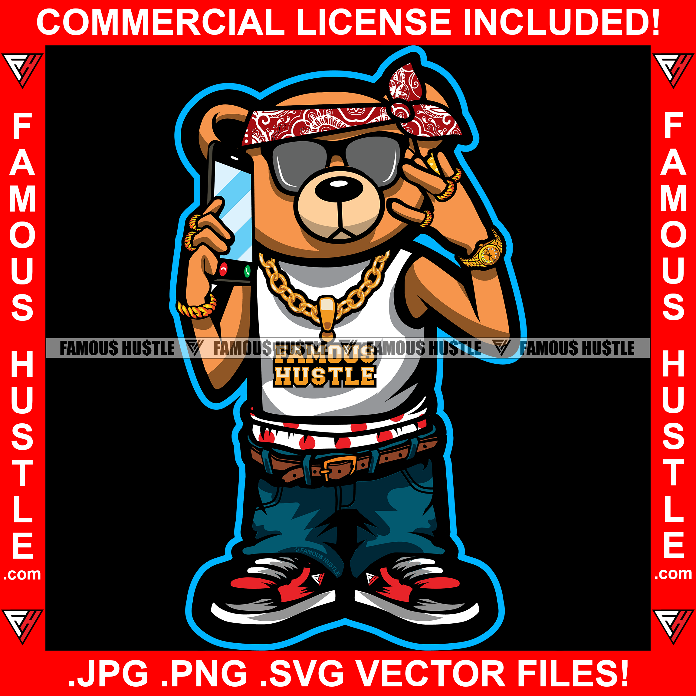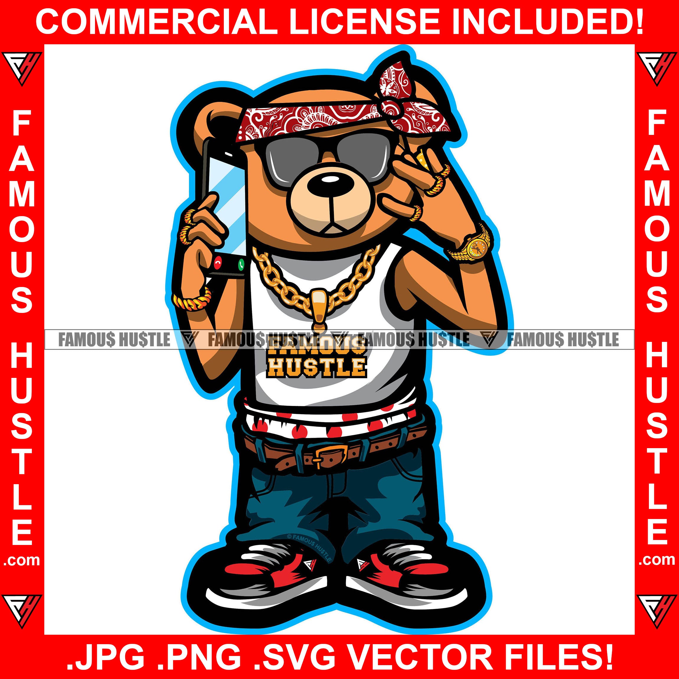 Famous Hustle Gangster Teddy Bear Head Bandanna Sunglasses Gold Jewelry Necklace Mobile Phone Hip Hop Rap Rapper Plug Trap Street Hood Ghetto Thug Savage Hustler Thug Gang Art Graphic Design Logo T-Shirt Print Printing JPG PNG SVG Vector Cut File