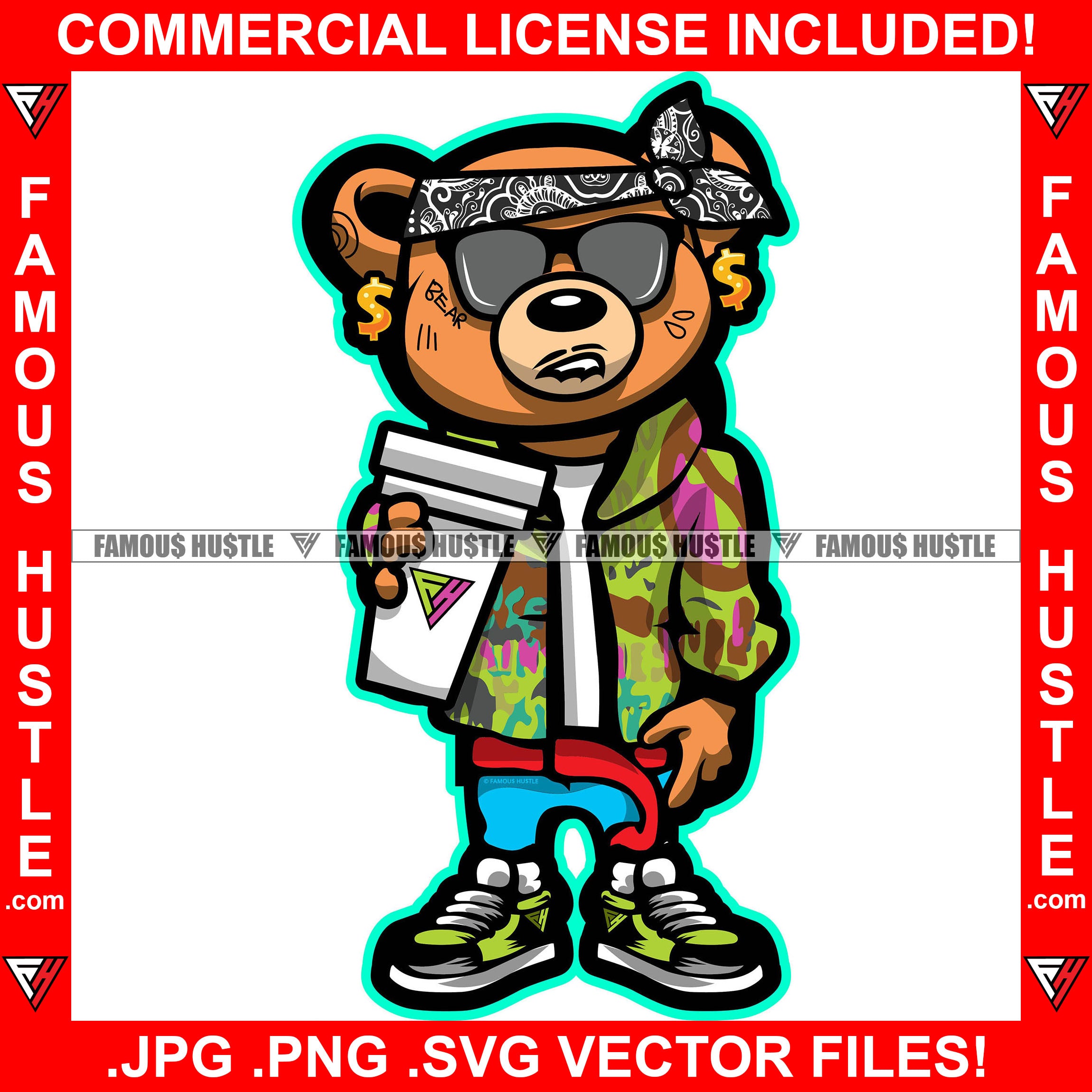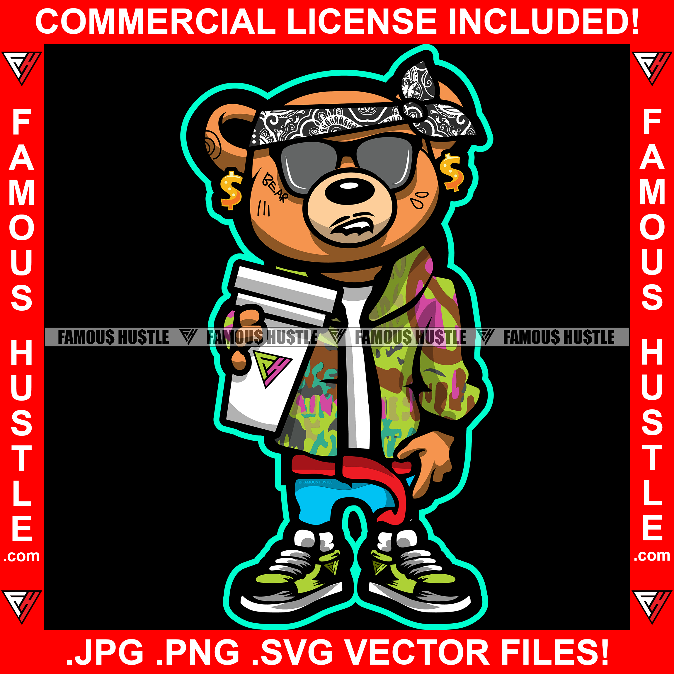 Famous Hustle Gangster Teddy Bear Head Paisley Bandanna Sunglasses Dollar Sign Earrings Drinking Liquid Thug Hitman Gold Jewelry Hustler Hustling Mafia Mob Trap Art Graphic Design Logo T-Shirt Print Printing JPG PNG SVG Vector Cut File