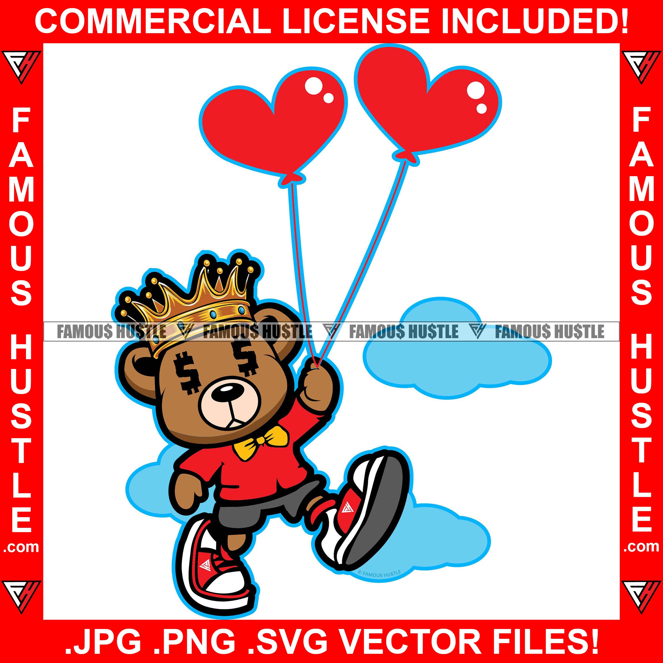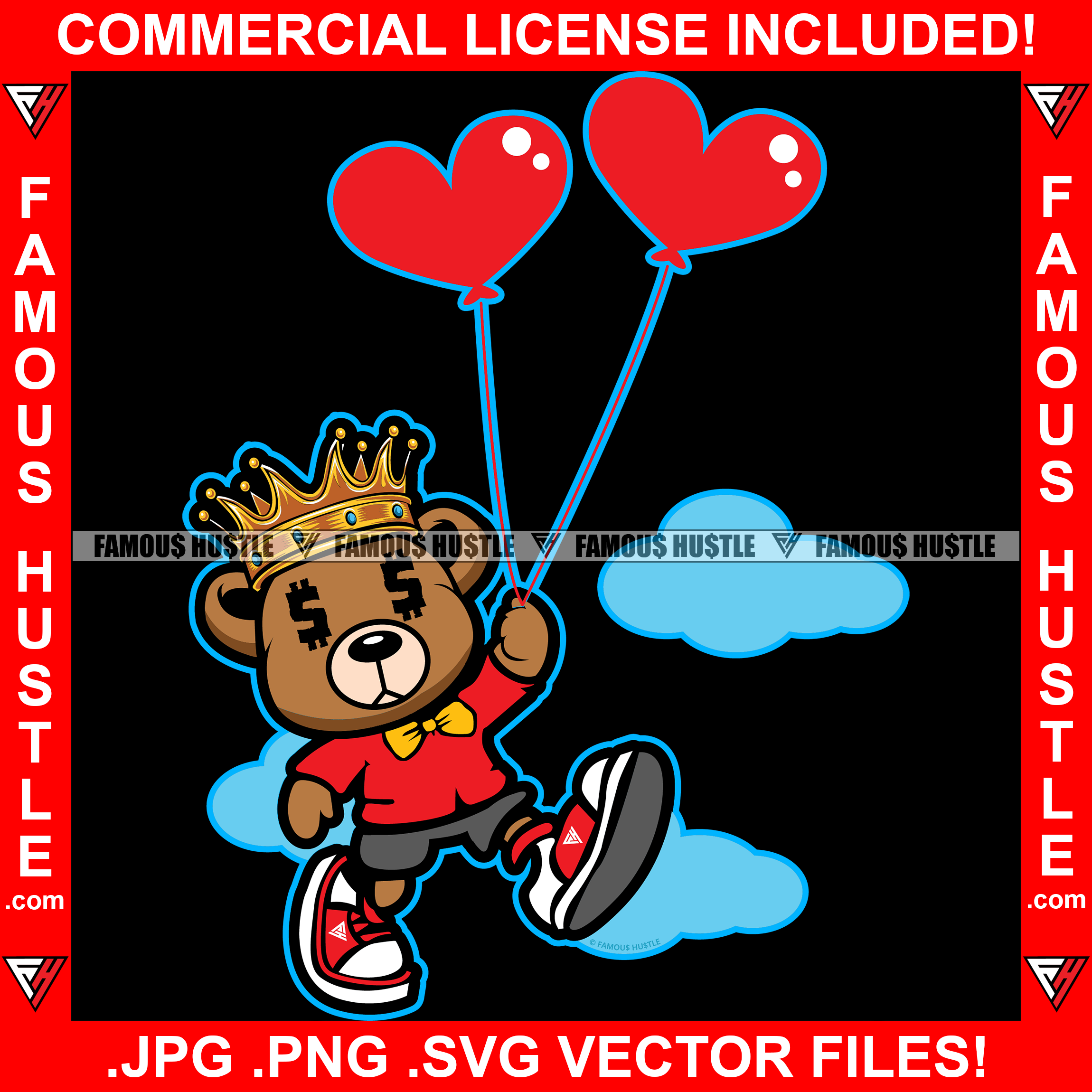Famous Hustle Teddy Bear King Dollar Sign Eyes Flying In Clouds Red Heart Balloons Money Love Heart Hip Hop Rap Plug Trap Swag Thug Hustler Hustling Drip Rich Art Graphic Design Logo T-Shirt Print Printing JPG PNG SVG Vector Cut File