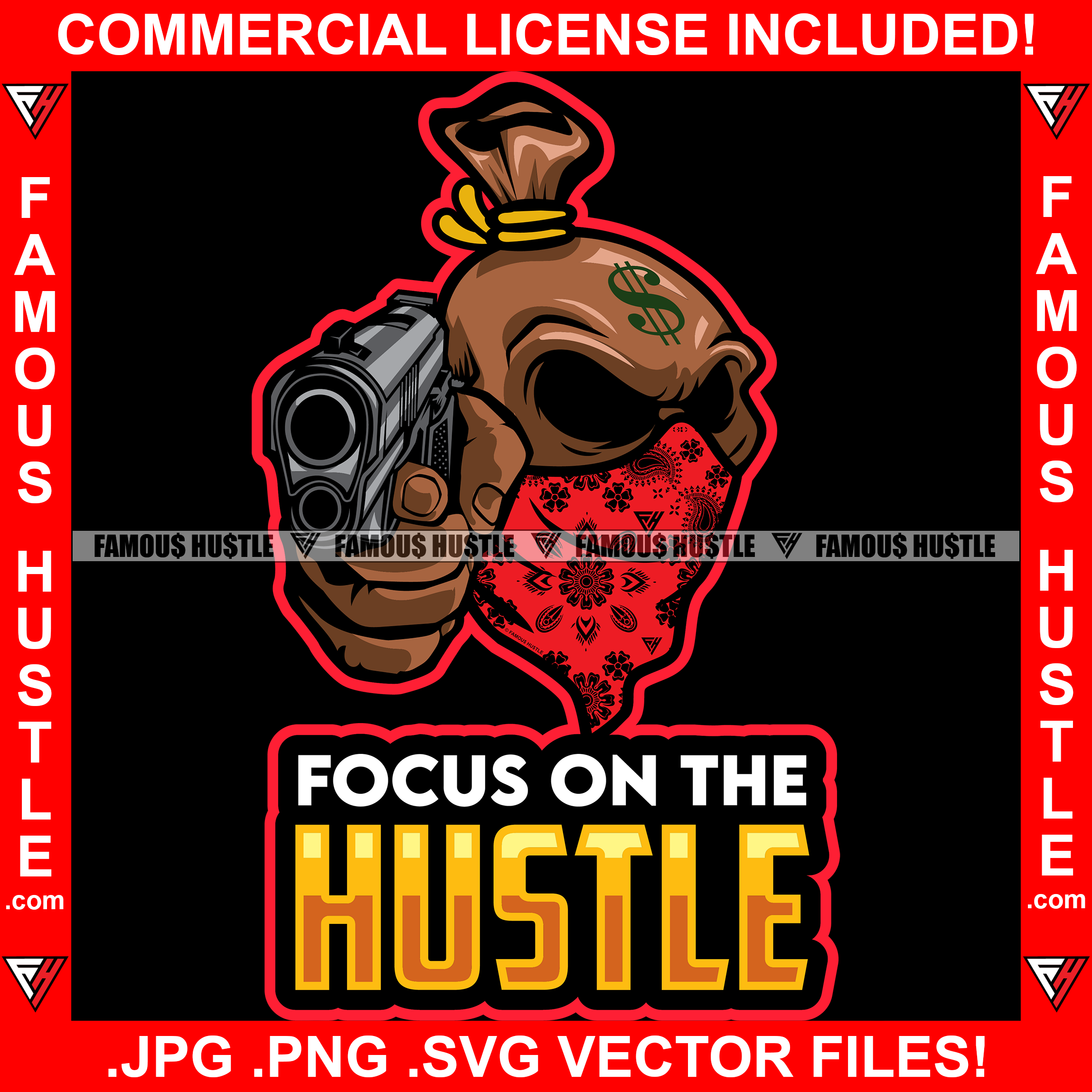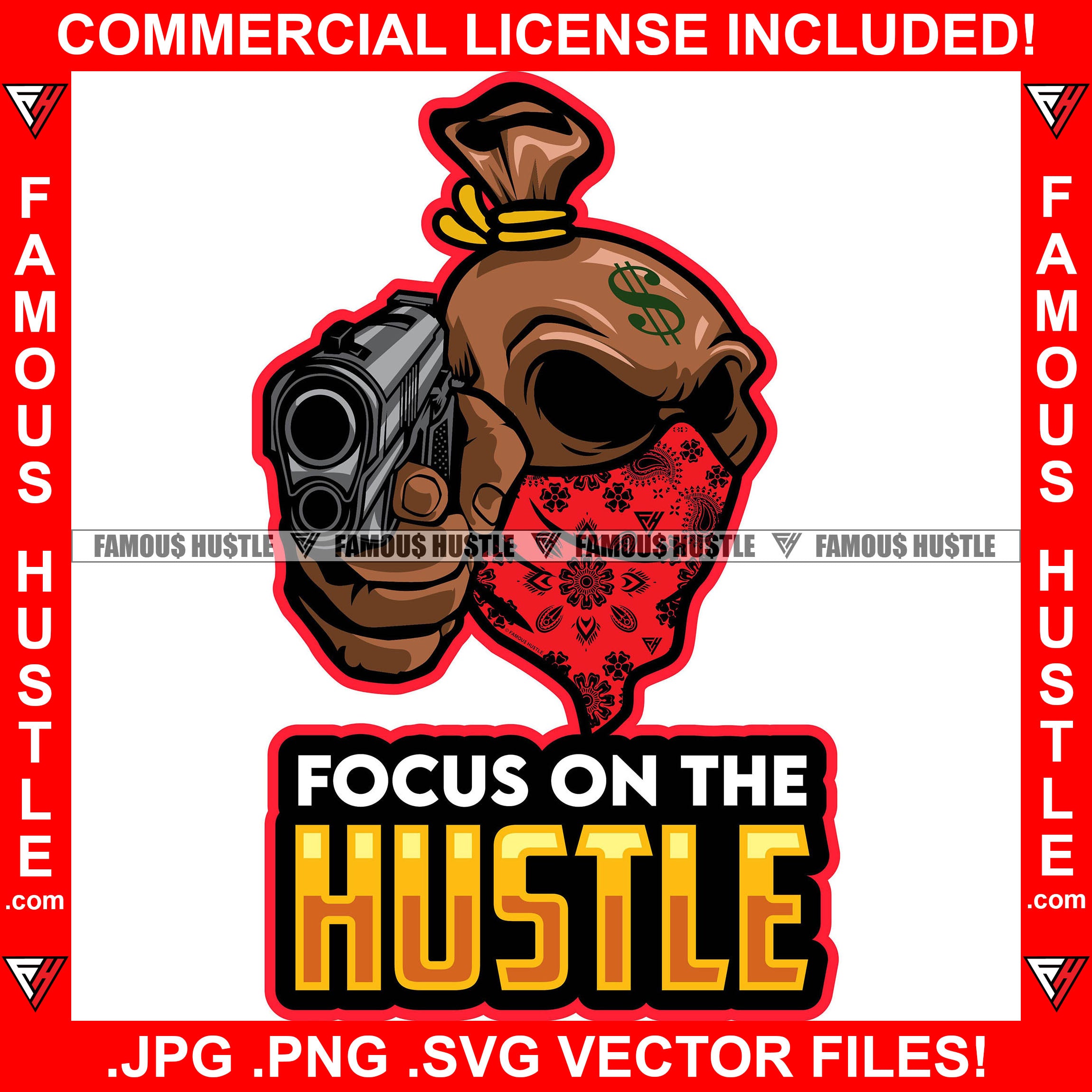 Focus On The Hustle Famous Hustle Gangster Cash Money Bag Cartoon Character Gun Mean Angry Face Bandanna Dollar Sign Hustler Hustling Quote Trap Trapper Gangsta Art Graphic Design Logo T-Shirt Print Printing JPG PNG SVG Vector Cut File