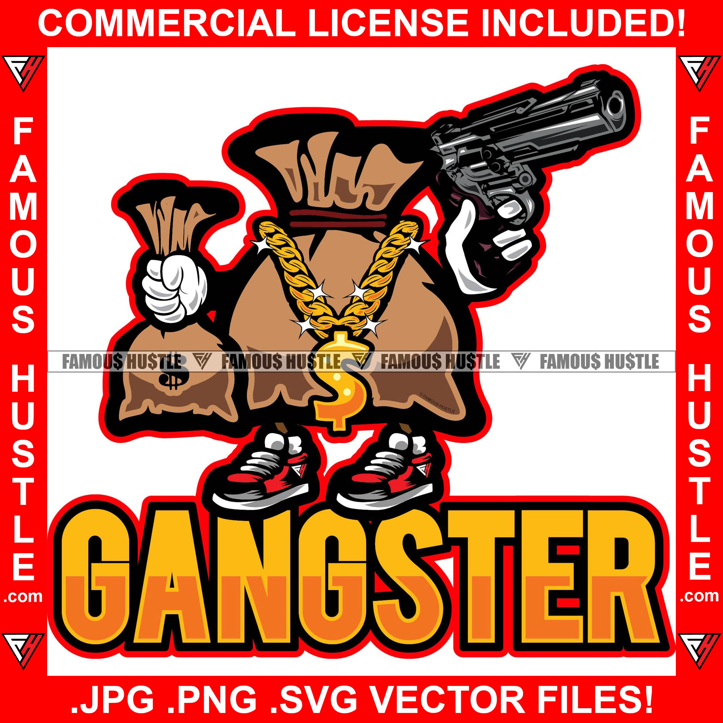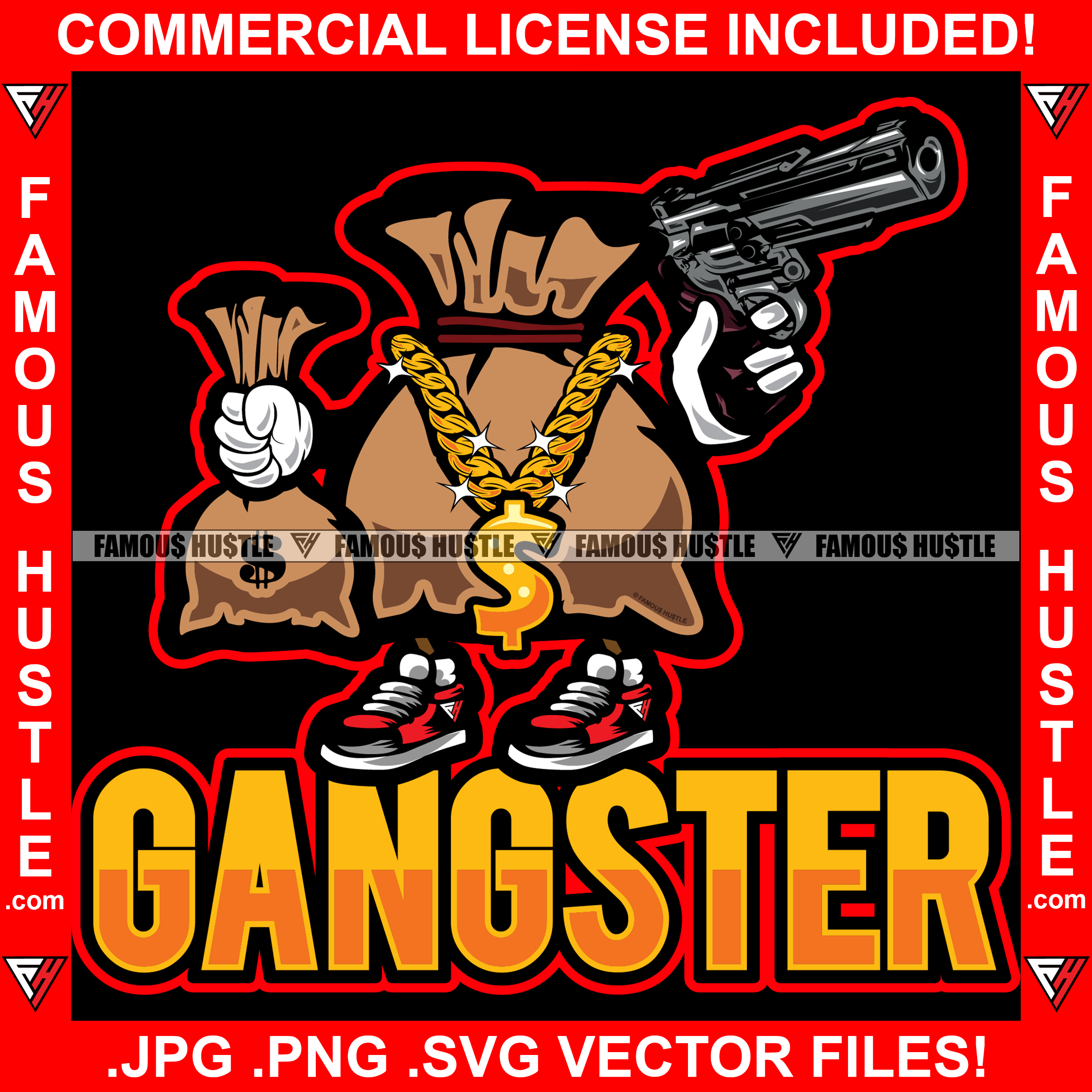 Gangster Cash Money Bag Cartoon Character Gold Dollar Sign Necklace Pistol Gun Sneakers Hip Hop Rap Trap Street Hood Swag Thug Hustler Hustling Famous Hustle Baller Trapper Quote Art Graphic Design Logo T-Shirt Print Printing JPG PNG SVG Vector Cut File