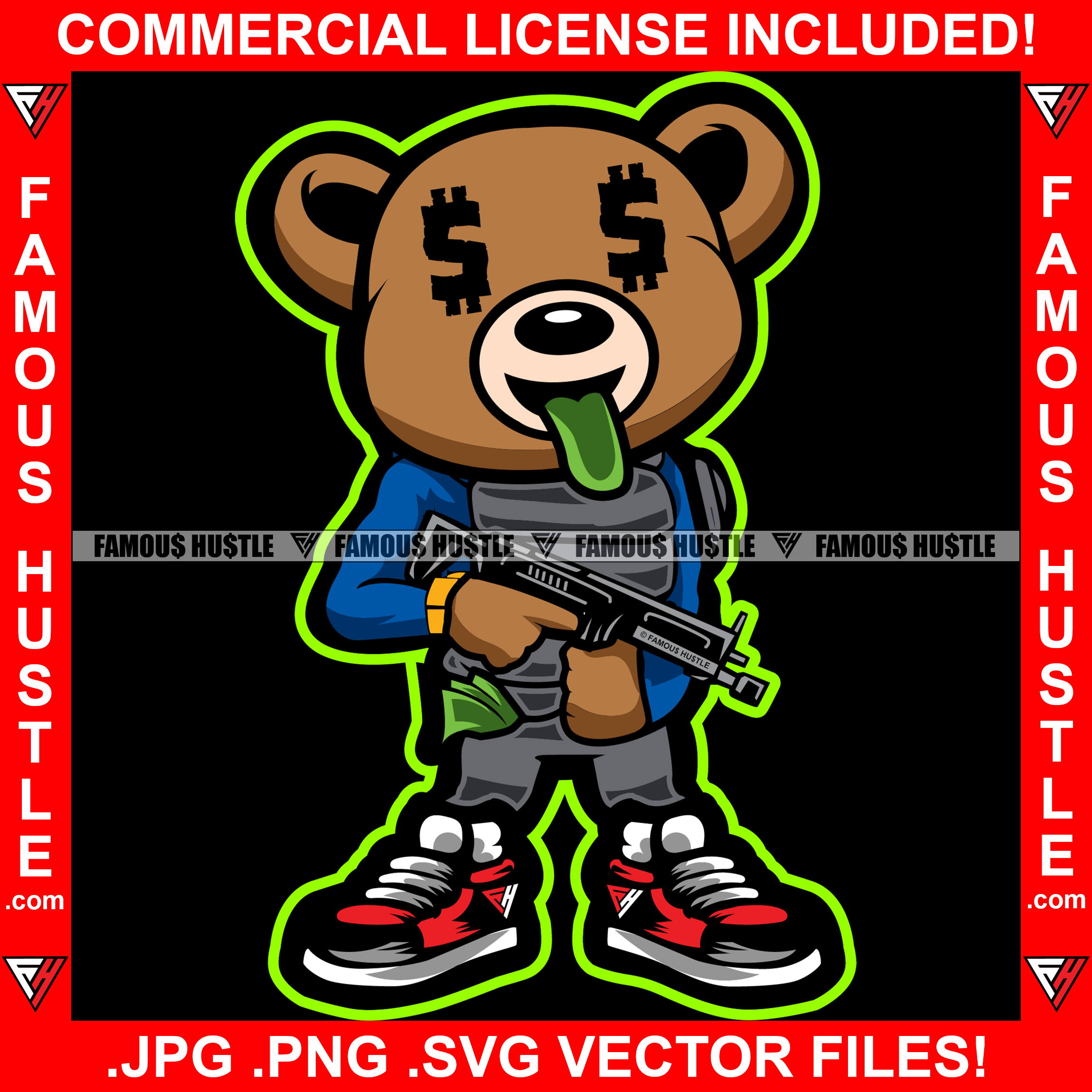 Gangster Teddy Bear Dollar Sign Eyes Green Sticky Tongue Out Machine Gun Sneakers Hip Hop Rap Plug Trap Hood Ghetto Swag Thug Hustler Hustling Famous Hustle Baller Trapper Art Graphic Design Logo T-Shirt Print Printing JPG PNG SVG Vector Cut File