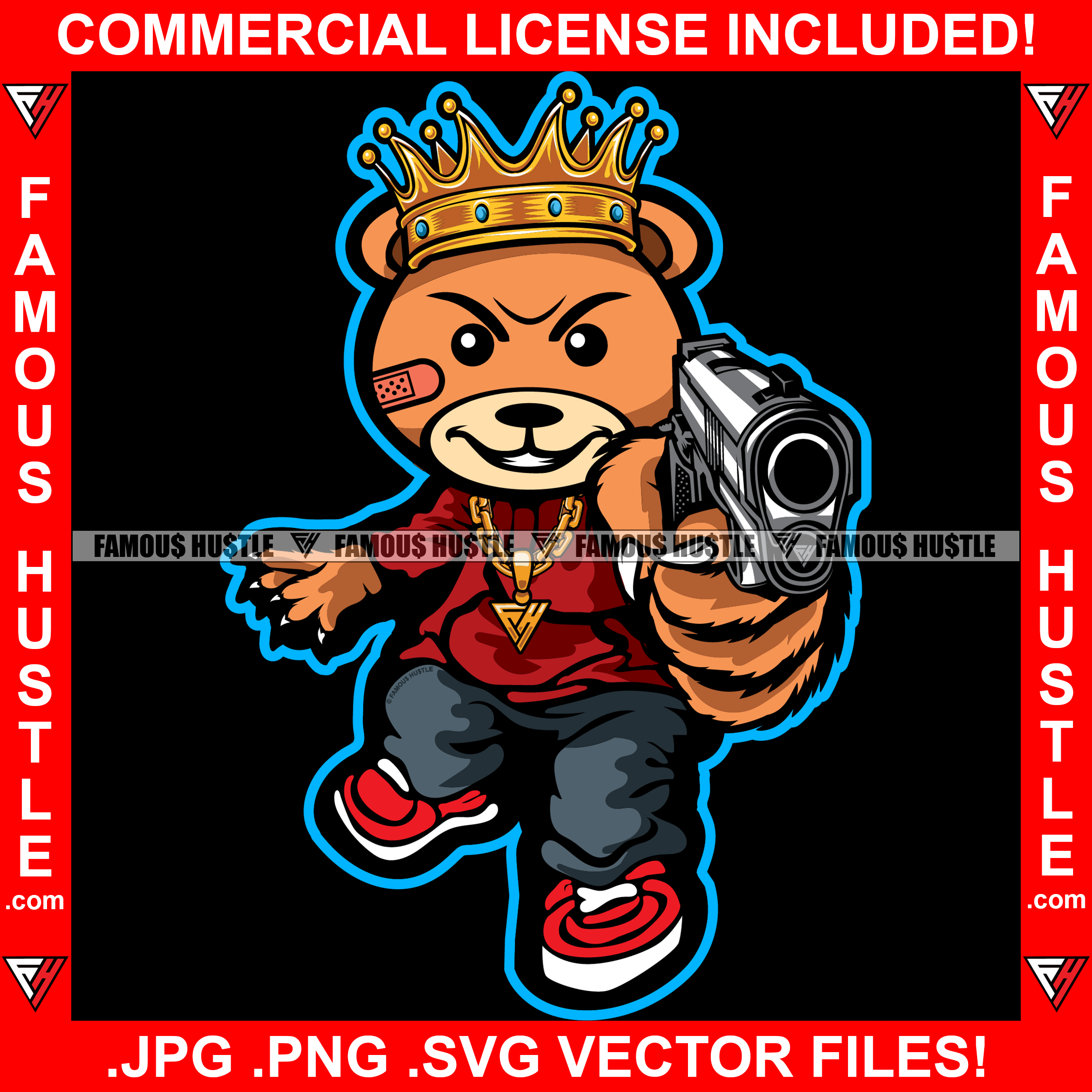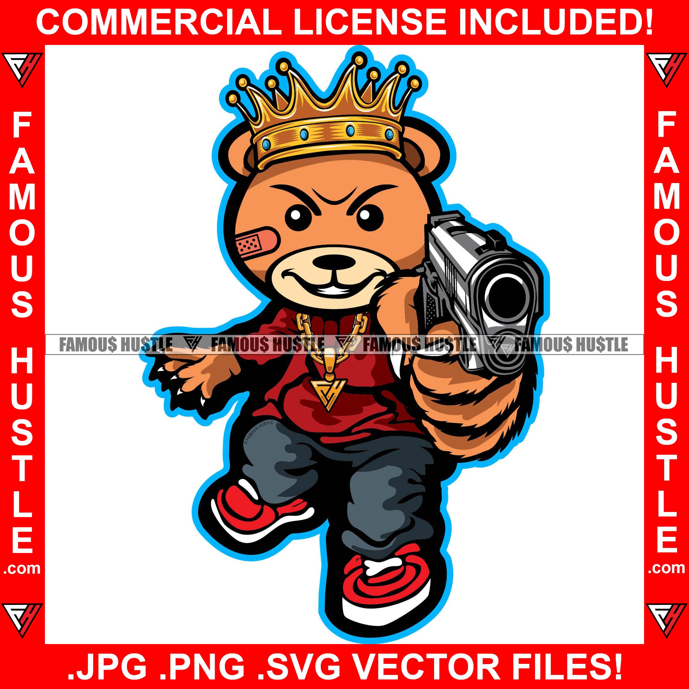 King Gangster Teddy Bear Mean Face Gold Necklace Pistol Gun Sneakers Hip Hop Rap Rapper Plug Trap Street Hood Ghetto Swag Thug Hustler Hustling Famous Hustle Baller Trapper Art Graphic Design Logo T-Shirt Print Printing JPG PNG SVG Vector Cut File