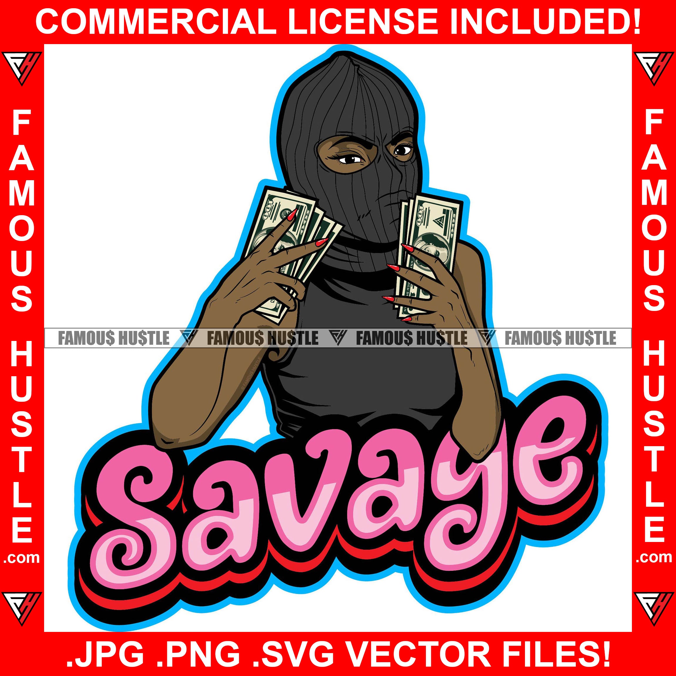 Savage Black Sexy Gangster Lady Female Ski Mask Victory Sign Cash Money Hands Hip Hop Rap Plug Trap Street Hood Ghetto Swag Thug Hustler Hustling Famous Hustle Quote Art Graphic Design Logo T-Shirt Print Printing JPG PNG SVG Vector Cut File