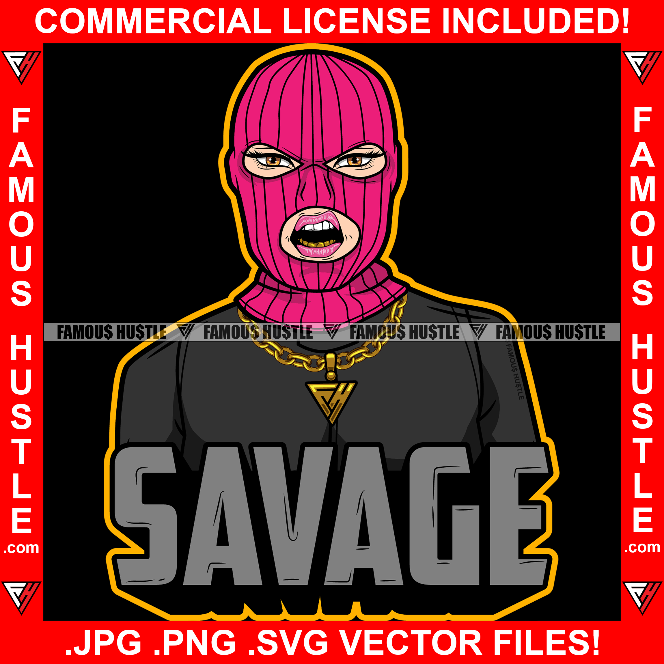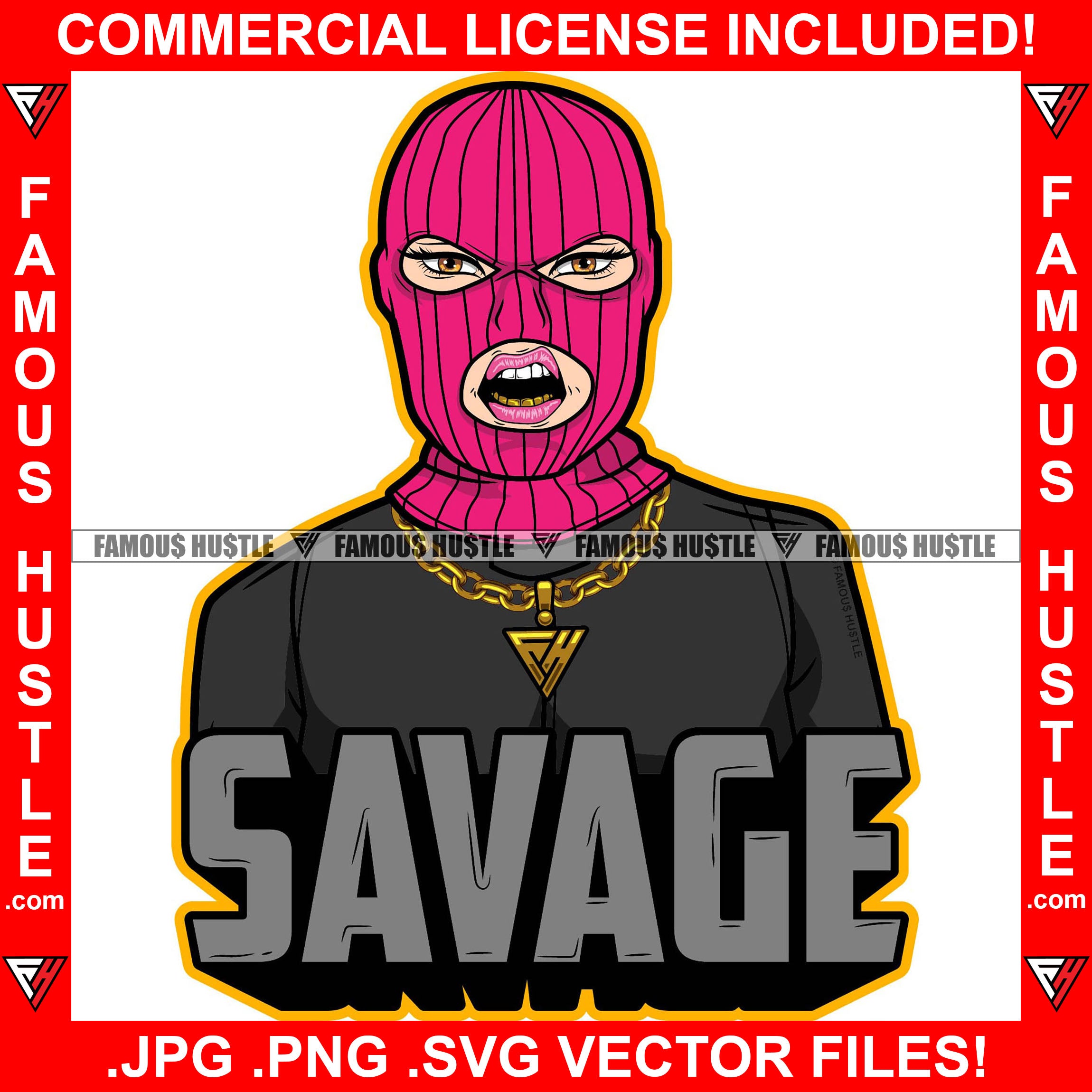 Savage Gangster Angry Lady Woman Pink Ski Mask Female Gold Jewelry Hip Hop Rap Rapper Plug Trap Street Hood Ghetto Swag Thug Hustler Hustling Famous Hustle Baller Trapper Quote Art Graphic Design Logo T-Shirt Print Printing JPG PNG SVG Vector Cut File
