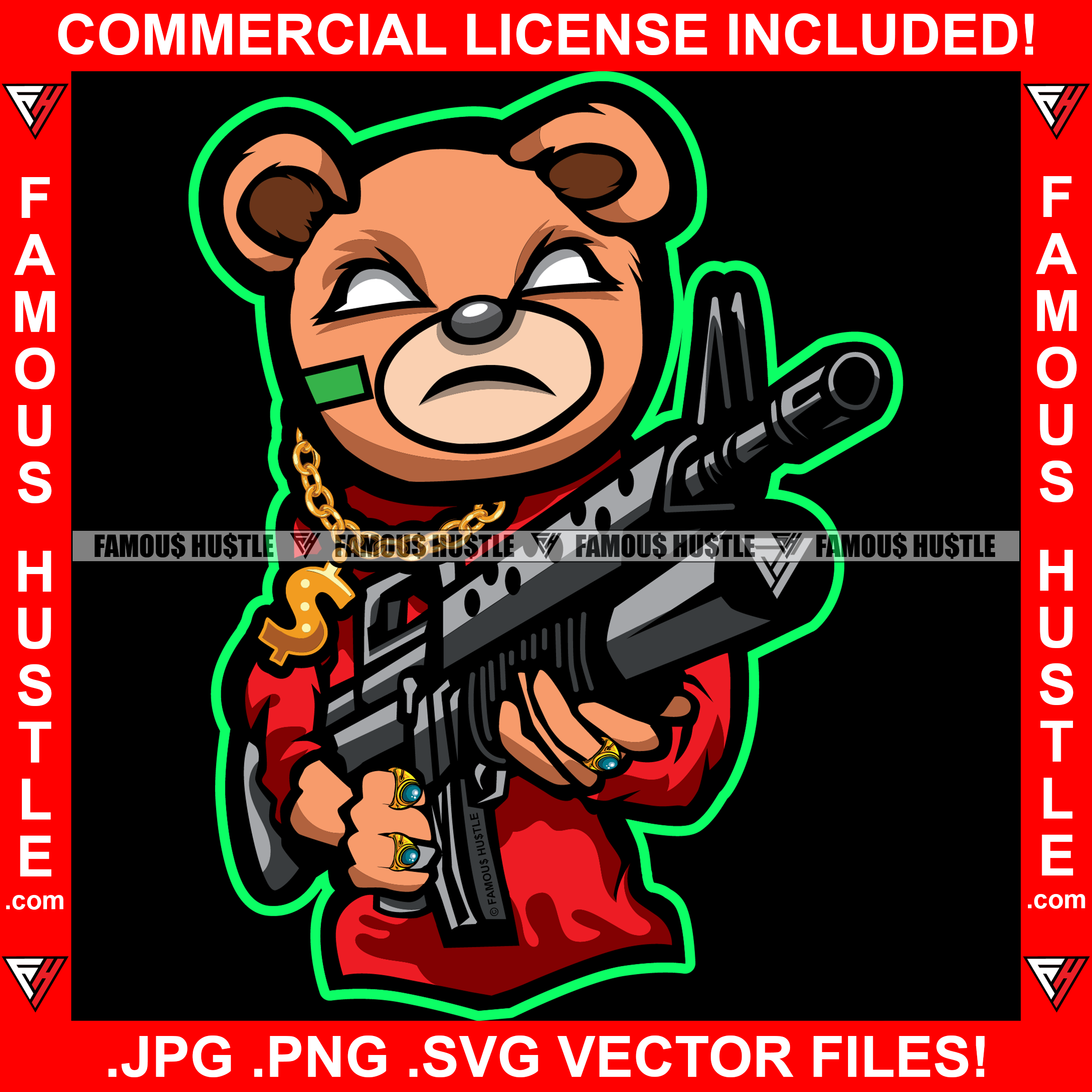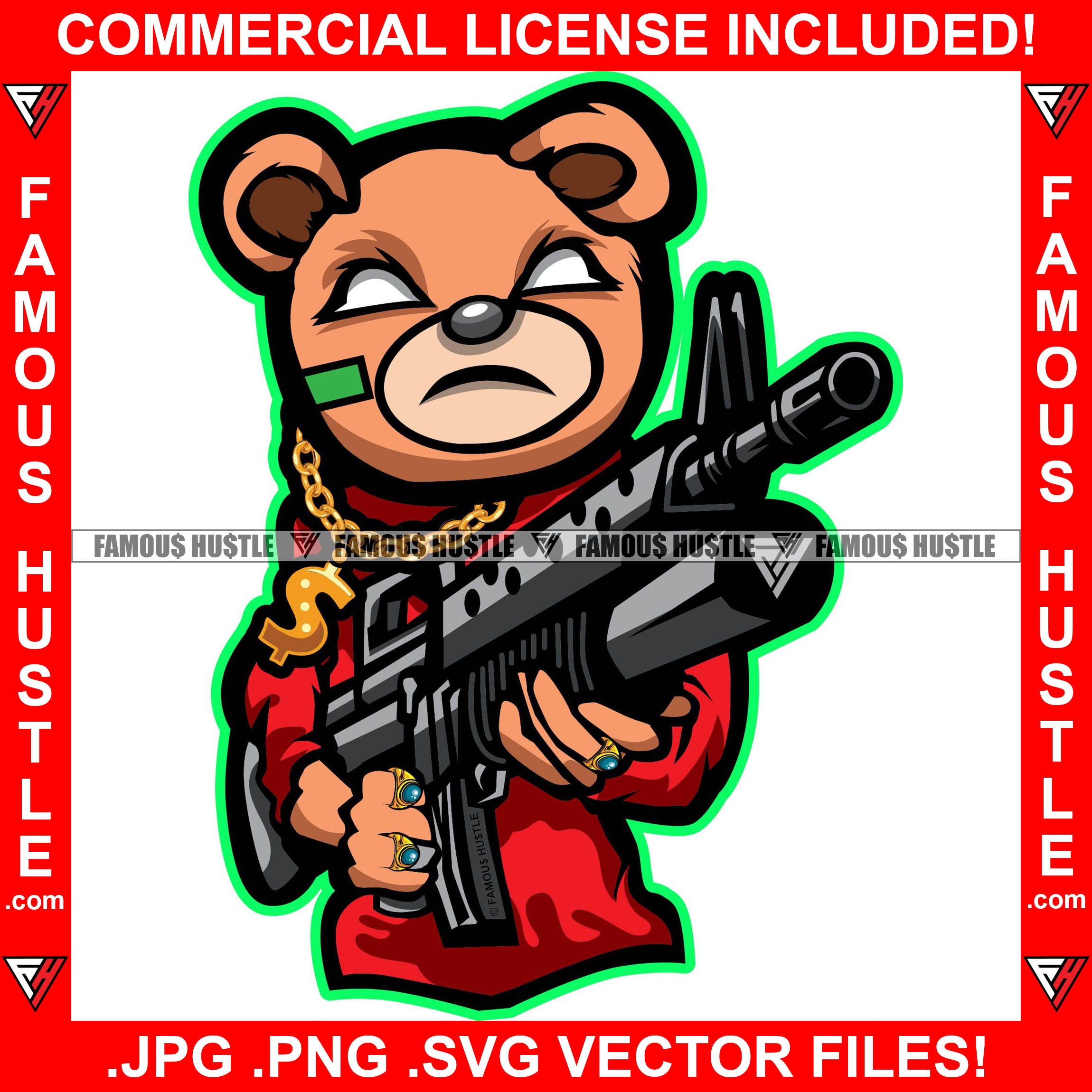 Savage Gangster Teddy Bear Drug Dealer Plug Mean Face White Eyes Two Machine Gun Gold Chain Necklace Jewelry Hip Hop Rap Trap Street Swag Hustler Hustling Drip Dripping Boss Art Graphic Design Print Printing Vector SVG Cut File