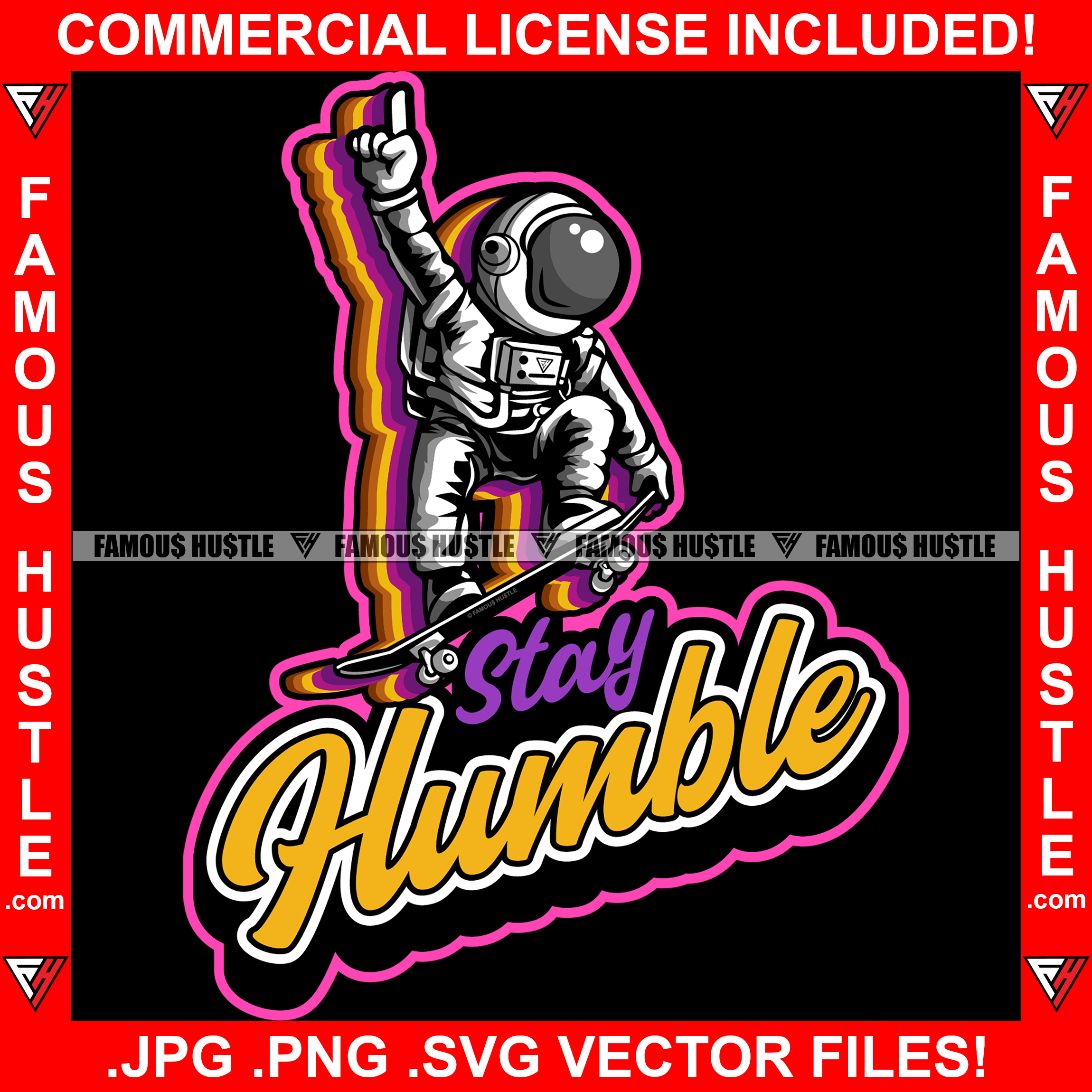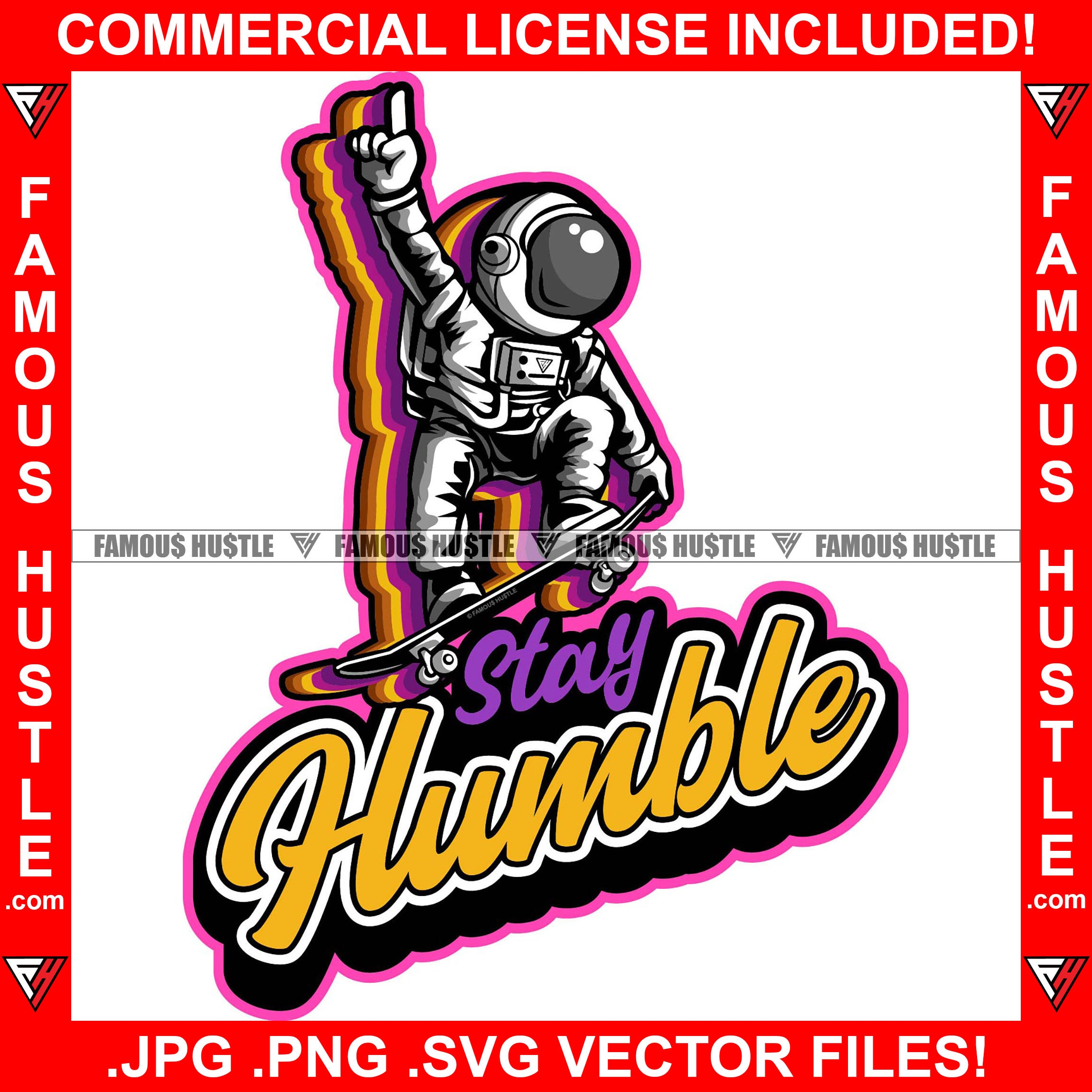 Stay Humble Famous Hustle Astronaut In Outer Space Suit Stakeboard Playing Hip Hop Rap Rapper Plug Trap Street Hood Ghetto Swag Thug Hustler Hustling Baller Trapper Quote Art Graphic Design Logo T-Shirt Print Printing JPG PNG SVG Vector Cut File