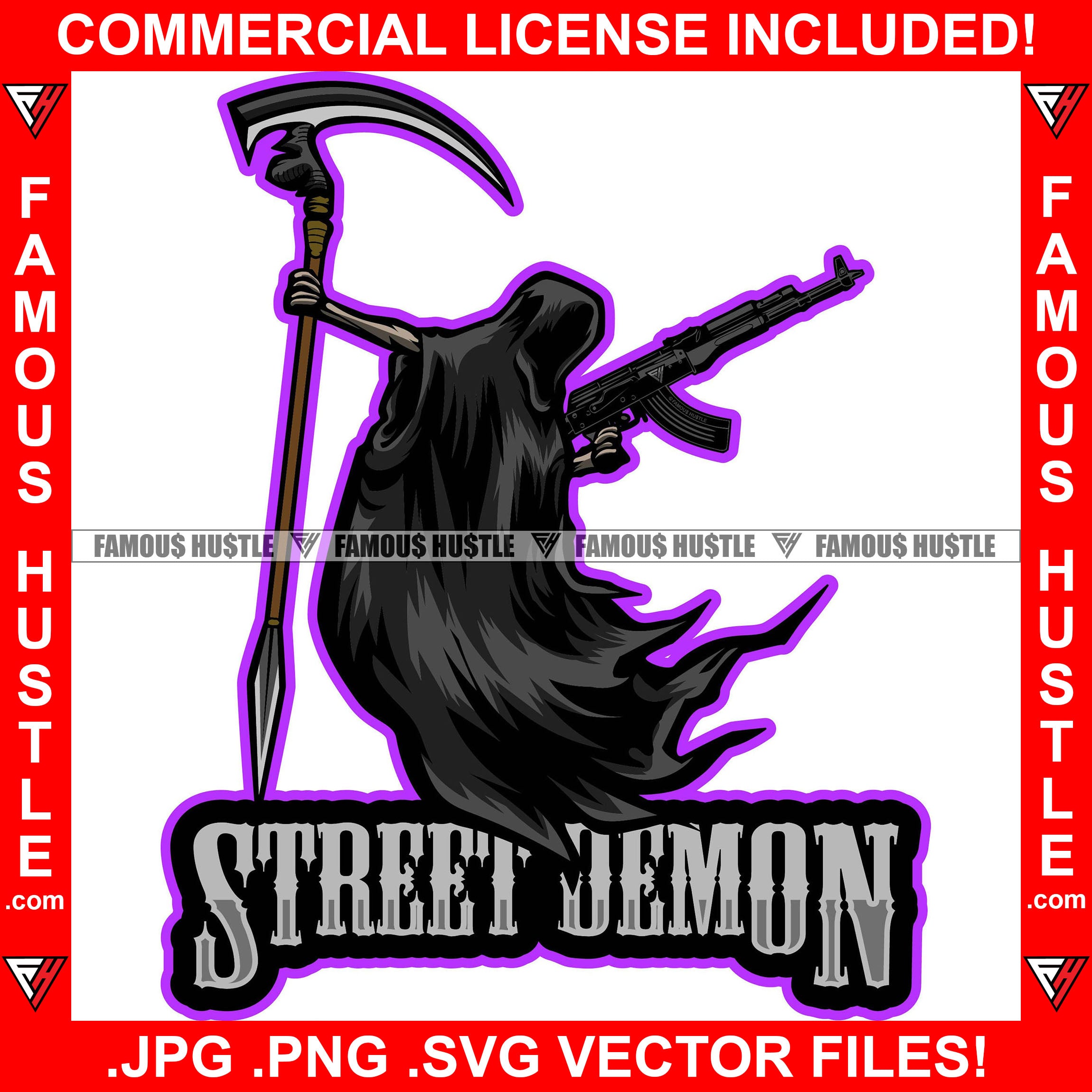 Street Demon Grim Reaper No Face Machine Gun Death Scythe Black Hip Hop Rap Rapper Plug Trap Street Hood Ghetto Swag Thug Hustler Hustling Famous Hustle Baller Trapper Quote Art Graphic Design Logo T-Shirt Print Printing JPG PNG SVG Vector Cut File