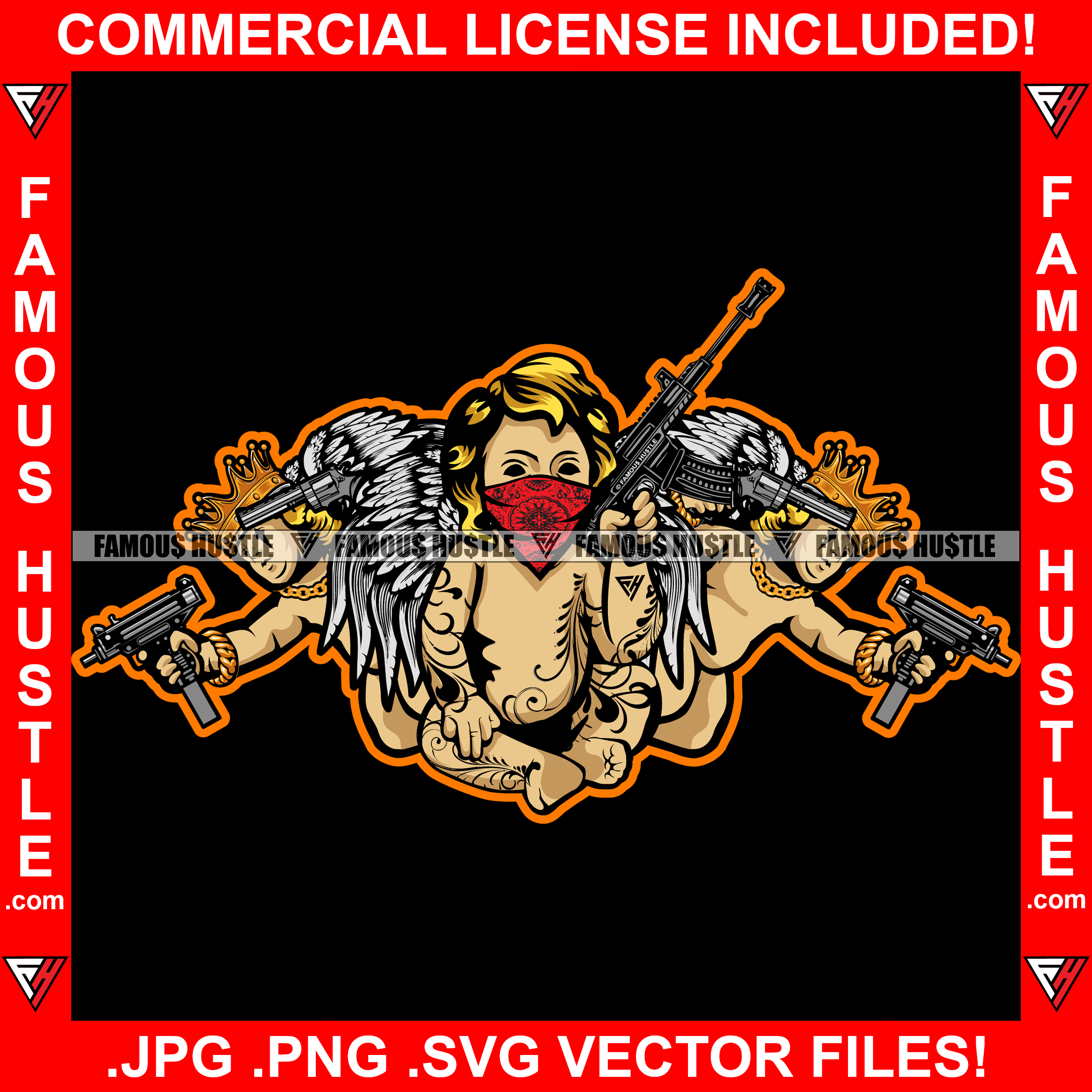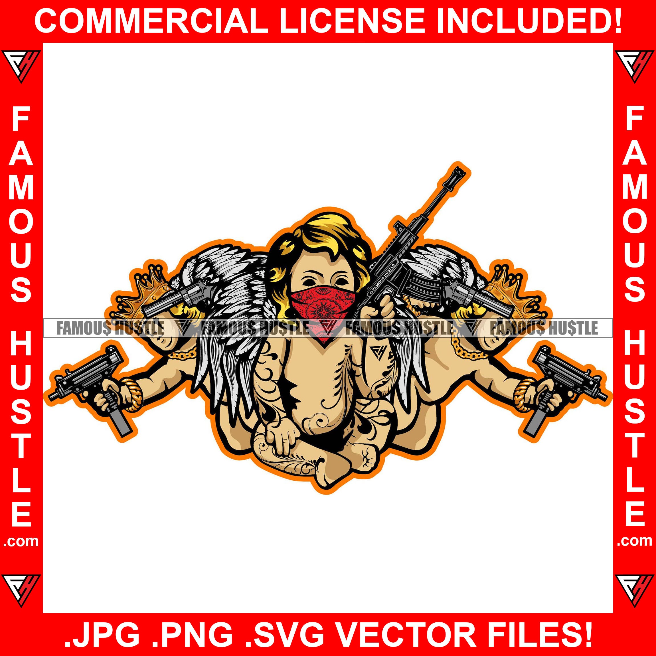 Street Religion Three Baby Hustle Gangster Statues Angel Wings Kings Face Bandanna Machine Guns Pistol Hip Hop Rap Rapper Plug Trap Street Hood Ghetto Thug Boss Drip Art Graphic Design Logo T-Shirt Print Printing JPG PNG SVG Vector Cut File