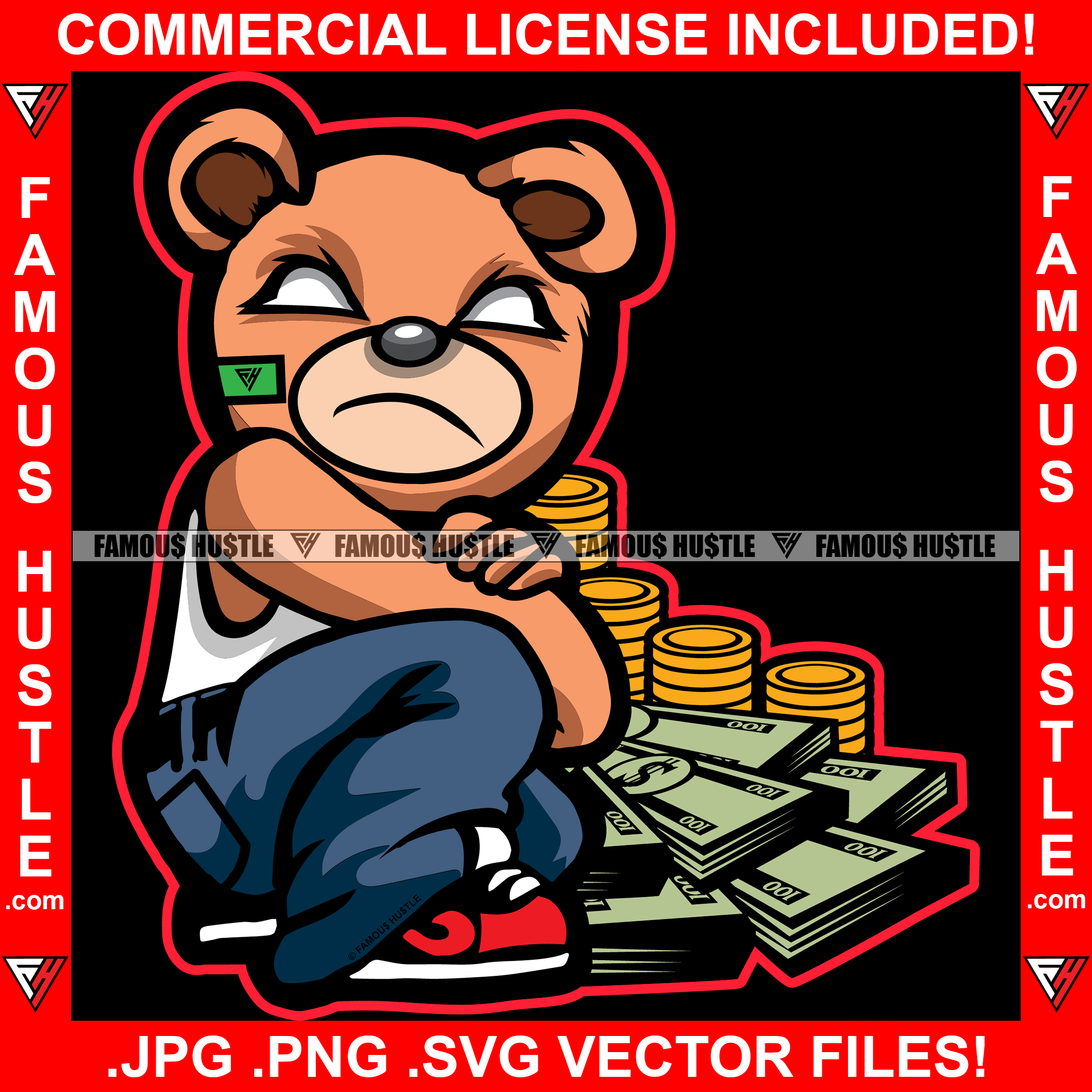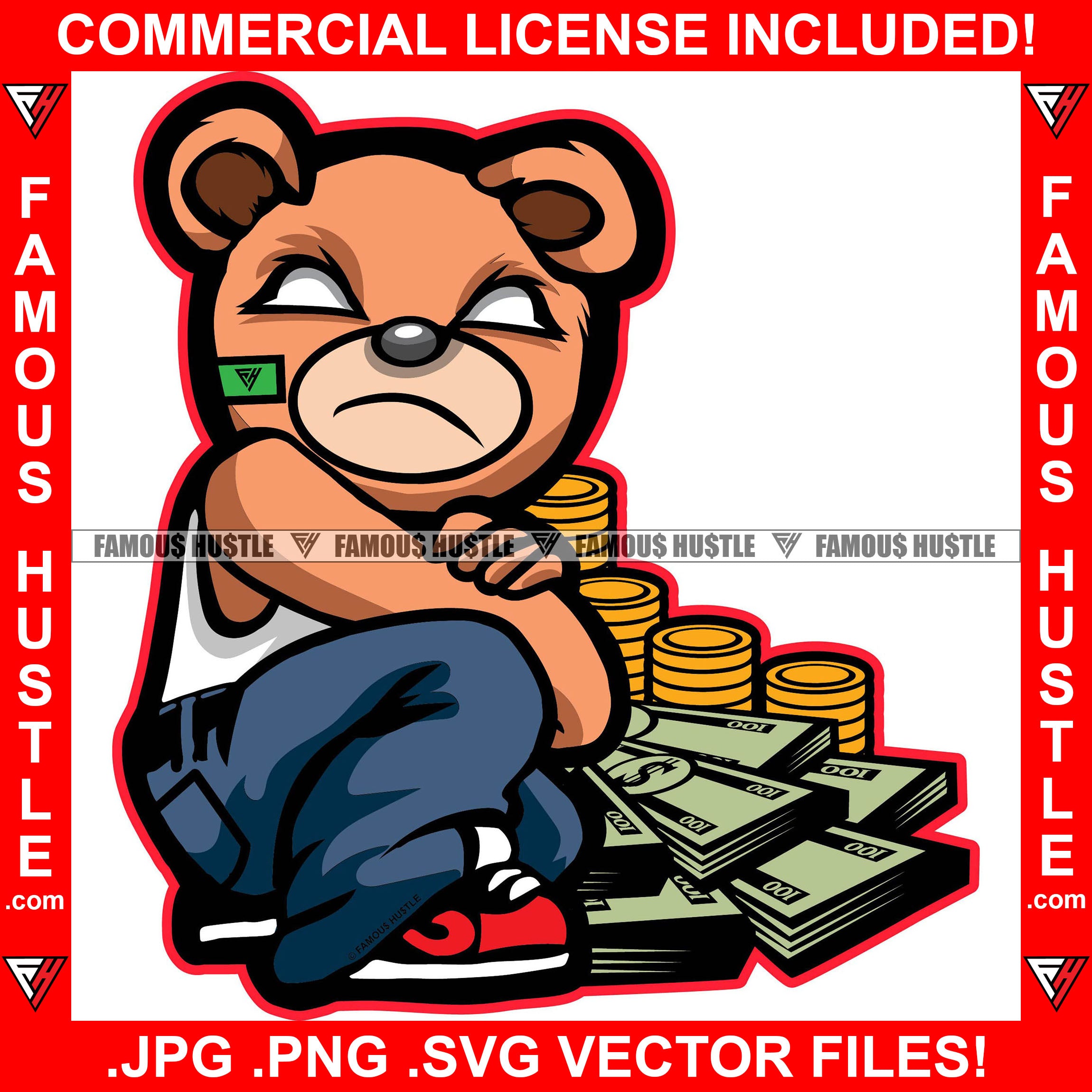 The Hustle Dont Sleep Gangster Teddy Bear Scar Face White Eyes Mean Face Cash Money Gold Coins Hip Hop Rap Plug Hustling Trap Trapper Art Graphic Design Logo T-Shirt Print Printing JPG PNG SVG Vector Cut File