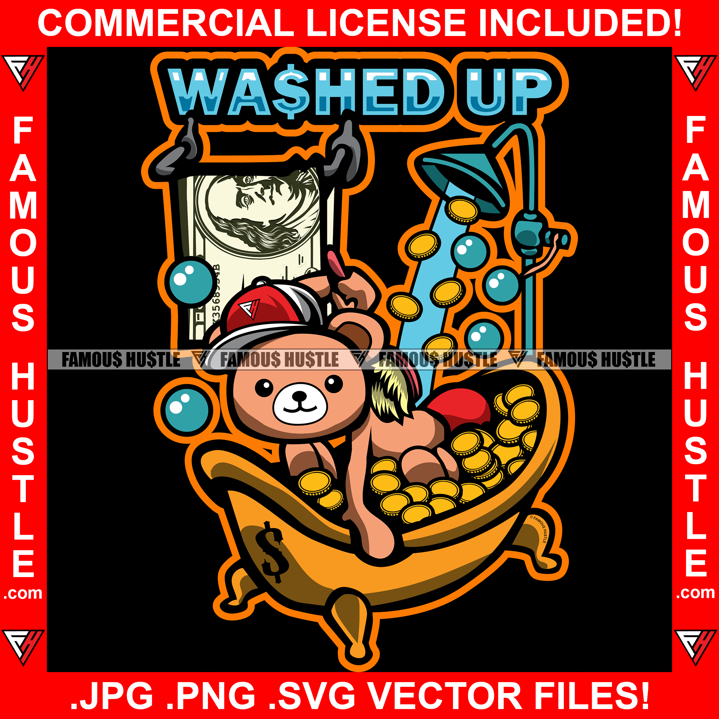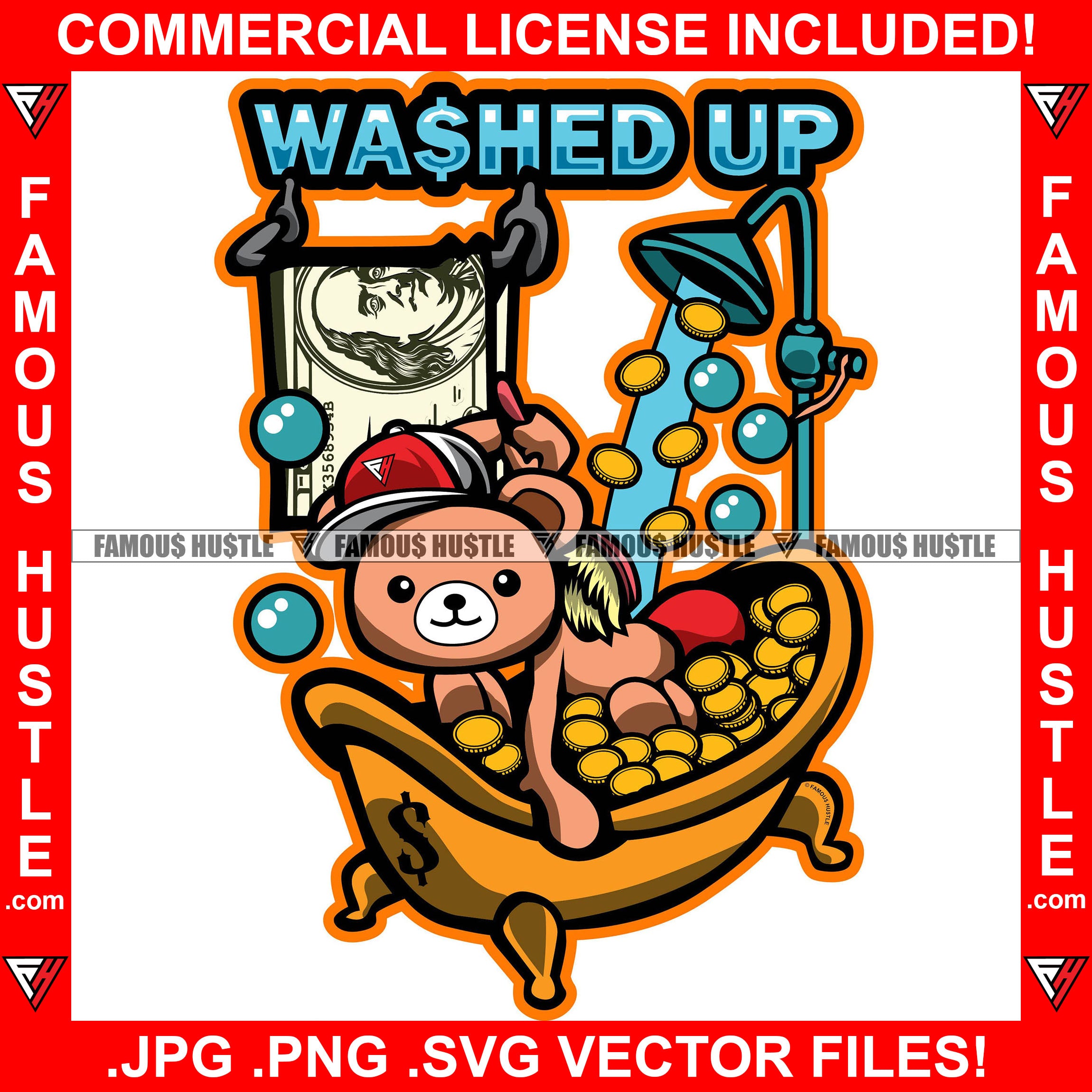 Washed Up Famous Hustle Cute Teddy Bear Shower With Gold Coins Tub Cash Money Towel Rich Hat Hip Hop Cap Rap Rich Trap Ghetto Swag Thug Boss Gangsta Hustler Quote Art Graphic Design Logo T-Shirt Print Printing JPG PNG SVG Vector Cut File