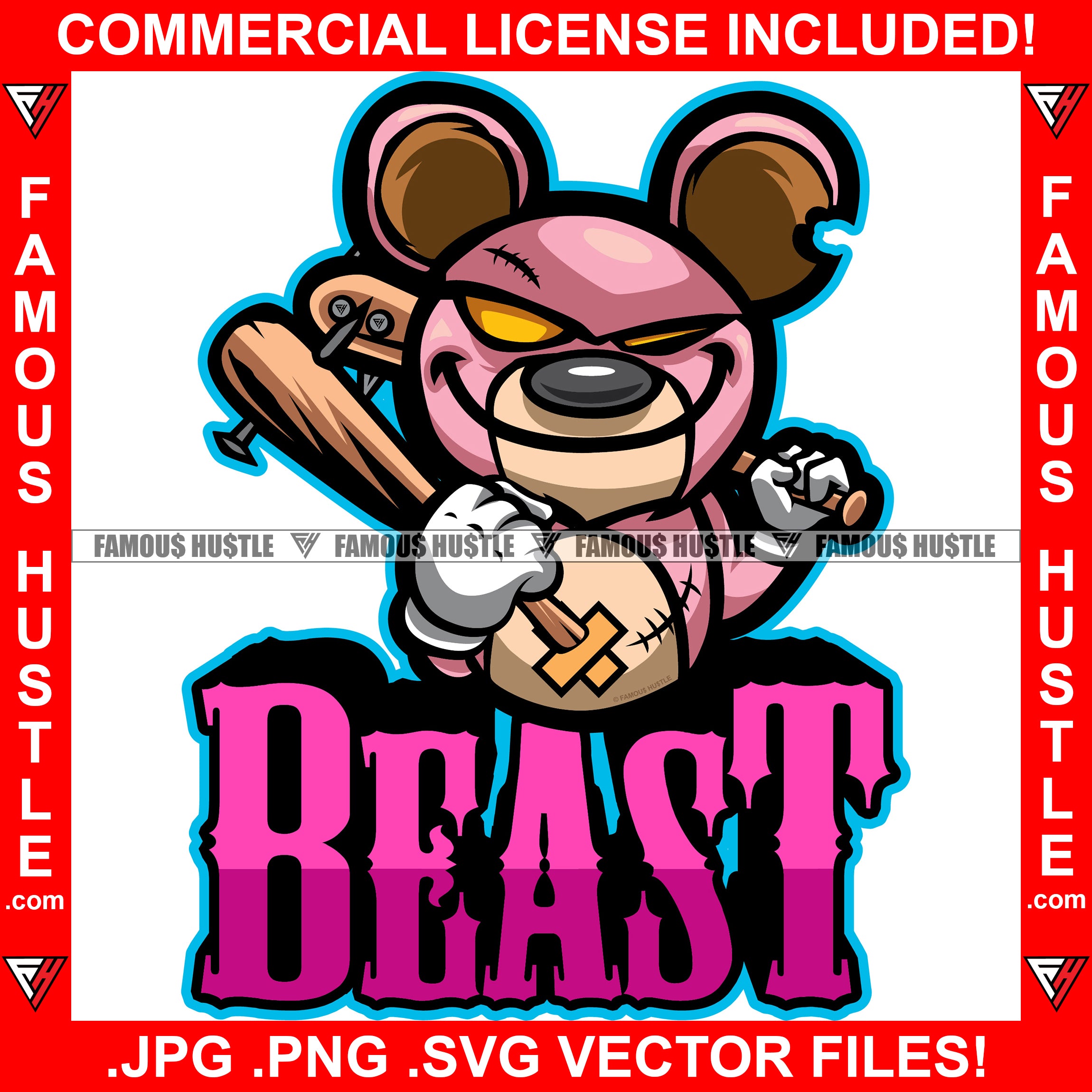 Beast Teddy Bear Scar Mean Face Yellow Eyes Stitches Baseball Bat Hip Hop Rap Rapper Plug Trap Street Hood Ghetto Swag Thug Hustler Hustling Famous Hustle Baller Trapper Quote Art Graphic Design Logo T-Shirt Print Printing JPG PNG SVG Vector Cut File