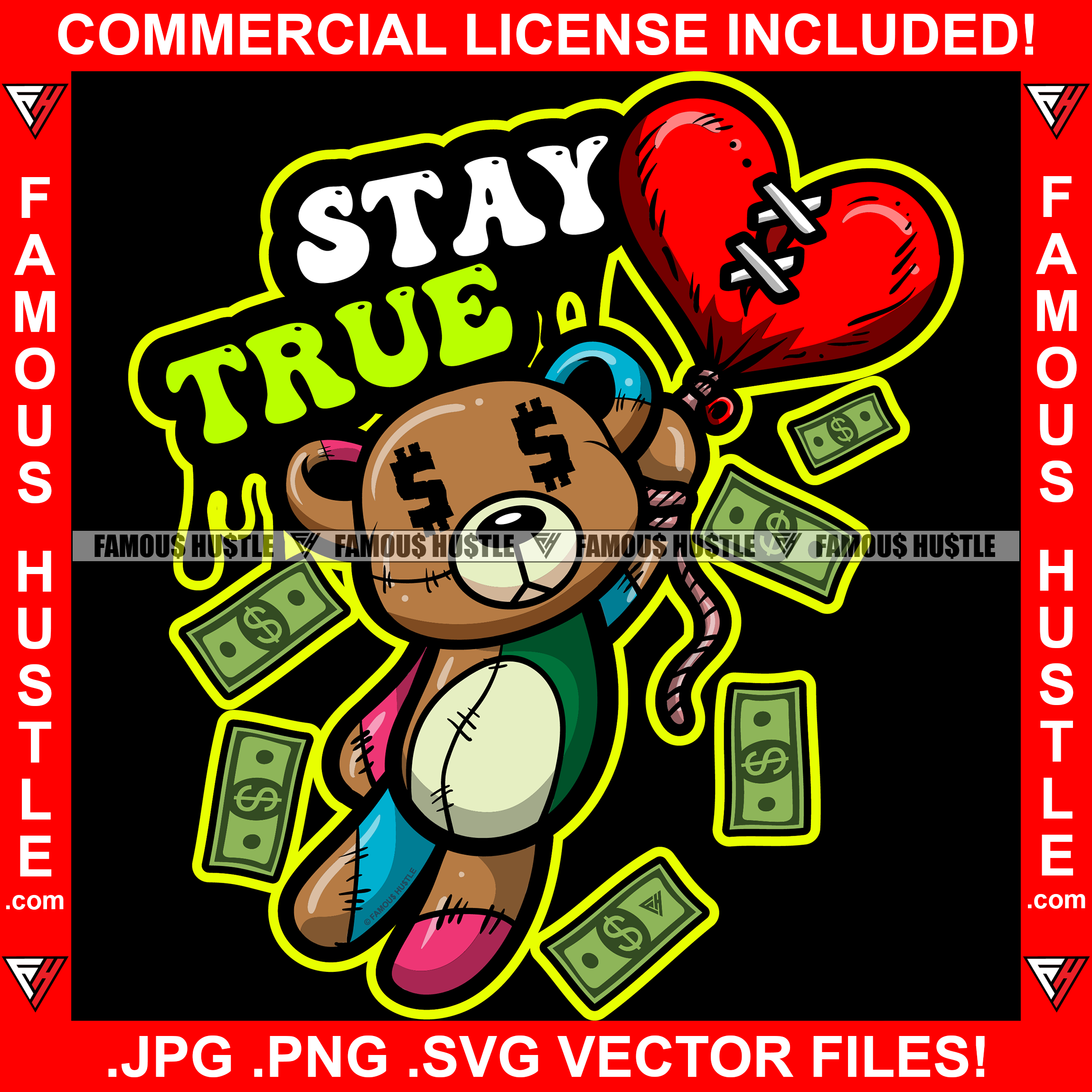 Stay True Teddy Bear Dollar Sign Eyes Red Heart Stitched Balloon Cash Money Falling Hip Hop Rap Plug Trap Street Hood Ghetto Swag Thug Hustling Famous Hustle Baller Trapper Quote Art Graphic Design Logo T-Shirt Print Printing JPG PNG SVG Vector Cut File