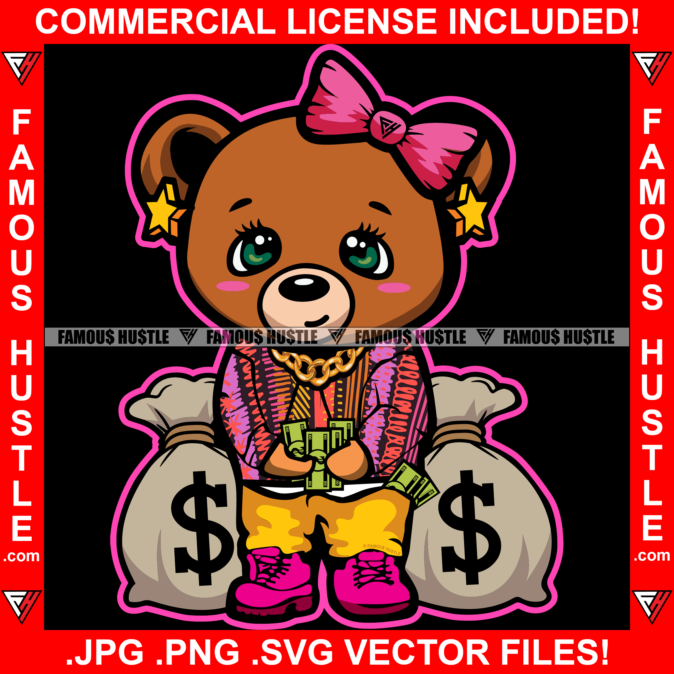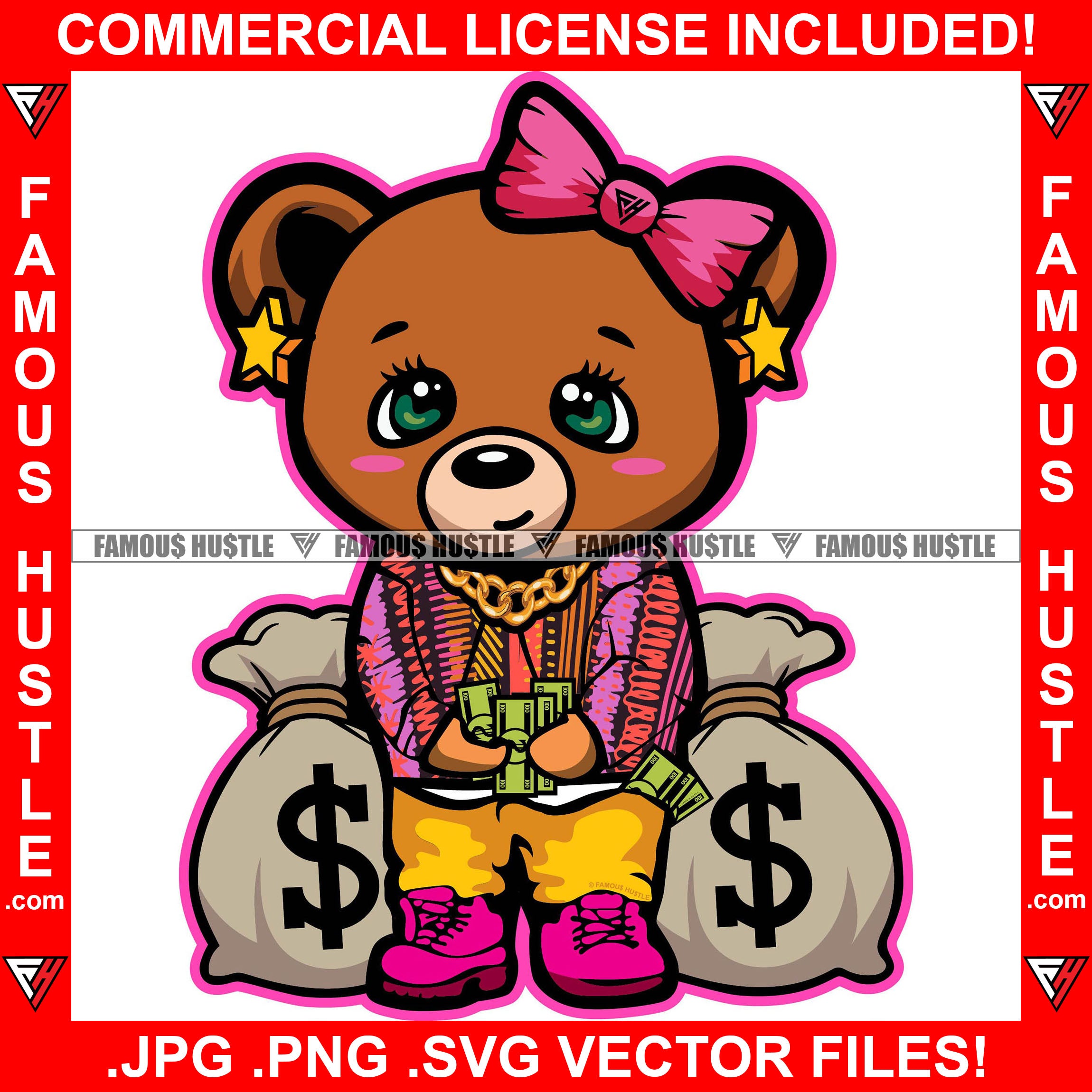 Talk Less Smile More Cute Famous Hustle Gangster Female Teddy Bear Woman Counting Money Cash Bags Gold Jewelry Pink Bow Hip Hop Rap Trap Street Girl Hood Lady Baller Art Graphic Design Logo T-Shirt Print Printing JPG PNG SVG Vector Cut File