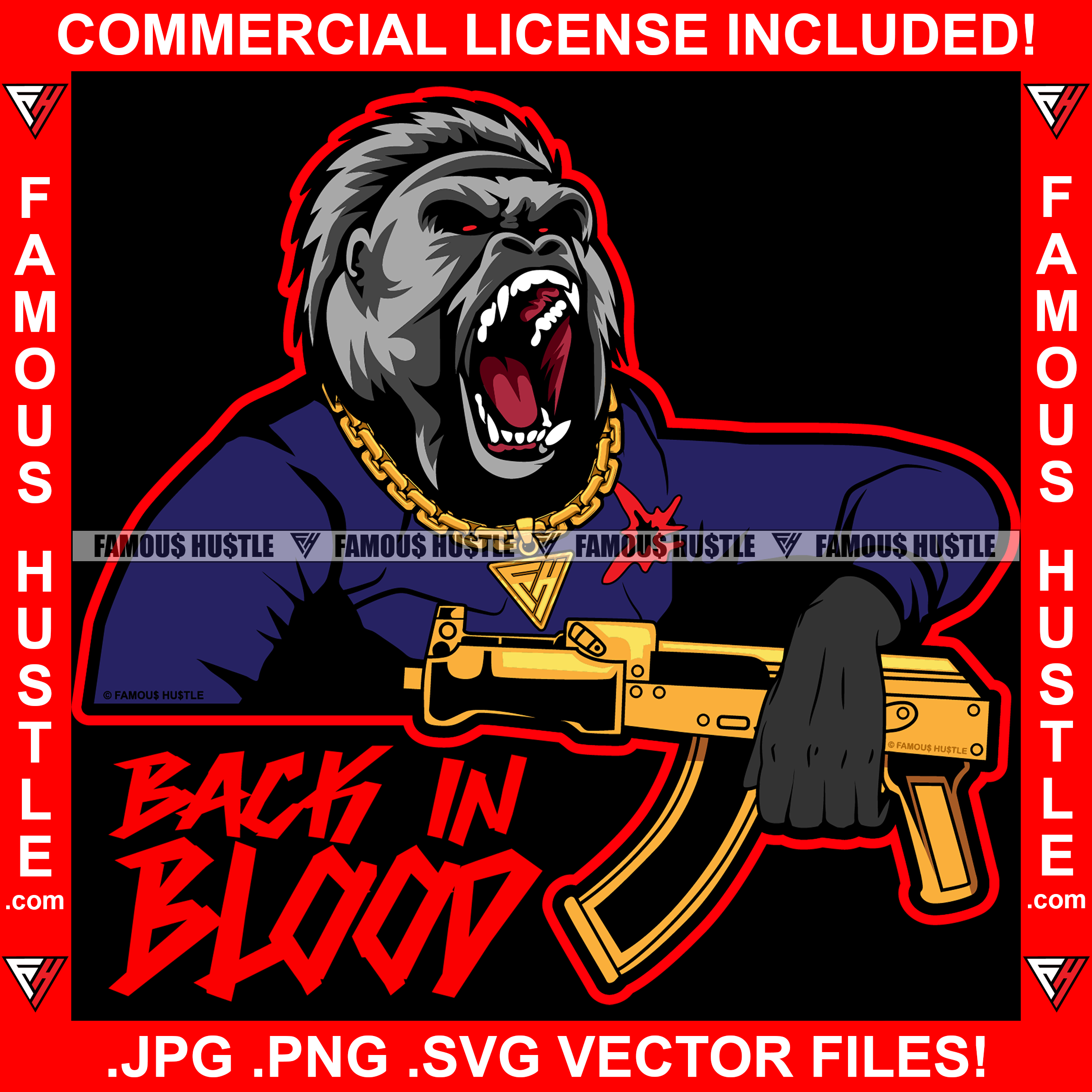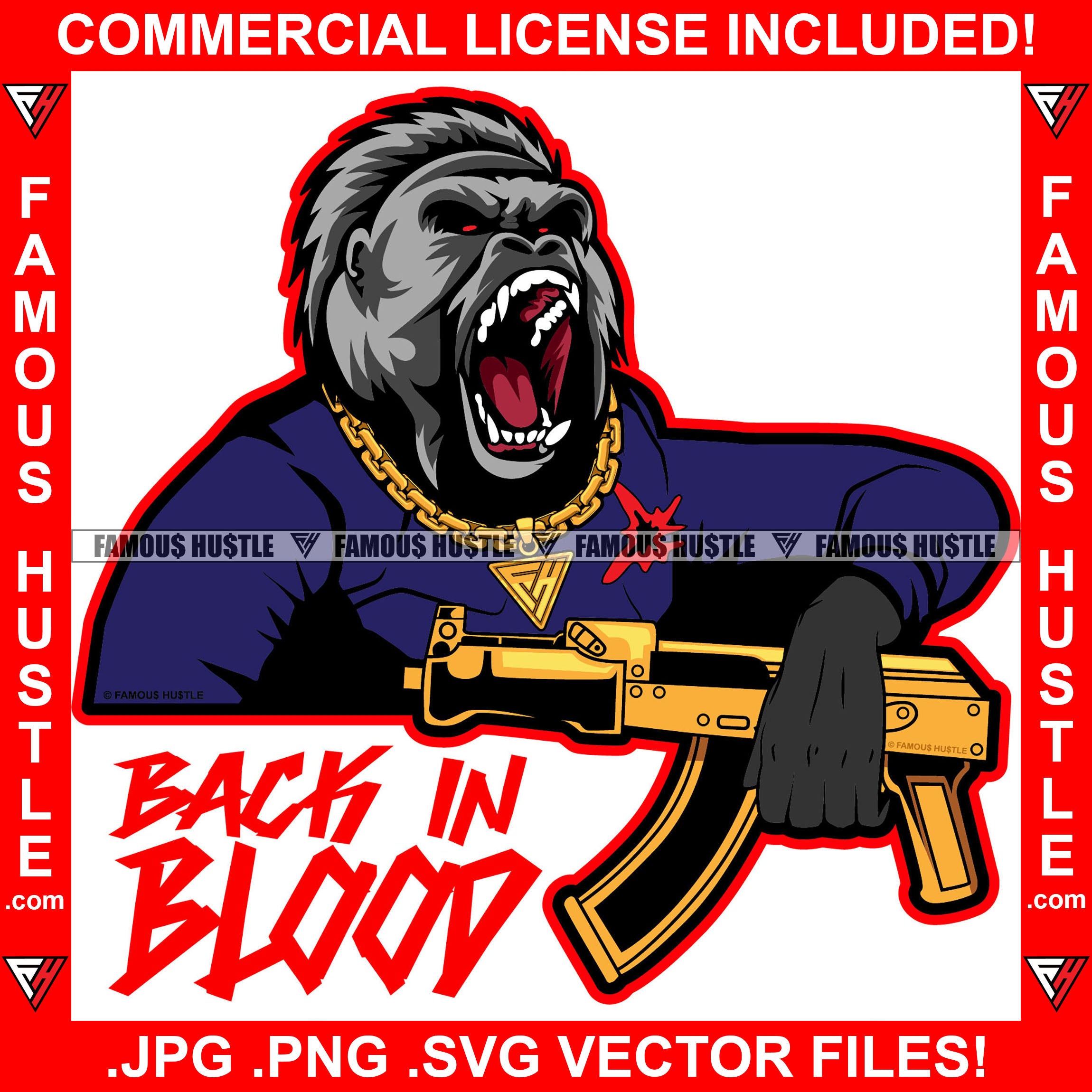 Back In Blood Gangster Gorilla Growling Ape Gold Jewelry Machine Gun Hip Hop Rap Rapper Plug Trap Street Hood Ghetto Swag Thug Hustler Hustling Famous Hustle Baller Trapper Quote Art Graphic Design Logo T-Shirt Print Printing JPG PNG SVG Vector Cut File