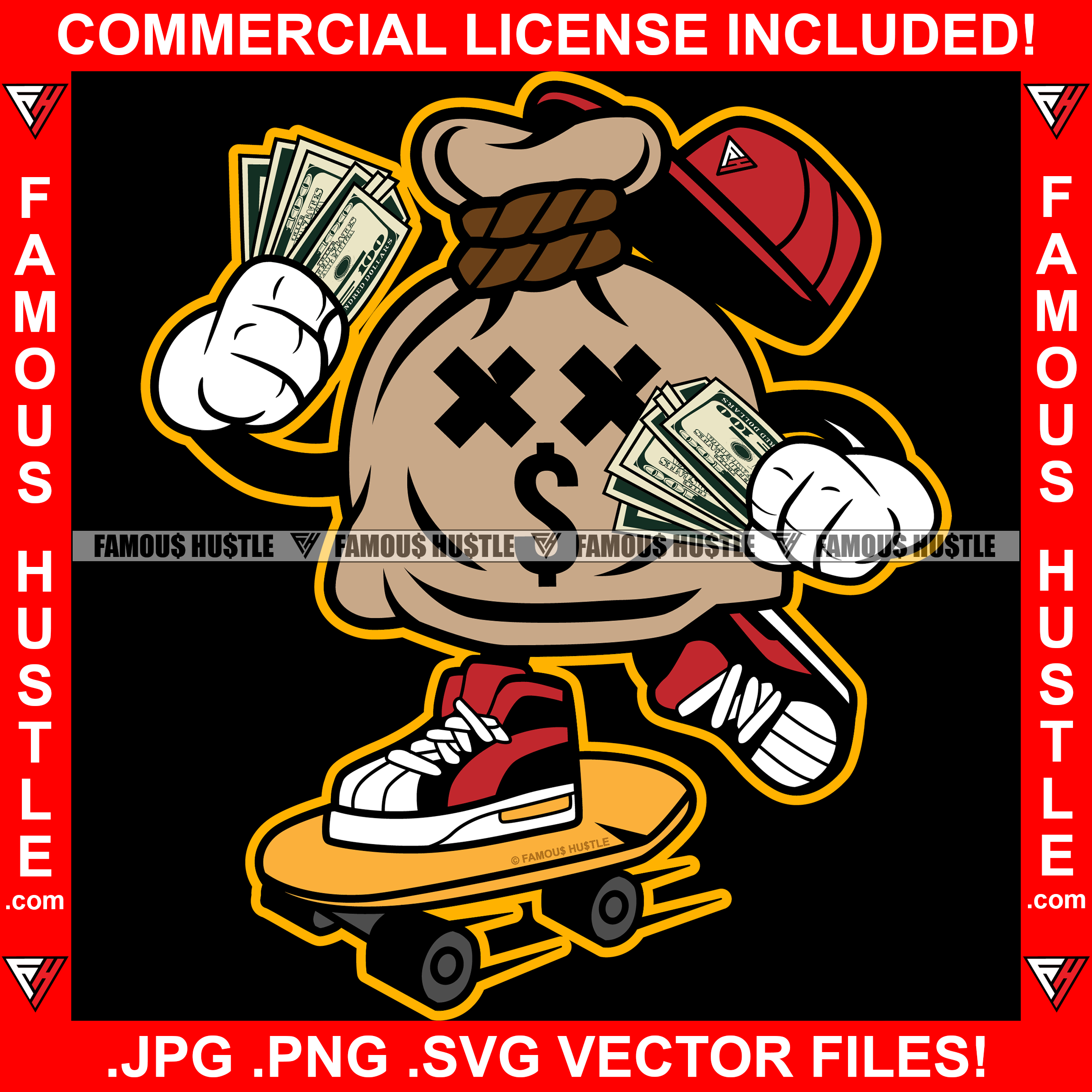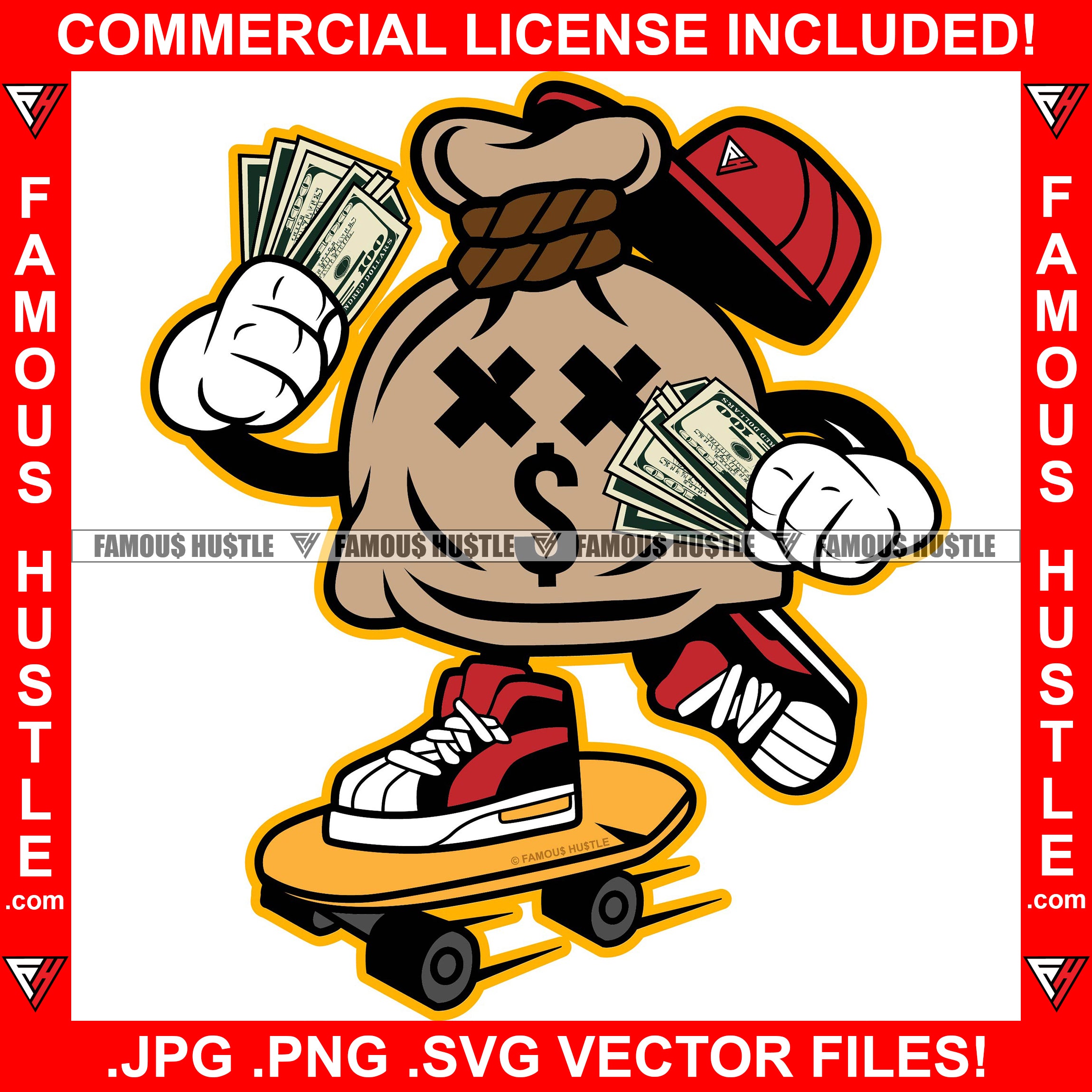 Bag Cash Money Bag Cross Eyes Dollar Sign Skating Cap Cash Money Sneakers Hip Hop Rap Rapper Plug Trap Street Hood Ghetto Swag Thug Hustler Hustling Famous Hustle Baller Trapper Art Graphic Design Logo T-Shirt Print Printing JPG PNG SVG Vector Cut File