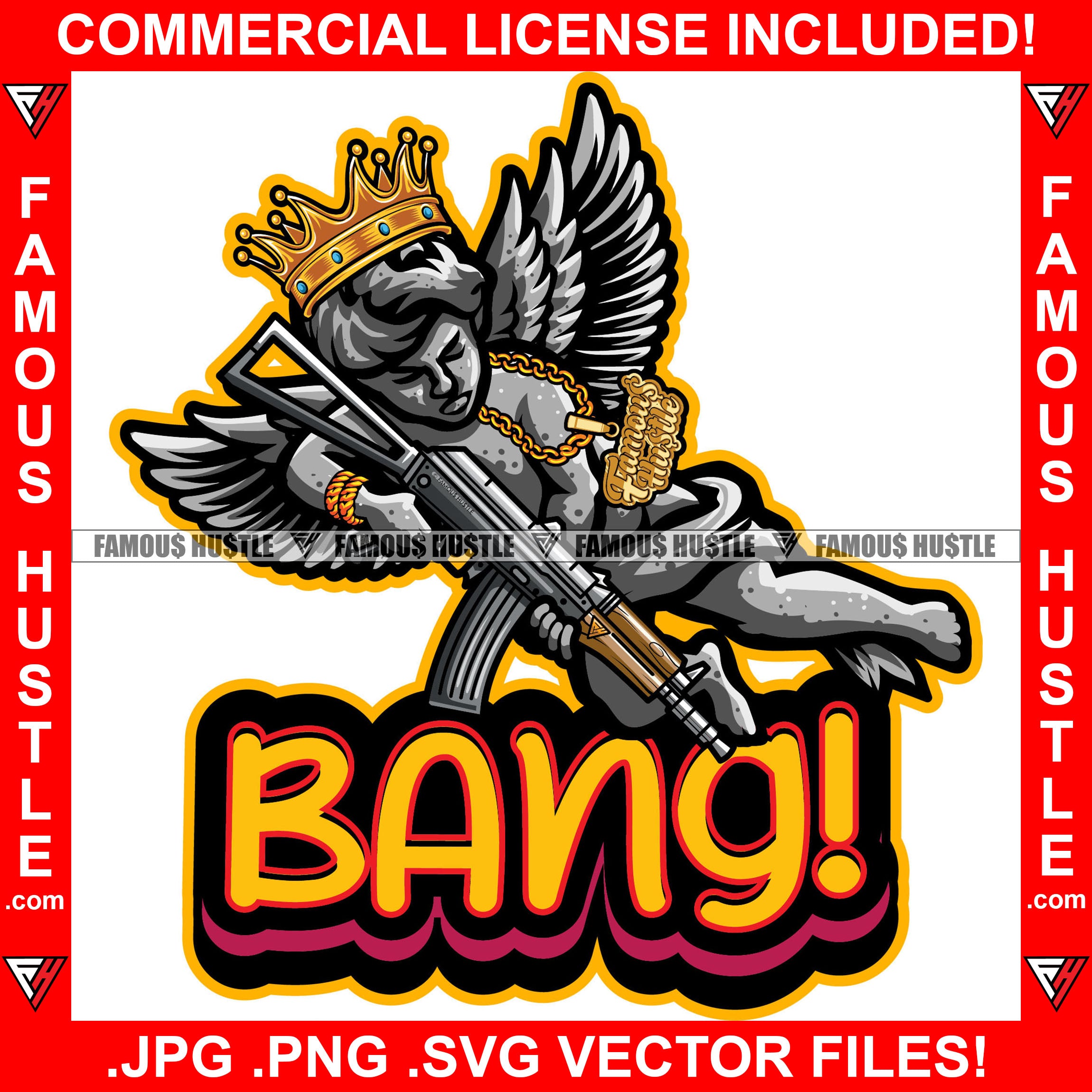Bang! King Street Demon Famous Hustle Gangster Black Angel Wings Statue Machine Gun Gold Jewelry Firing Bullets Hip Hop Rap Street Designer Fashion Hustler Pinup Pin Up Quote Art Graphic Design Print Printing Vector SVG Cut File
