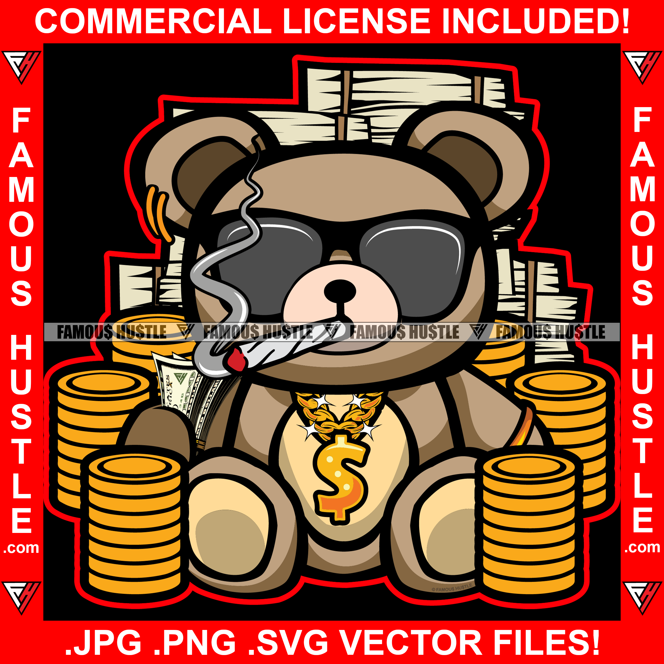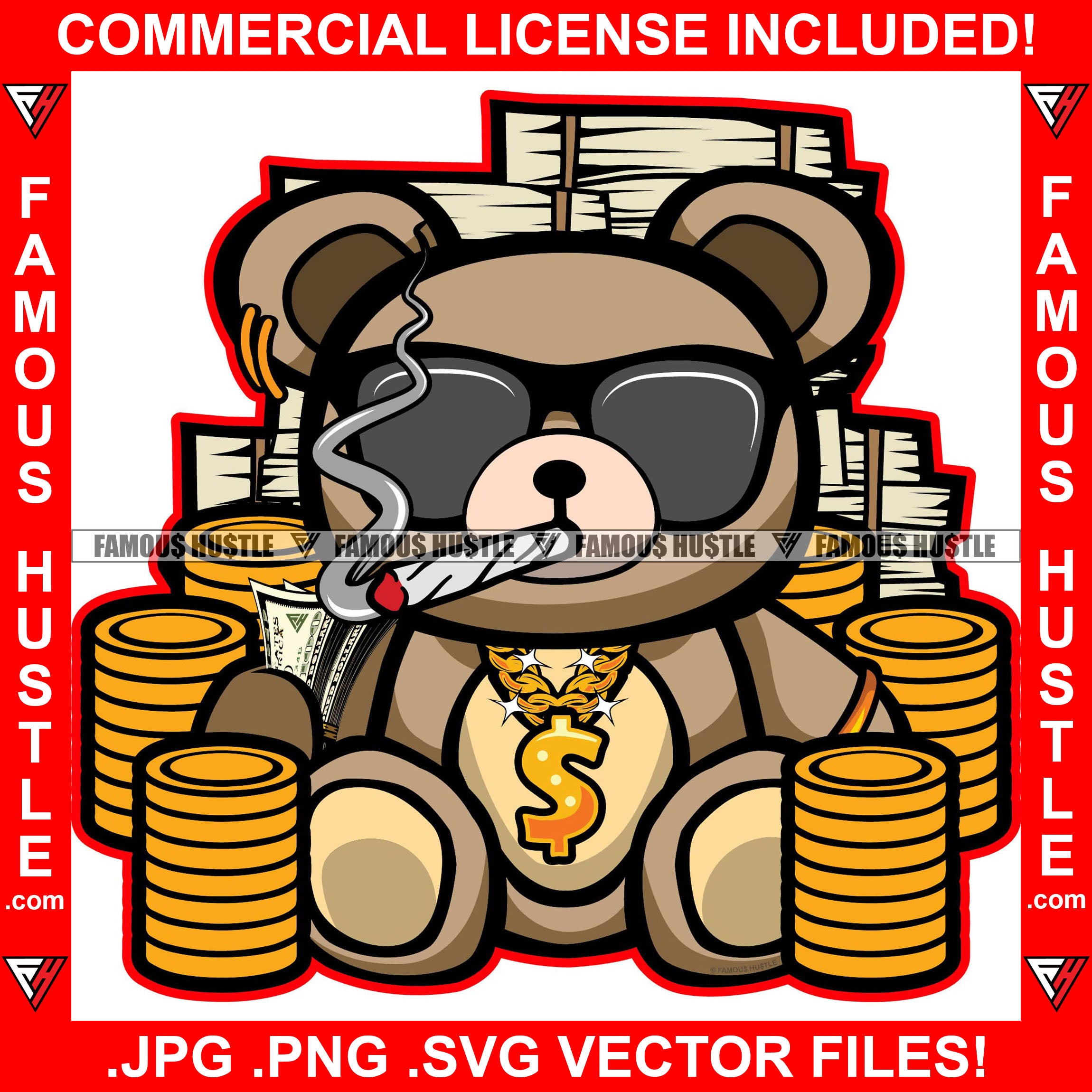 Big Dreams Cute Teddy Bear Black Glasses Gold Dollar Sign Necklace Coins Cash Money Stacks Cigar Smoking Hip Hop Rap Rapper Plug Trap Street Hood Famous Hustle Baller Trapper Art Graphic Design Logo T-Shirt Print Printing JPG PNG SVG Vector Cut File