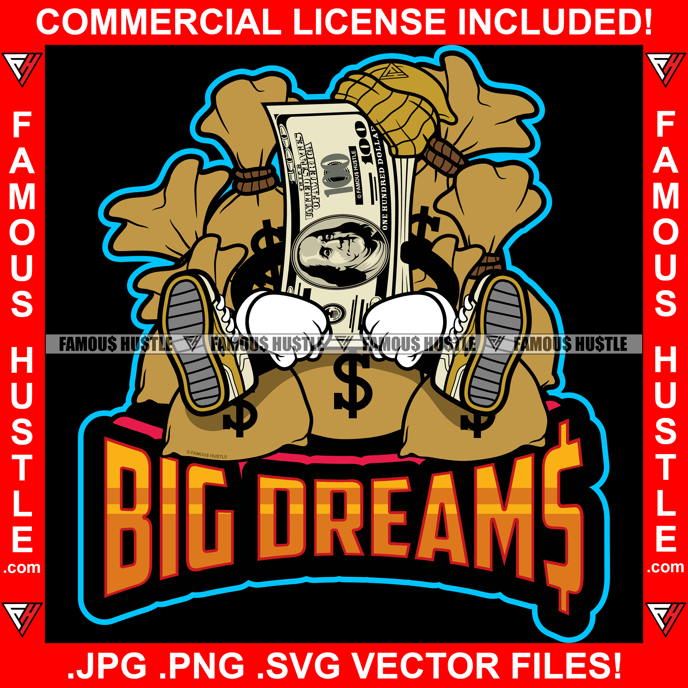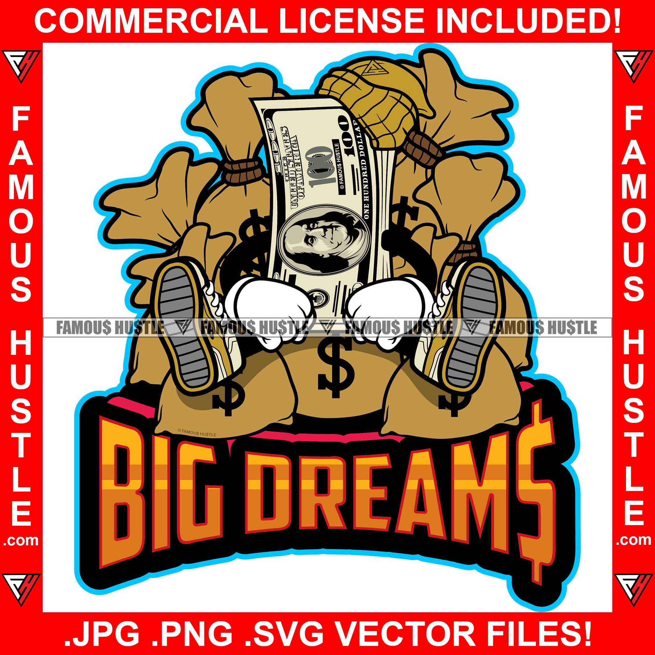 Big Dreams Gangster 100 Dollar Bill Money Sitting On Bags Cap Sneakers Hip Hop Rap Rapper Plug Trap Street Hood Ghetto Swag Thug Hustler Hustling Famous Hustle Baller Trapper Quote Art Graphic Design Logo T-Shirt Print Printing JPG PNG SVG Vector Cut File