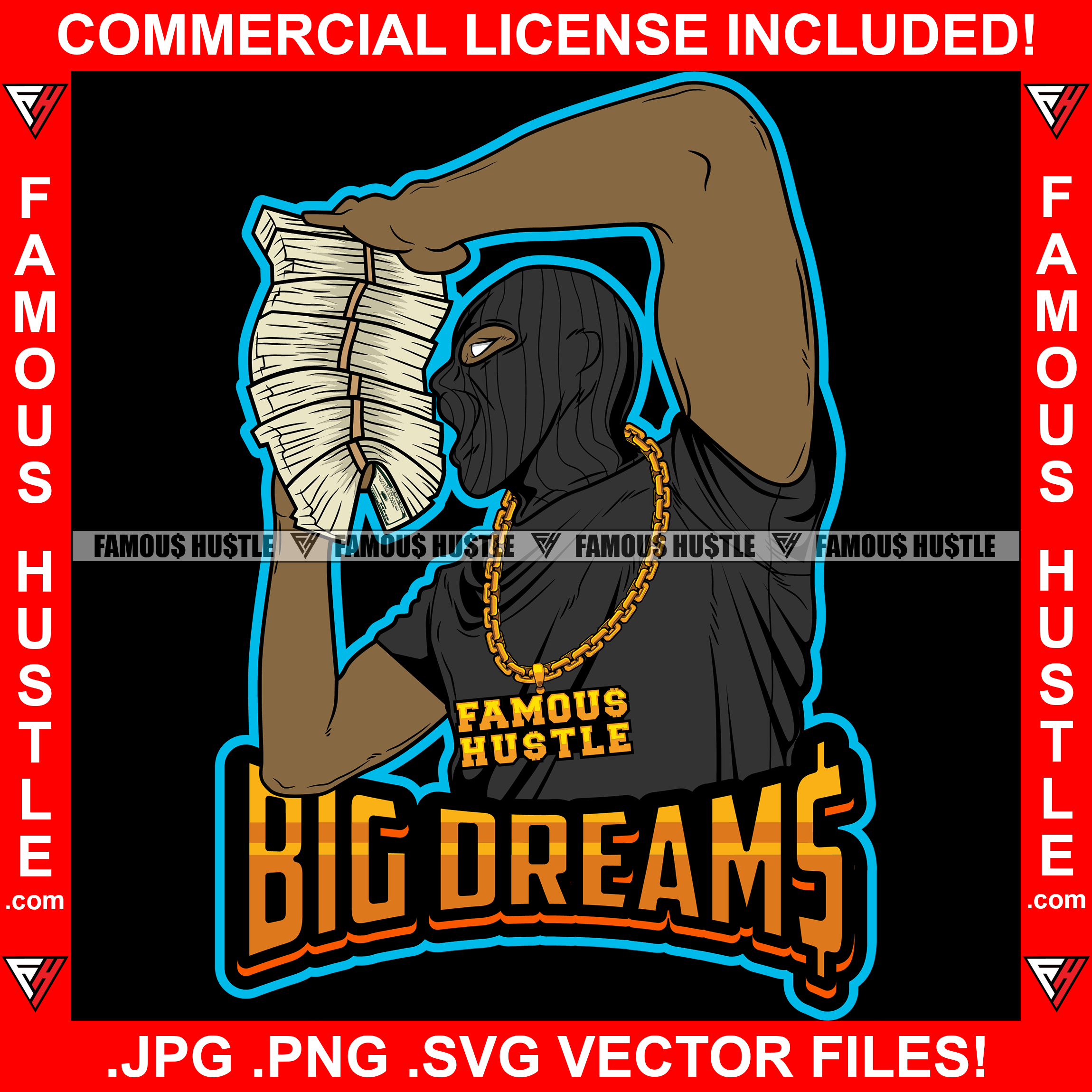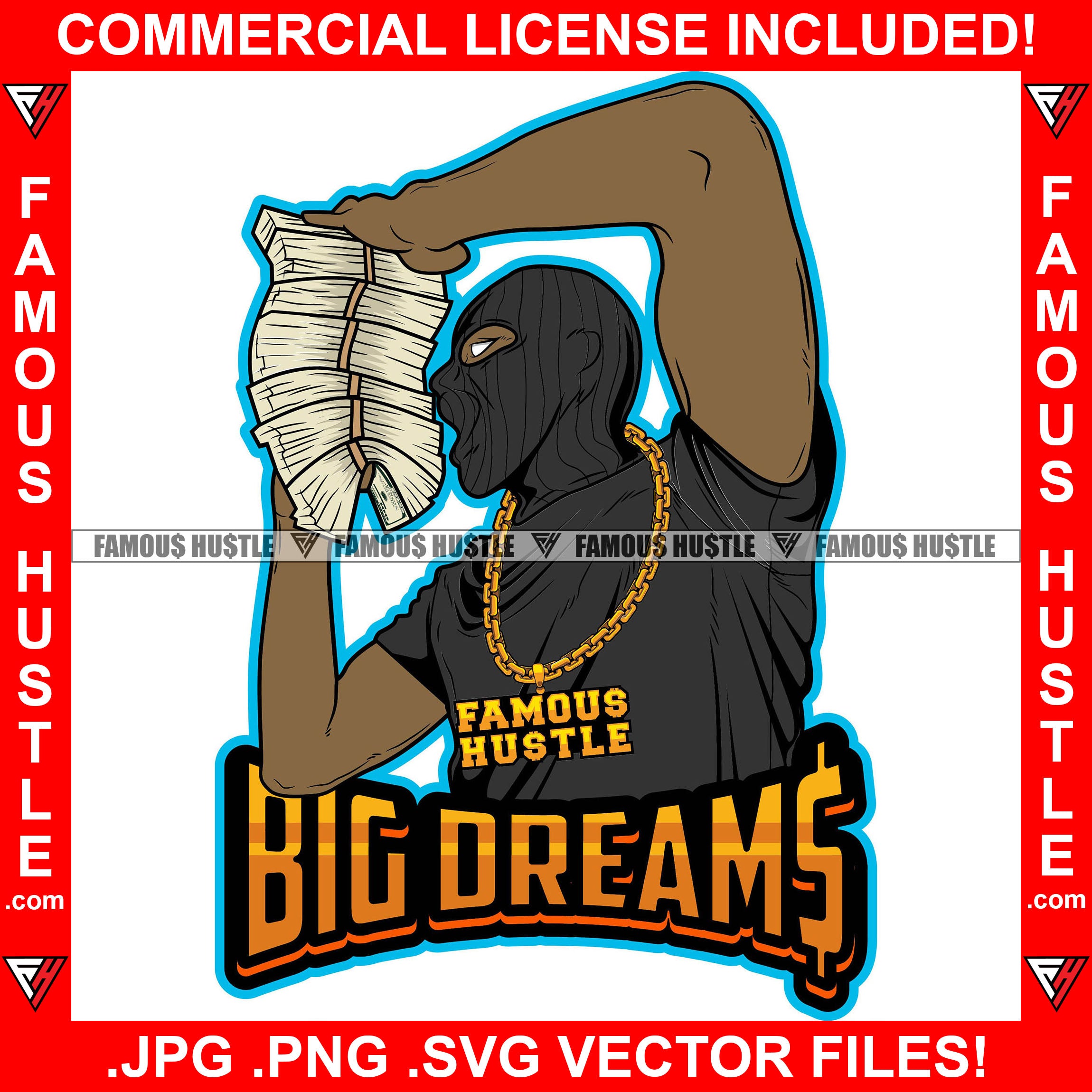 Big Dreams Gangster Black Man Ski Mask Money Stack Gold Necklace Hip Hop Rap Rapper Plug Trap Street Hood Ghetto Swag Thug Hustler Hustling Famous Hustle Baller Trapper Quote Art Graphic Design Logo T-Shirt Print Printing JPG PNG SVG Vector Cut File