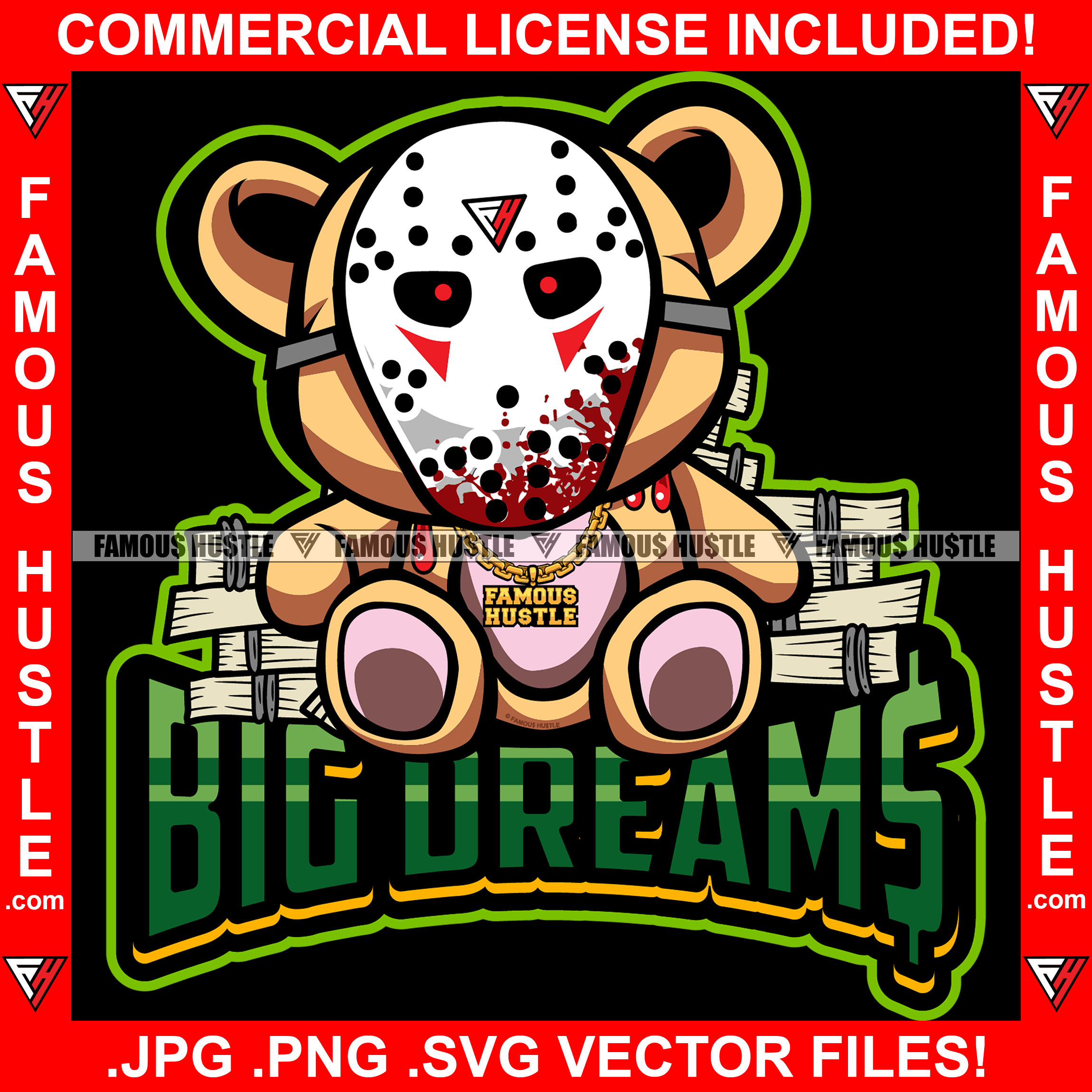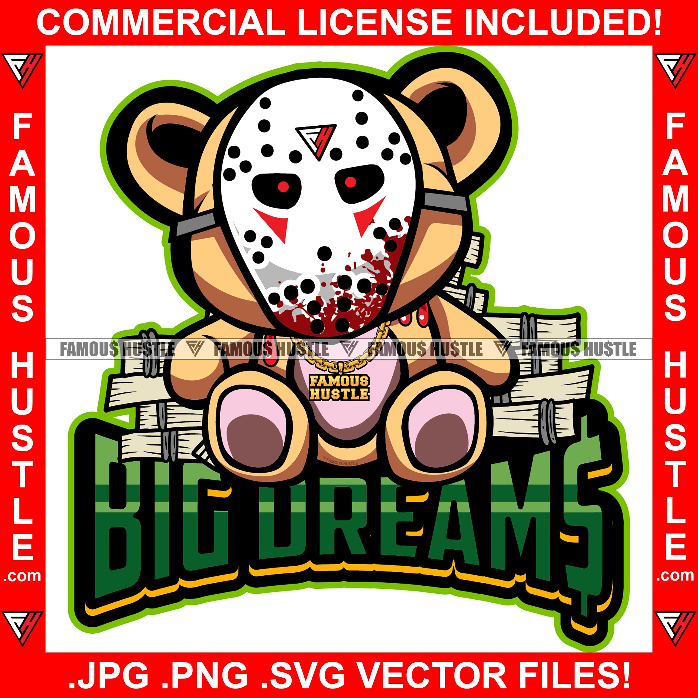 Big Dreams Gangster Killer Teddy Bear Hockey Mask Blood Dripping Gold Jewelry Cash Bundles Hip Hop Rap Plug Trap Street Hood Ghetto Swag Thug Famous Hustle Baller Trapper Quote Art Graphic Design Logo T-Shirt Print Printing JPG PNG SVG Vector Cut File